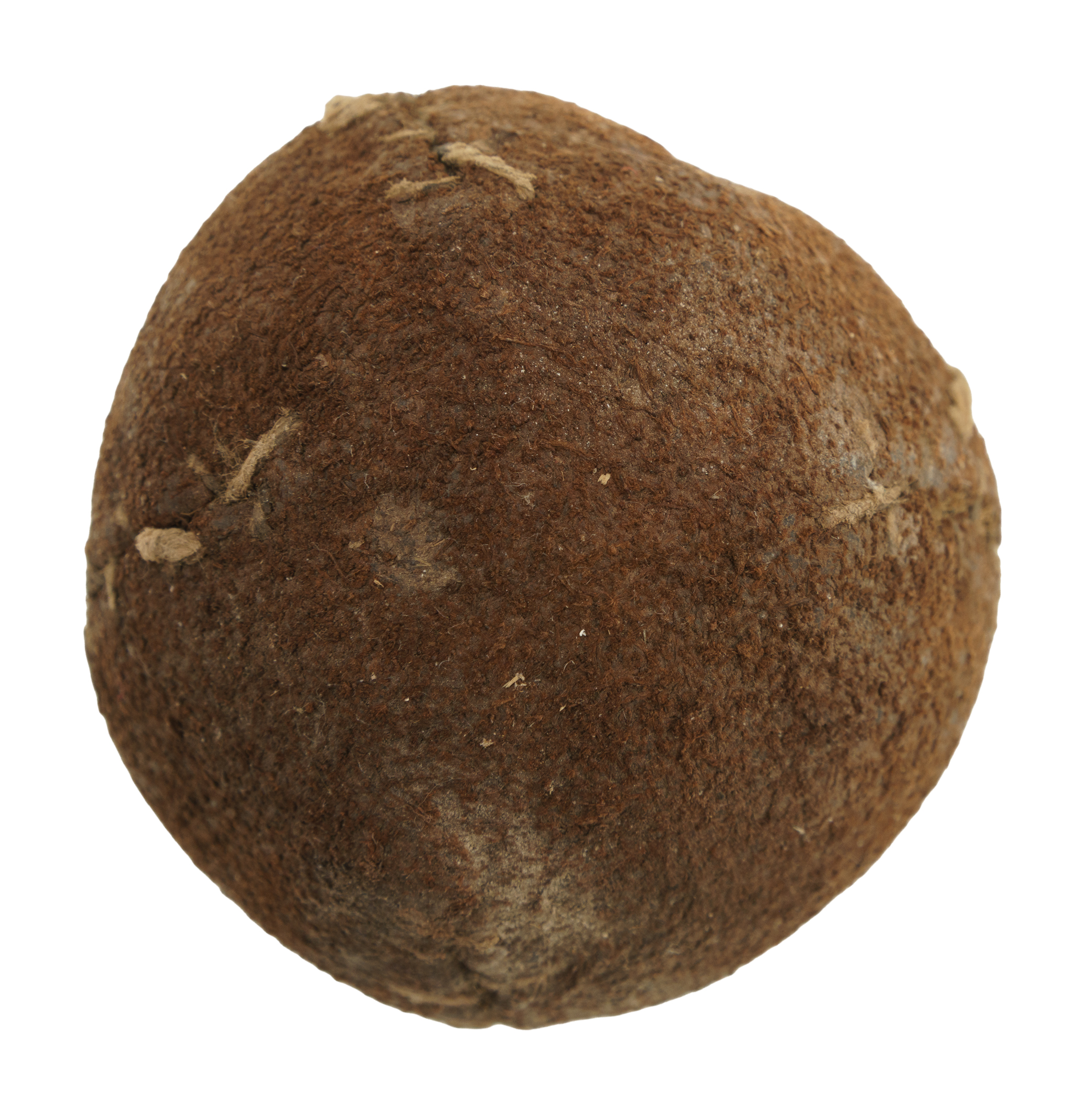 Early lemon peel ball, so named because its stitch pattern mimics the cuts used to peel a lemon. This ball features the classic lemon-peel design and is constructed of a single piece of leather, with the stitches meeting together at a single point along the top. Although this ball was constructed during the earliest days of our national pastime, it might well have been used to play any number of ball and/or bat games, including but not exclusively limited to baseball, rounders, and "one o' cat." This ball, which appears to be handmade, weighs 2.4 ounces and measures approximately 8 inches in circumference. In the late 1850s, the National Association of Baseball Players changed the standard specifications of a regulation ball. The new rules required that the baseball weigh 6.25 ounces (up from the previous standard of 5.5 ounces) and have a circumference of 10.25 inches (as opposed to the earlier measurement of 9 inches). The fact that this ball is much smaller and lighter than either of those earlier specifications indicates that it most likely dates to an earlier time period, when ball and bat games were still the domain of children. The ball has heavy wear with substantial crazing to the surface and abrasions throughout. The stitching is mostly tight and intact. Fair condition overall.