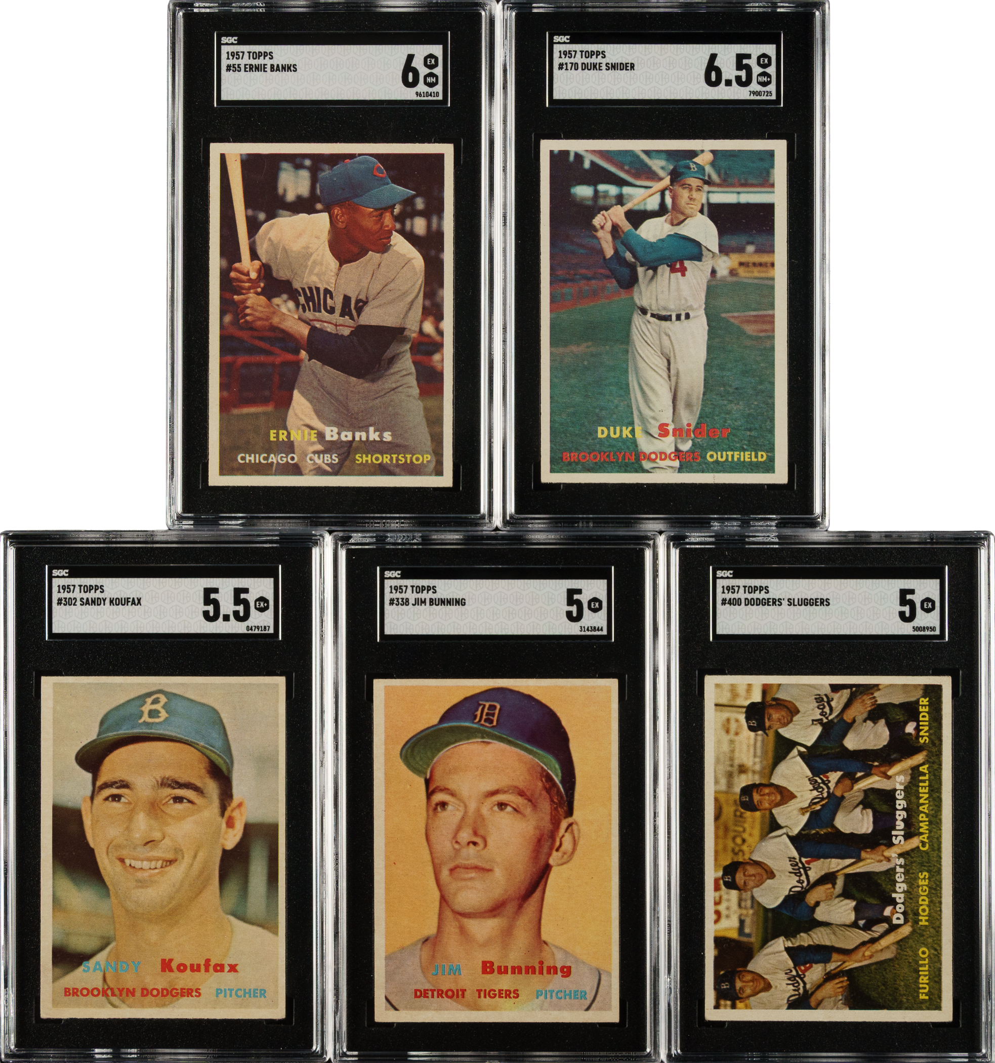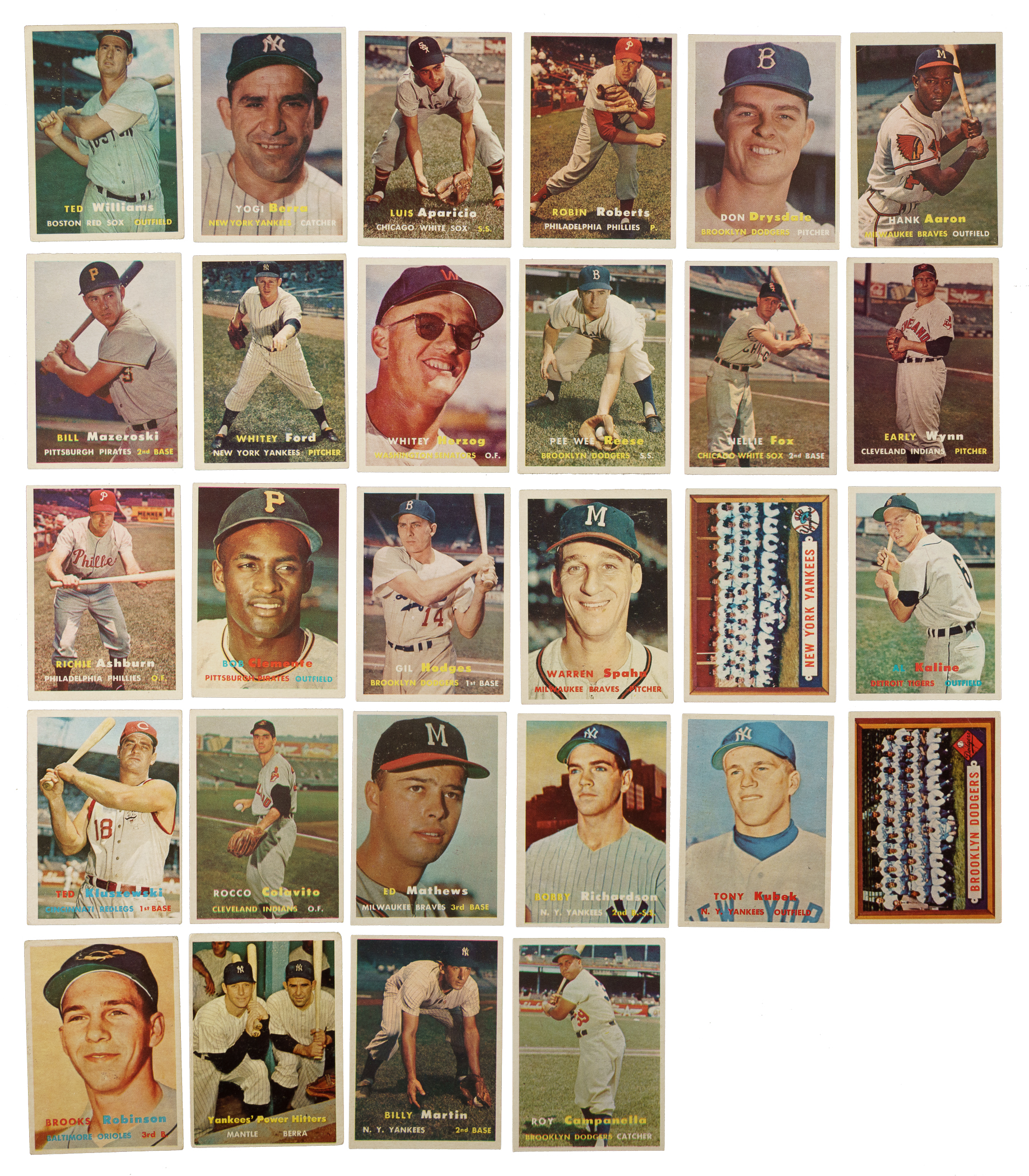 This is a very attractive mid-grade complete set of the classic 1957 Topps issue. Highlighted by the rookie cards of Don Drysdale, Frank Robinson, and Brooks Robinson, the 1957 Topps set includes many additional key star cards, among them Ted Williams and Mickey Mantle. Condition is 9% Ex-Mt to Nr/Mt, 64% Vg-Ex to Ex, and 27% Gd to Vg (including a few lesser and one with a slight trim). We have selected eight cards for grading and encapsulation by SGC. Keys: #1 T. Williams (Vg), 2 Berra (Vg-Ex), 7 Aparicio (Ex), 10 Mays (EX+ 5.5), 15 Roberts (Ex), 18 Drysdale RC (100/0 centering on reverse, otherwise Ex-Mt), 20 Aaron (95/5 T/B, otherwise Ex), 24 Mazeroski RC (Ex), 25 Ford (Vg-Ex), 29 Herzog RC (Ex-Mt), 30 Reese (Vg), 35 F. Robinson RC (EX 5), 38 Fox (Nr/Mt), 40 Wynn (Vg), 55 Banks (EX/NM 6), 62 Martin (Ex+), 70 Ashburn (Ex+), 76 Clemente (Vg), 80 Hodges (Ex), 90 Spahn (Ex), 95 Mantle (EX/NM 6), 97 Yankees Team (Vg-Ex), 125 Kaline (Vg-Ex), 165 Kluszewski (Vg+), 170 Snider (EX/NM+ 6.5), 210 Campanella (Vg-Ex+), 212 Colavito RC (Vg-Ex), 250 Mathews (Vg-Ex), 286 Richardson RC (Vg-Ex), 302 Koufax (EX+ 5.5), 312 Kubek RC (Vg-Ex+), 324 Dodgers Team (Gd+), 328 B. Robinson RC (pencil mark on reverse, otherwise Vg), 338 Bunning RC (EX 5), 400 Dodgers' Sluggers (EX 5), and 407 Mantle/Berra (Vg). 1957 Topps have always been very popular due to their classic photographic style and inclusion of so many stars. Attractive mid-grade sets of classic issues from the 1950s such as this always generate tremendous collector interest. Total: 407 cards.