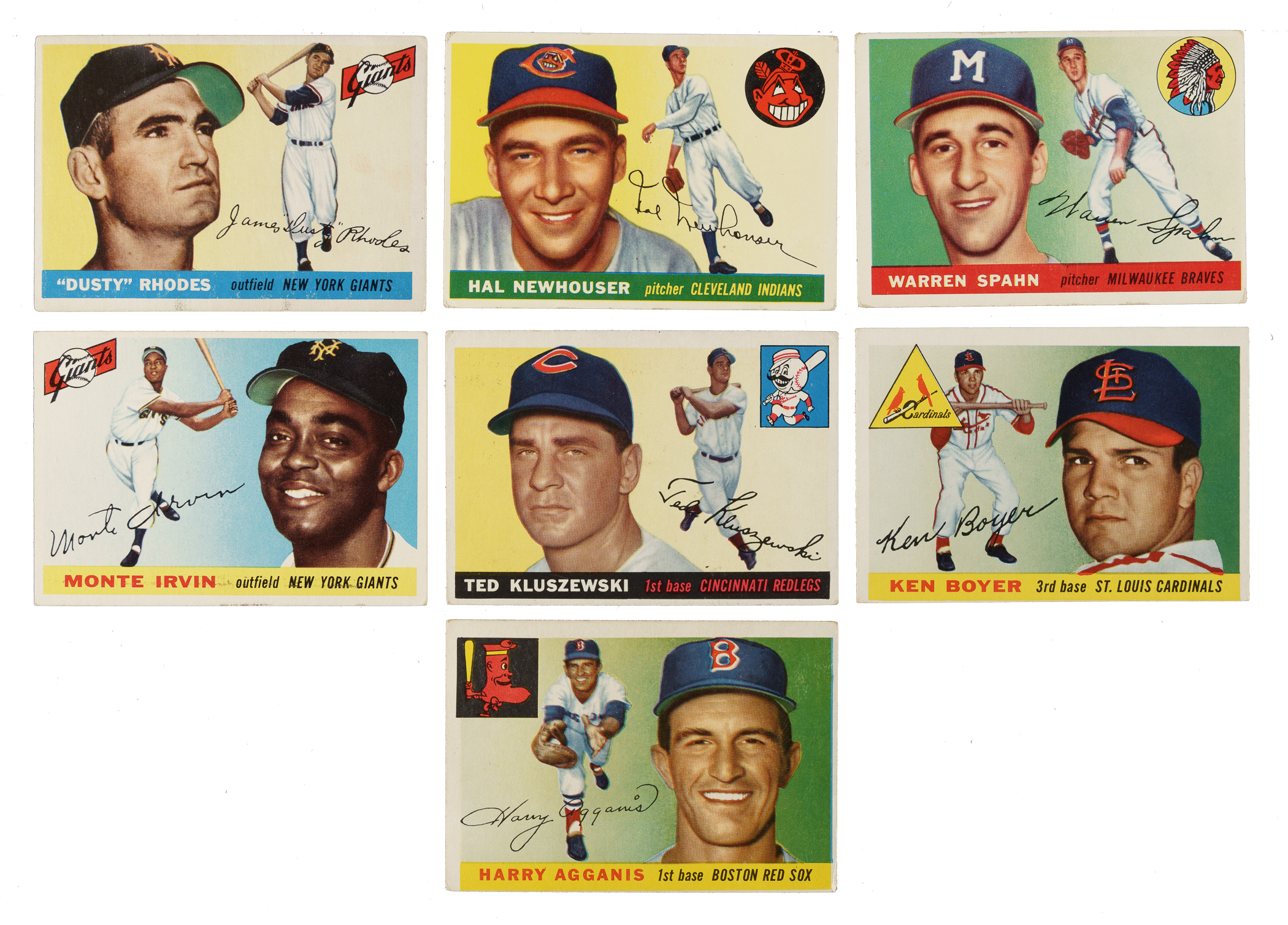 Collection of 152 different cards from the classic 1955 Topps set, highlighted by seven Hall of Famers, including Hank Aaron, Yogi Berra, and Harmon Killebrew (rookie). Condition is 9% Ex, 79% Vg to Vg-Ex, and 12% lesser. Keys: #1 Rhodes (Vg), 24 Newhouser (Vg), 31 Spahn (Vg), 47 Aaron (Vg+), 100 Irvin (Vg-Ex+), 120 Kluszewski (Vg), 124 Killebrew RC (Vg+), 125 Boyer RC (100/0 T/B, otherwise Vg-Ex+), 152 Agganis RC (98/2 T/B, otherwise Vg), 155 Mathews (Vg-Ex), and 198 Berra (100/0 T/B, otherwise Vg-Ex). Missing the following 54 cards for completion: #2 Williams, 4 Kaline, 10, 11, 12, 16, 20, 28 Banks, 34, 35, 38, 42, 45, 48, 50 Robinson, 51, 53, 55, 56, 57, 70, 76, 77, 102, 123 Koufax, 163, 164 Clemente, 165, 166, 167, 172, 173, 176, 179, 180, 181, 182, 183, 187 Hodges, 188, 189 Rizzuto, 191, 192, 194 Mays, 195, 196, 201, 202, 204, 205, 206, 207, 208, and 210 Snider. This is a very attractive and consistent mid-grade partial set of 1955 Topps, one of the most classic 1950s Topps series. Total: 152 cards.
