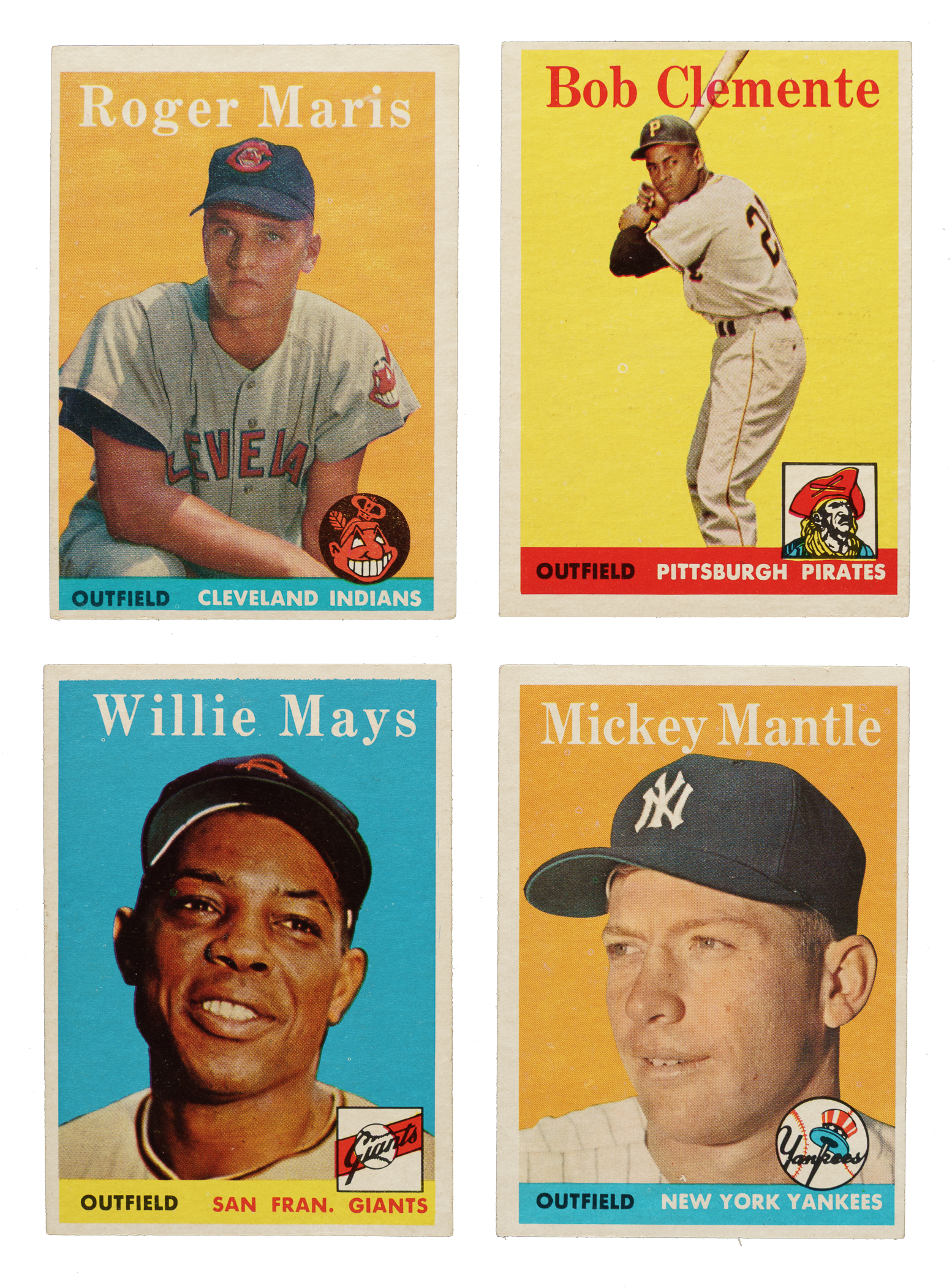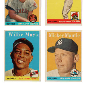 Presented is a near-complete set of 1958 Topps consisting of 461 different cards, out of 494 in the set. The classic 1958 Topps set features all the great stars of the era, in many cases more than once, as so many stars appear again on special multiplayer cards or in the All-Star series (#476-494). Condition is 5% Ex-Mt to Nr/Mt, 60% Vg-Ex to Ex, 30% Gd to Vg, and 5% lesser. Keys: #1 Williams (Fr), 5 Mays (Vg-Ex+), 25 Drysdale (15/85 T/B, otherwise Ex+), 30 Aaron (Ex), 47 Maris RC (Ex), 52 Clemente (Ex), 61a Johnson/yellow name (Vg), 88 Snider (Vg), 150 Mantle (Vg+), 162 Hodges (Vg-Ex+), 187 Koufax (Vg+), 246 Yankees Team (Vg-Ex), 285 F. Robinson (Ex), 288 Killebrew (Ex), 307 B. Robinson (85/15 T/B, otherwise Ex+), 310 Banks (Ex-Mt), 314 Snider/Alston (10/90 T/B, otherwise Ex), 320 Ford (Ex), 321 Williams/Klu (Ex), 343 Cepeda RC (Vg-Ex), 370 Berra (Ex+), 375 Reese (Vg-Ex), 377b Braves Team/numerical checklist (marked, otherwise Gd), 397b Tigers Team/numerical checklist (Vg), 408b Orioles Team/numerical checklist (Fr-Gd), 436 Mays/Snider (Vg+), 440 Mathews (Nr/Mt), 464 Flood RC (ink marks on reverse, otherwise Vg-Ex), 476 Musial AS (Vg-Ex), 485 T. Williams AS (Nr/Mt due to centering), 487 Mantle AS (Vg-Ex+), and 488 Aaron AS (Vg+). Missing the following thirty-three cards for completion: #19, 41, 43, 45, 62, 70 Kaline, 71 Dodgers Team, 96, 110, 116, 123, 142, 175, 213, 217, 240, 255, 264, 265, 270 Spahn, 271 Martin, 276, 280, 298, 299, 301, 305, 351 Braves' Fence Busters, 418 Mantle/Aaron, 446, 475, 486 Mays AS, and 489. Very attractive and mostly mid-grade near-complete set of this classic 1950s issue that is highlighted by so many Hall of Famers. Total: 461 cards.