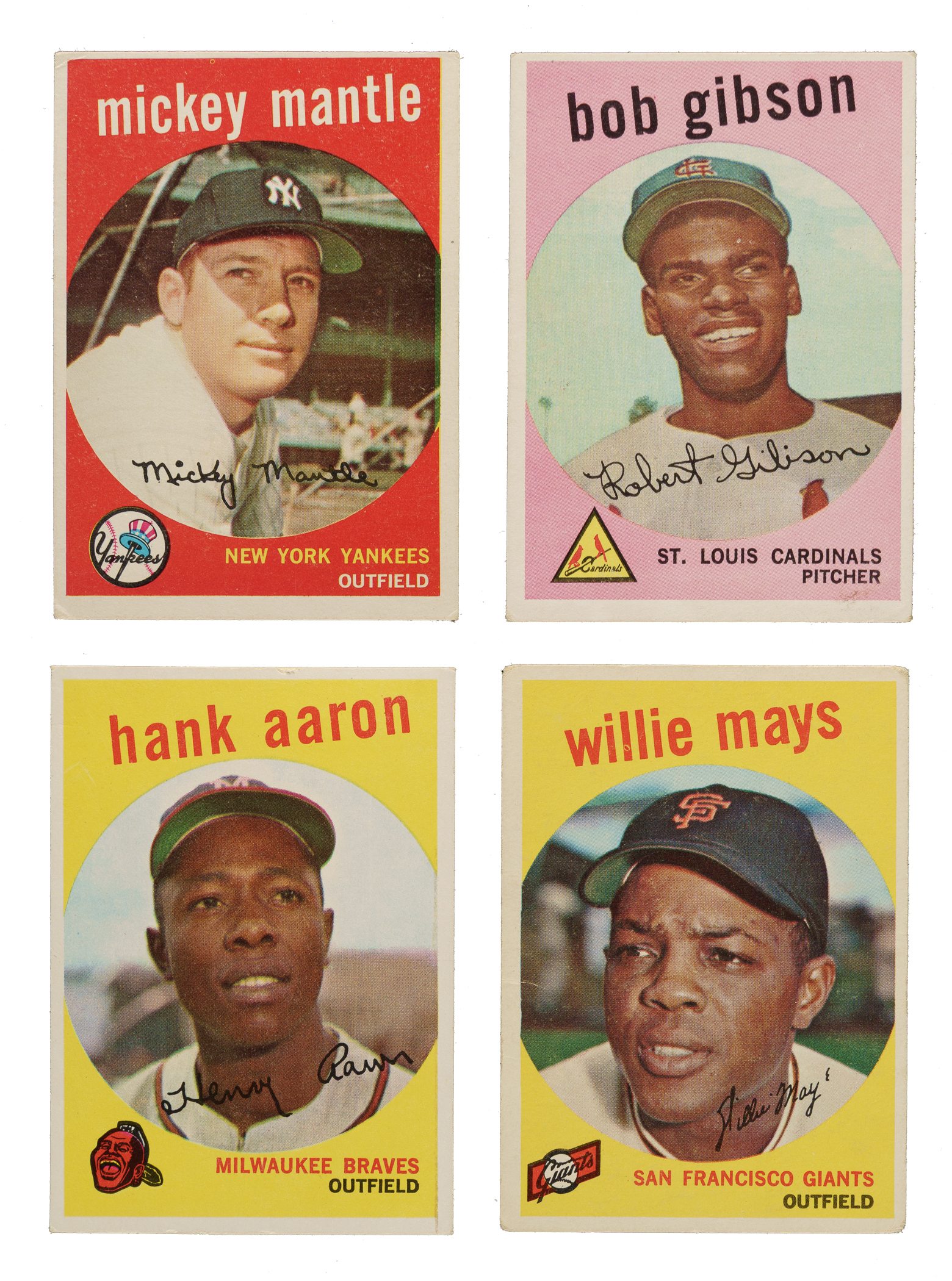 Very attractive and consistent complete set of 1959 Topps Baseball. The 1959 Topps set is highlighted by all the stars and Hall of Famers of the era, including the rookie card of St. Louis Cardinal Hall of Famer Bob Gibson. Condition is 30% Ex to Ex-Mt (including a few Nr/Mt), 62% Vg to Vg-Ex, and 8% lesser (including a couple with a slight miscut). Keys: #1 Frick (Fr), 10 Mantle (Vg+), 20 Snider (Vg-Ex), 40b Spahn (Vg+), 50 Mays (Vg), 150 Musial (Pr due to staple holes), 163 Koufax (partially erased pen marks on reverse, otherwise Vg), 180 Berra (Vg), 202 Maris (10/90 L/R, otherwise Nr/Mt+), 212 Fence Busters (Vg), 317 NL Hitting Kings (Pr), 322a Hanebrink/no trade statement (Ex), 338 Anderson RC (Vg-Ex), 350 Banks (Ex), 360 Kaline (Vg-Ex), 380 Aaron (Vg), 387 Drysdale (pencil on reverse, otherwise Vg+), 430 Ford (Vg-Ex+), 435 F. Robinson (Vg+), 439 B. Robinson (Gd), 450 Mathews (100/0 L/R, otherwise Vg), 461 Mantle Homer (Ex+), 464 Mays' Catch (Vg), 467 Aaron Clubs Homer (Vg+), 478 Clemente (Vg+), 509 Cash RC (Vg), 510 Yankees Team (2/98 T/B, otherwise Vg-Ex), 514 Gibson RC (Vg+), 515 Killebrew (Gd), 543 Corsair Outfield Trio w/ Clemente (0/100 T/B, otherwise Ex-Mt), 550 Campanella (95/5 L/R, otherwise Vg+), 559 Banks AS (Gd), 561 Aaron AS (partially erased marks on reverse, otherwise Vg), 563 Mays AS (Vg), 564 Mantle AS (Vg-Ex), and 571 Spahn AS (Vg+). Attractive mid-grade complete sets of classic issues from the 1950s such as this always generate tremendous collector interest. This is the type of vintage set that, to many collectors, represents the very best value. Total: 572 cards.