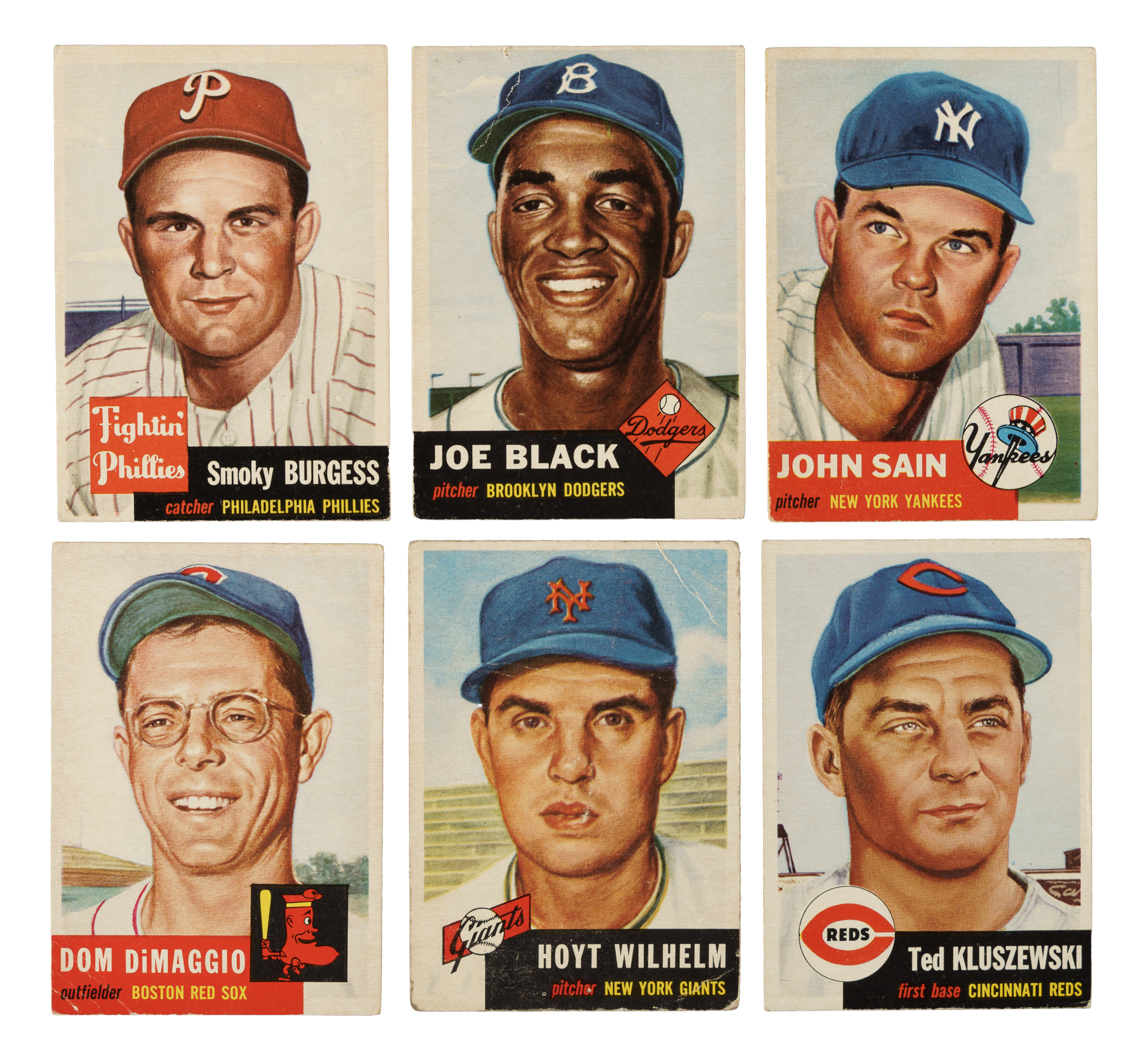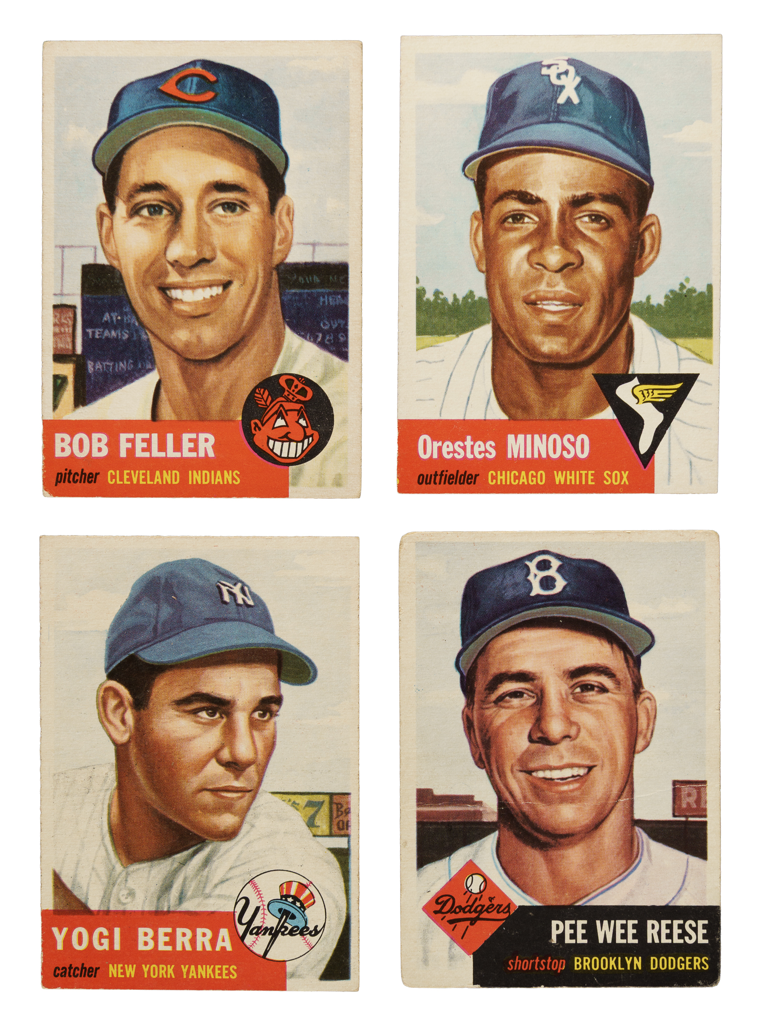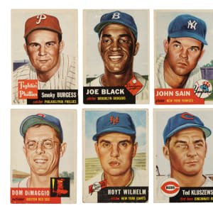 1953 Topps partial set composed of 168 of the 274 cards in the set, highlighted by several short-prints and five Hall of Famers, including Yogi Berra, Bob Feller, and Pee Wee Reese. 1953 Topps is one of the most popular and collected of all 1950s gum issues and one of the most significant of all postwar baseball-card issues. Condition is 12% Ex or slightly better, 64% Vg to Vg-Ex, and 24% lesser (including five with color added). Keys: #10 Burgess SP (Vg+), 54 Feller (Vg), 66 Minoso (Ex+), 76 Reese (color added, otherwise Gd), 81 Black SP (Fr), 104 Berra (Ex), 119 Sain SP (Vg+), 149 D. DiMaggio (Gd+), 151 Wilhelm SP (Pr-Fr), and 162 Kluszewski SP (Vg). Missing the following 106 cards for completion: #1 Robinson, 5, 7, 9, 14, 24, 27 Campanella, 34, 35, 37 Mathews, 41 Slaughter, 43 McDougald, 46, 59, 61 Wynn, 62 Irvin, 65, 72, 77 Mize, 78 Schoendienst, 82 Mantle, 85, 86 Martin, 87 Lopat, 93, 94, 95, 100, 101, 102, 109, 114 Rizzuto, 123, 125, 126, 129, 131, 137, 138 Kell, 140, 143, 146, 147 Spahn, 161, 167, 168, 174, 176, 179, 190, 191 Kiner, 207 Ford, 209, 210, 220 Paige, 221, 222, 224-227, 228 Newhouser, 229-236, 238-243, 244 Mays, 245, 246 Face, 247-249, 251, 252, 254 Roe, 255-257, 258 Gilliam, 259, 260, 262, 263 Podres, 264 Woodling, 265 Jensen, 266, 269, 270, 272, 273 Haddix, 274, 276-279, and 280 Bolling. This is a very attractive and mostly mid-grade partial set of 1953 Topps including several notable highlights. Total: 168 cards.