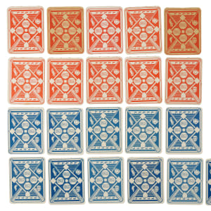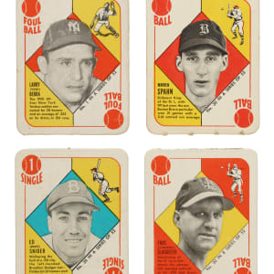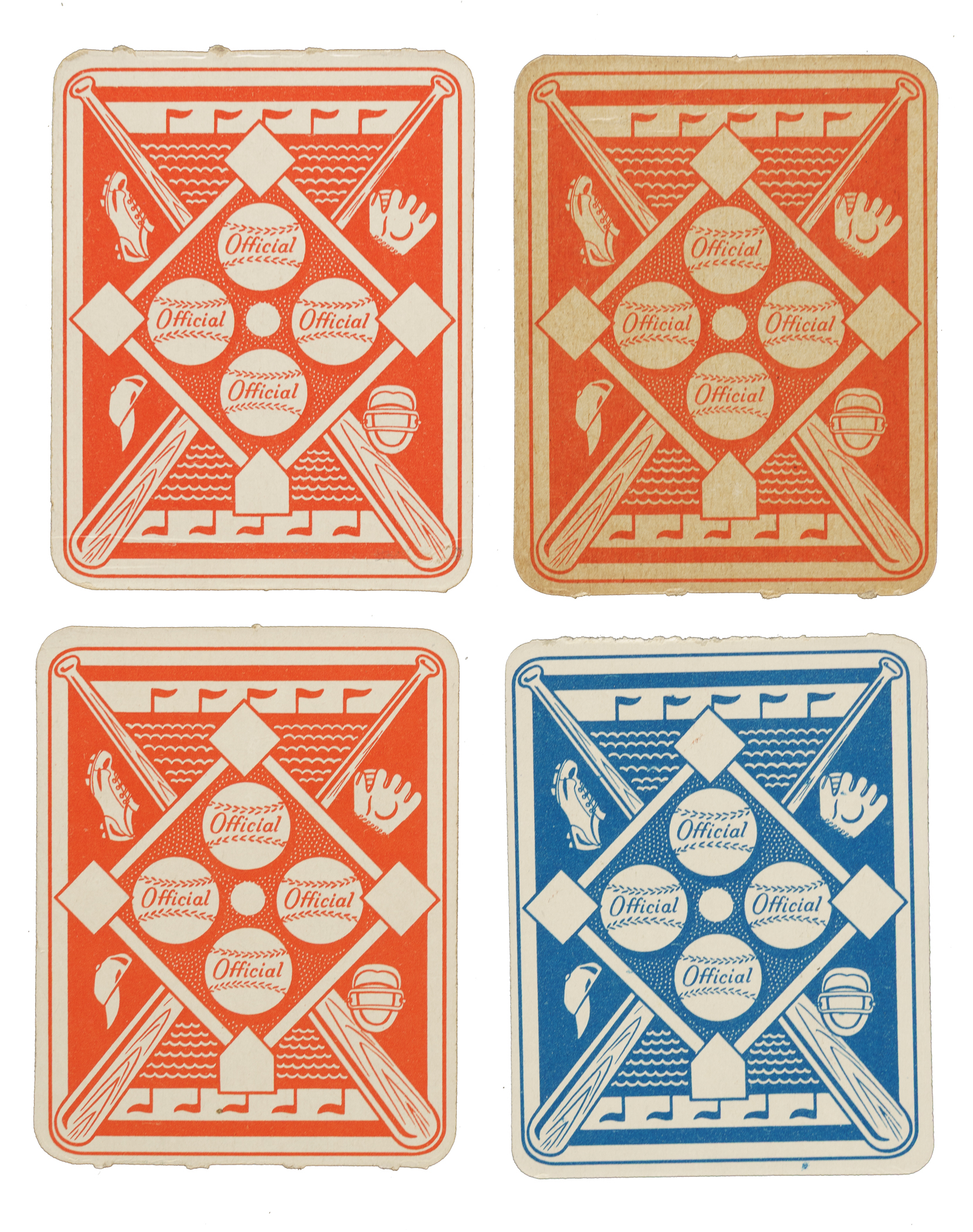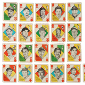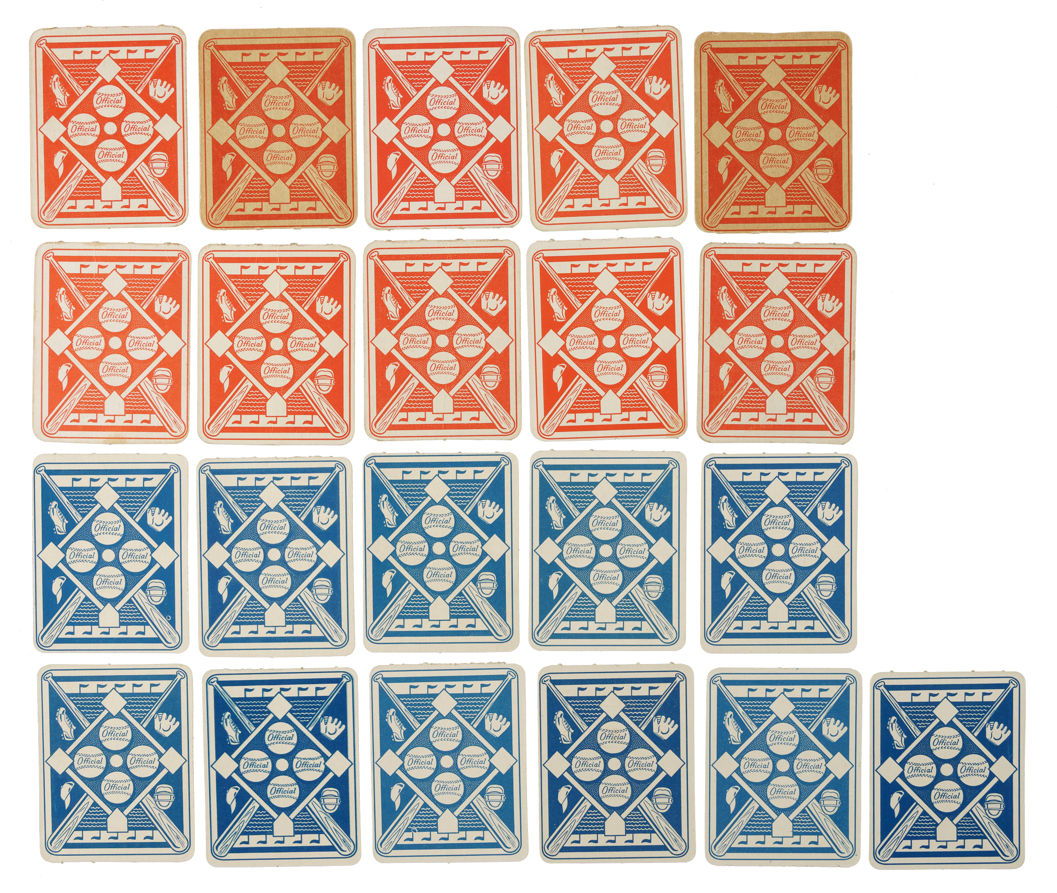 The 1951 Red and Blue Back sets are extremely significant as these were the first major baseball-card sets ever issued by Topps. Offered as a single lot are complete sets of both the 1951 Topps Red Backs and 1951 Topps Blue Backs, each with 52 cards, for a total of 104 cards. 1) 1951 Topps Red Back (52): Condition is 9% Vg-Ex, 33% Gd to Vg, and 58% Pr to Fr. Keys: #1 Berra (Vg+), 5 Rizzuto (Gd), 6 Reynolds (Fr), 8 Wynn (Ex), 15 Kiner (Fr), 20 D. DiMaggio (Fr), 22 Feller (Vg), 30 Spahn (Gd+), 31 Hodges (Pr), 36b Zernial/Philadelphia in bio (Fr), 38 Snider (Vg-Ex), 39 Kluszewski (Fr), 50 Irvin (Pr) and 52b Holmes/Hartford (Gd). 2) 1951 Topps Blue Back (52): Condition is 28% Nr/Mt to Nr/Mt-Mt, 43% Ex to Ex-Mt, and 29% Vg to Vg-Ex (including one Gd). Keys: #1 Yost (80/20 T/B, otherwise Nr/Mt), 3 Ashburn (Nr/Mt), 6 Schoendienst (Vg-Ex), 9 Sain (Nr/Mt-Mt), 10 Page (Vg-Ex), 20 Branca (Nr/Mt+), 30 Slaughter (Ex), 37 Doerr (Vg-Ex), 39 Lopat (Ex), 45 Pierce (Ex-Mt), 50 Mize (Nr/Mt), and 52 Chapman (Vg-Ex). The 1951 Red and Blue Back Topps sets are among the most significant yet overlooked of all early Topps cards, and in our opinion they represent an extraordinary value. Total: 104 cards.