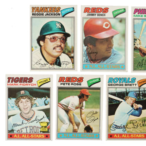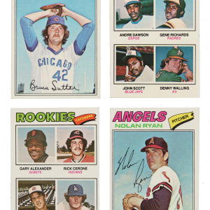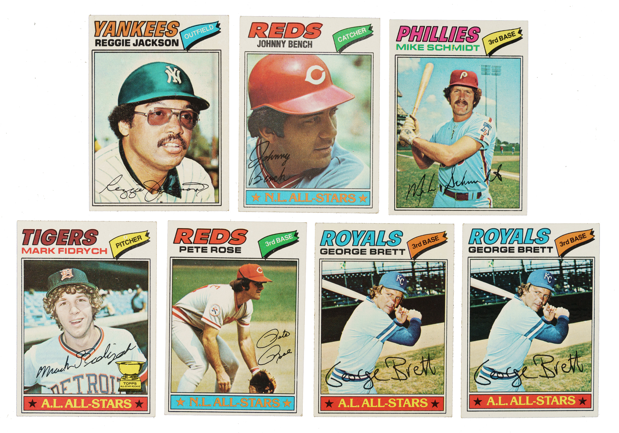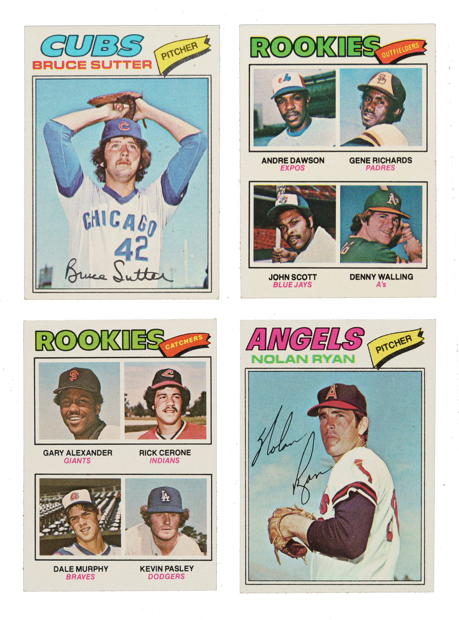 The rookie cards of Andre Dawson, Bruce Sutter, and Dale Murphy highlight the 1977 Topps issue, one of the very popular sets of the 1970s. Includes nine duplicates (#79, 81, 104, two 123, 168, 170, 232, and 580 Brett). Condition is 28% Nr/Mt to Nr/Mt-Mt, 60% Ex to Ex-Mt, and 12% Vg to Vg-Ex (including a couple lesser). Keys: #10 Jackson (Ex-Mt), 70 Bench (Ex+), 140 Schmidt (Nr/Mt-Mt), 144 Sutter RC (Vg-Ex+), 265 Fidrych RC (Nr/Mt), 450 Rose (Ex), 473 Dawson RC (Vg-Ex+), 476 Murphy RC (Ex-Mt+), two 580 Brett (Ex and Vg-Ex+), and 650 Ryan (Nr/Mt). This is a very attractive mid- to high-grade set loaded with Hall of Famers and stars from the 1970s. Total: 669 cards.