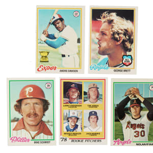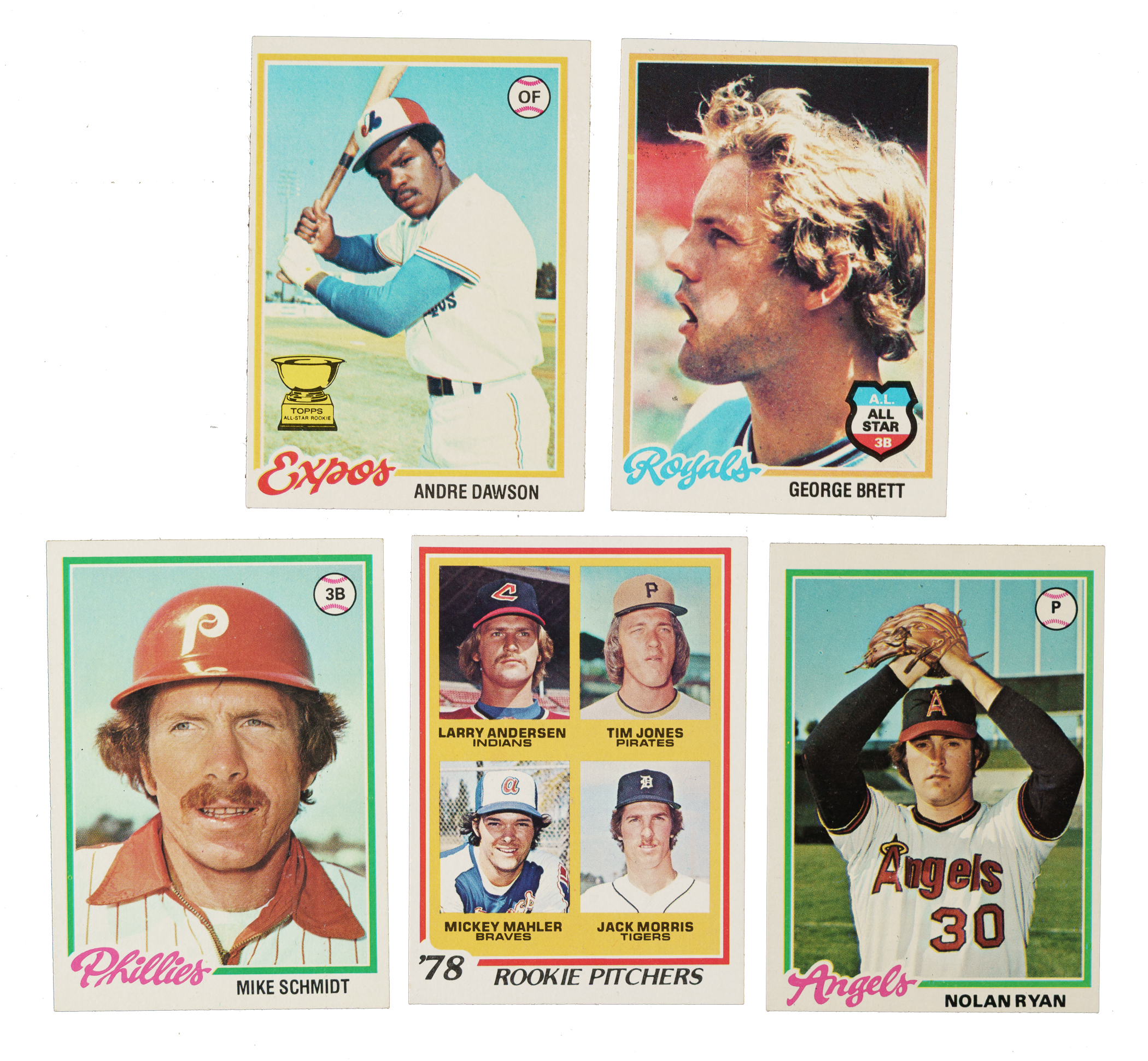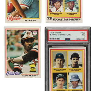 The rookie cards of Hall of Famers Eddie Murray, Jack Morris, Alan Trammell, and Paul Molitor highlight the 1978 Topps issue. Presented is a very attractive complete set of 726 different cards. Condition is 39% Nr/Mt to Nr/Mt-Mt, 56% Ex to Ex-Mt, and 5% Vg to Vg-Ex. Keys: #20 Rose (Ex+), 36 Murray RC (Vg-Ex), 72 Dawson (Ex), 100 Brett (Nr/Mt), 360 Schmidt (Ex+), 400 Ryan (Ex), 703 Morris RC (Nr/Mt), 704 Whitaker RC (Ex), and 707 Molitor/Trammell RC (PSA NM 7). This is an impressive mid- to high-grade complete set. Total: 726 cards.