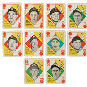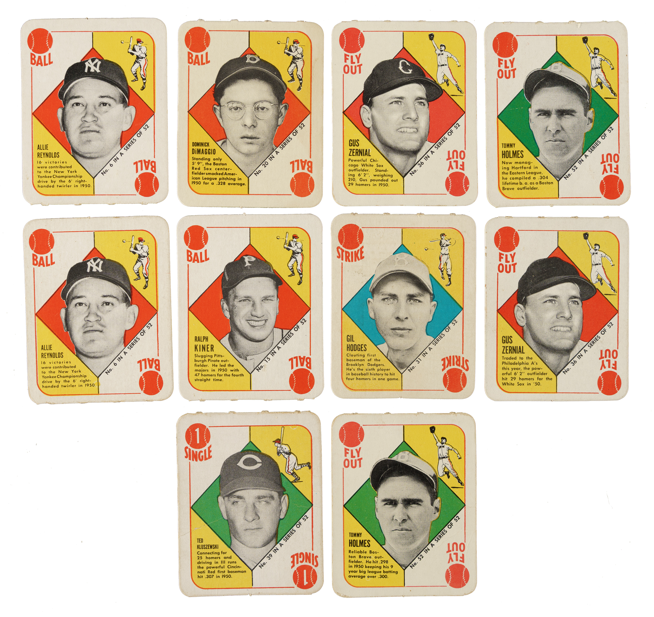 The 1951 Red Back set is extremely significant as it, and the blue back set, were the first major baseball-card sets ever issued by Topps. Offered as a single lot are two near-complete sets of 1951 Topps Red Backs. This collection consists of the following: 1) 1951 Topps Red Back Near-Complete Set (47/52): Condition is 15% Ex to Ex-Mt, 55% Vg to Vg-Ex, and 30% lesser. Keys: #1 Berra (Fr), 6 Reynolds (Vg), 15 Kiner (Vg-Ex+), 20 D. DiMaggio (Gd), 31 Hodges (Ex), 36a Zernial/Chicago in bio (Vg), 39 Kluszewski (Vg-Ex), 50 Irvin (Gd+), and 52b Holmes/Hartford (Gd). Missing the following five cards for completion: #5 Rizzuto, 8 Wynn, 22 Feller, 30 Spahn, and 38 Snider. 2) 1951 Topps Red Back Near-Complete Set (42/52): Condition is 19% Ex to Ex-Mt (including a couple Nr/Mt), 47% Vg to Vg-Ex, and 34% lesser. Keys: #6 Reynolds (Gd), 15 Kiner (Vg+), 31 Hodges (Vg), 36b Zernial/Philadelphia in bio (Pr-Fr due to paper loss on reverse), 39 Kluszewski (Gd), and 52a Holmes/Boston (Fr). Missing the following ten cards for completion: #1 Berra, 5 Rizzuto, 8 Wynn, 20 D. DiMaggio, 21, 22 Feller, 30 Spahn, 38 Snider, 42, and 50 Irvin. The 1951 Red Back Topps set is among the most significant yet overlooked of all early Topps cards, and in our opinion represents an extraordinary value. Total: 89 cards.