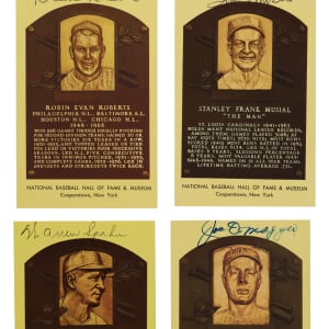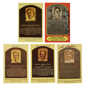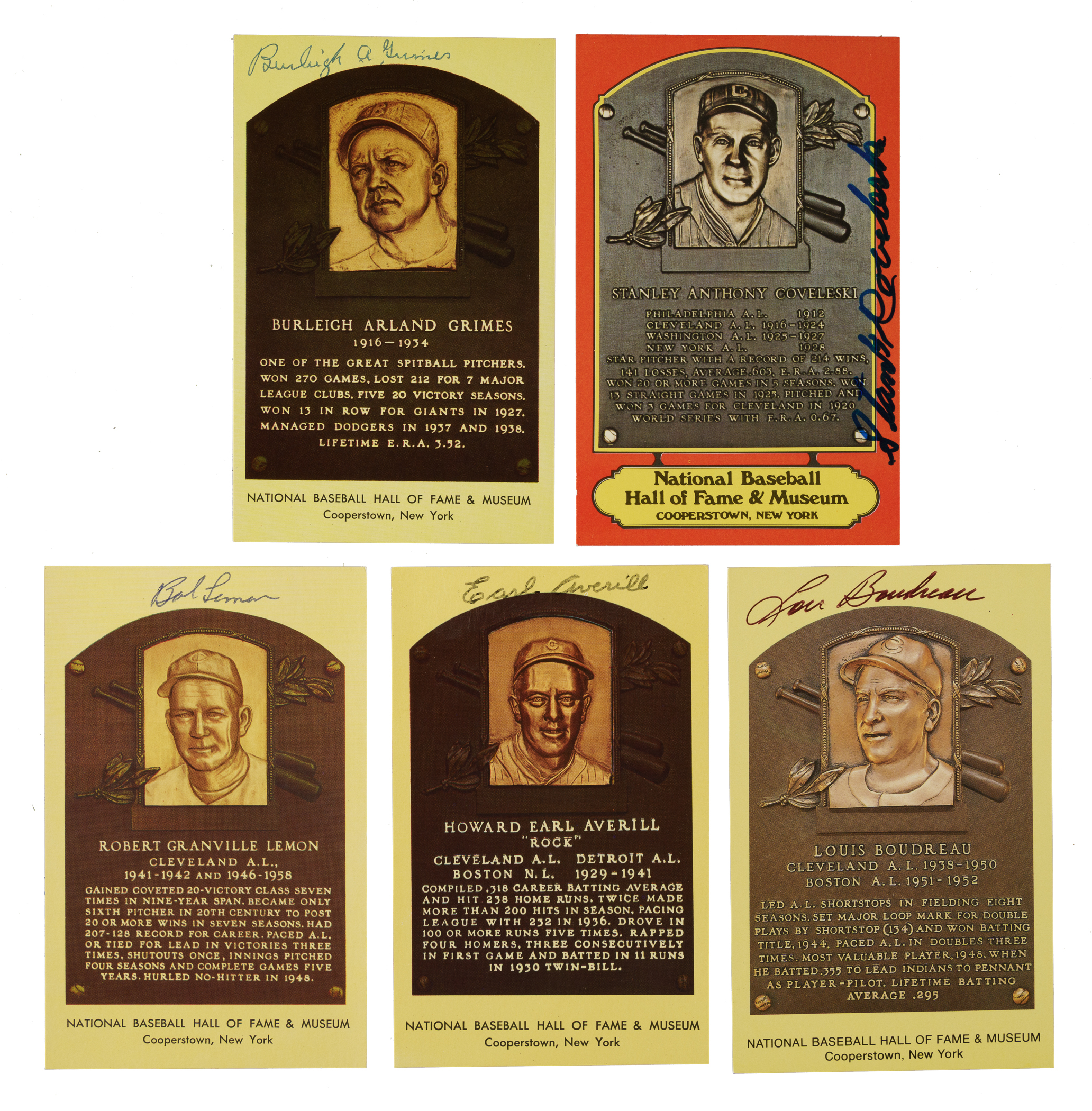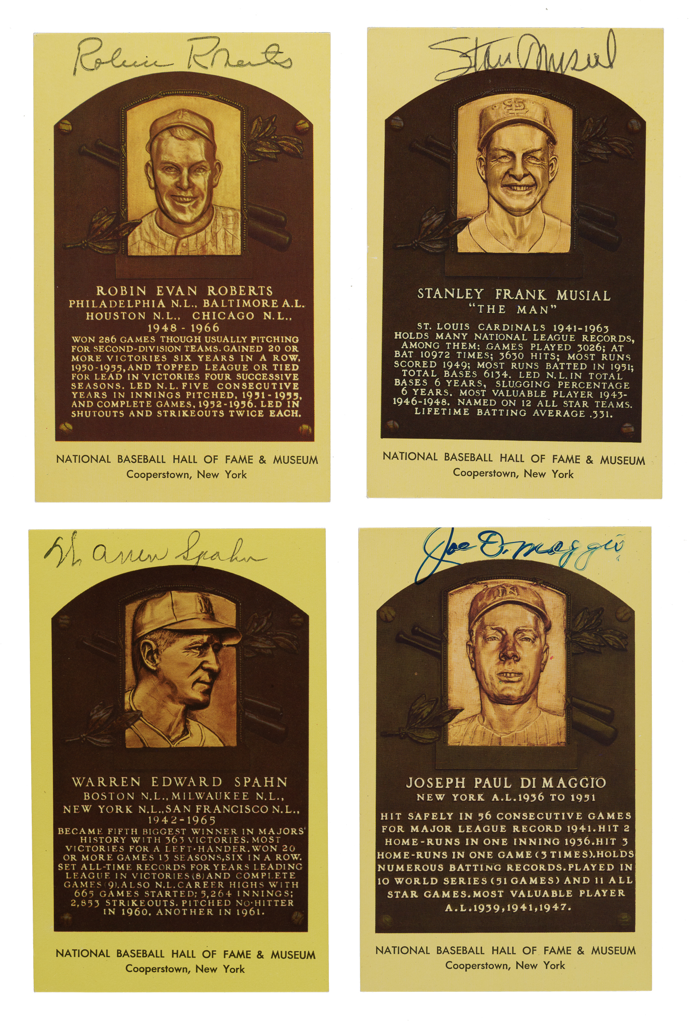 Collection of nine signed yellow Hall of Fame postcards, featuring New York Yankees and St. Louis Cardinals Hall of Famers Joe DiMaggio, Stan Musial and Yogi Berra. This collection consists of the following: Averill, Boudreau, Coveleski, DiMaggio, Grimes, Lemon, Musial, Roberts, and Spahn. Total: 9 postcards. Auction LOA from James Spence/JSA.