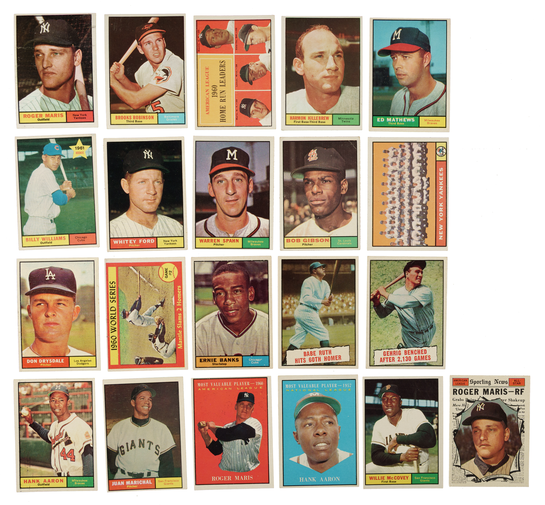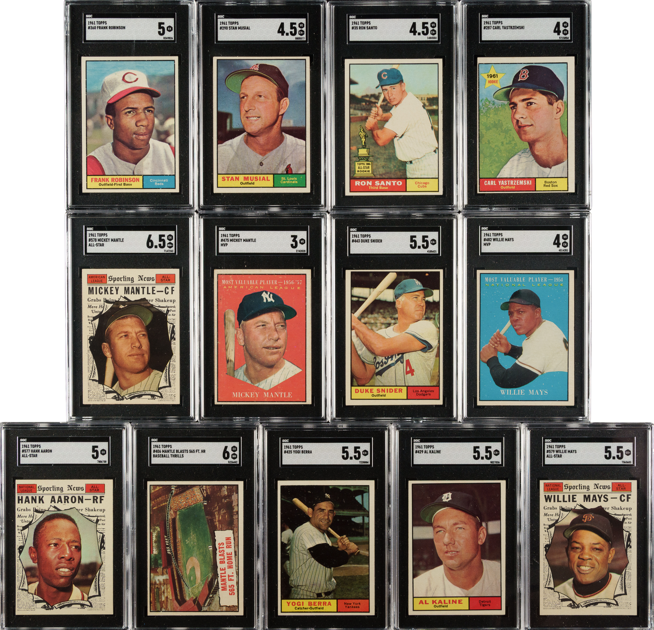 Presented is a very sharp-looking complete set of one of the era's most popular issues, crisp and clean throughout. The 1961 Topps set includes five different Mickey Mantle cards and was Topps' first venture into the popular League Leader subset. The Most Valuable Player subset, an extremely difficult high-number run, and the rookie cards of Juan Marichal, Billy Williams, and Ron Santo also highlight this set. Fifty-five cards have been professionally graded and encapsulated by PSA (16), SGC (37), and GAI (2). Includes both variations of two cards (#189 and 437). SGC Grading Composite: NM/MT 8 (2 cards): #536 (PSA) and 537 (PSA). NM+ 7.5 (2 cards): #549 (GAI) and 558 (GAI). NM 7 (13 cards): #76 (PSA), 92, 222 (PSA), 241 (PSA), 261, 357 (PSA), 529 (PSA), 530 (PSA), 539 (PSA), 550 (PSA), 560 (PSA), 561 (PSA), and 562 (PSA). EX/NM+ 6.5 (3 cards): #224, 578 Mantle AS, and 584. EX/NM 6 (9 cards): #13 (PSA), 86 Dodgers Team, 161, 406 Mantle Blasts HR, 525, 555 (PSA), 568 Skowron AS, 582 (PSA), and 586 Ford AS. EX+ 5.5 (8 cards): #150 Mays, 425 Berra, 429 Kaline, 443 Snider, 543 (SGC 70), 557, 575 Banks AS, and 579 Mays AS. EX 5 (7 cards): #43, 136 Alston, 276, 300 Mantle, 344 Koufax, 360 F. Robinson, and 577 Aaron AS. VG/EX+ 4.5 (6 cards): #35 Santo RC, 134, 290 Musial, 388 Clemente, 526, and 572 B. Robinson AS. VG/EX 4 (3 cards): #287 Yastrzemski, 482 Mays MVP, and 580 Kaline AS. VG+ 3.5 (1 card): #313. VG 3 (1 card): #475 Mantle MVP. Condition of the 534 unencapsulated cards is 4% Nr/Mt, 25% Ex to Ex-Mt, and 71% Vg to Vg-Ex (including 5% lesser). Unencapsulated Keys: #2 Maris (Vg), 10 B. Robinson (Gd+), 44 AL HR Ldrs (Vg-Ex), 80 Killebrew (Vg-Ex), 120 Mathews (Vg-Ex), 141 B. Williams RC (Vg-Ex), 160 Ford (Vg+), 200 Spahn (90/10 T/B, otherwise Ex-Mt), 211 Gibson (Gd), 228 Yankees Team (Vg-Ex+ due to centering), 260 Drysdale (Fr due mostly to small tear), 307 Mantle WS Gm. 2 (Vg), 350 Banks (Vg+), 401 Ruth Hits 60th (Vg-Ex), 405 Gehrig Benched (Vg), 415 Aaron (Vg-Ex), 417 Marichal RC (Vg+), 478 Maris MVP (15/85 L/R and 5/95 T/B, otherwise Nr/Mt), 484 Aaron MVP (Vg-Ex), 517 McCovey (Vg-Ex+), and 576 Maris AS (Gd). 1961 will always be remembered as a "magical year" in baseball history and a high-quality, mid- to high-grade complete set of 1961 Topps as offered here will always be a highly prized "time capsule." Total: 589 cards (complete set plus two variations). The size/weight of this item requires that there will be an additional shipping charge for this lot.