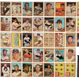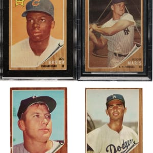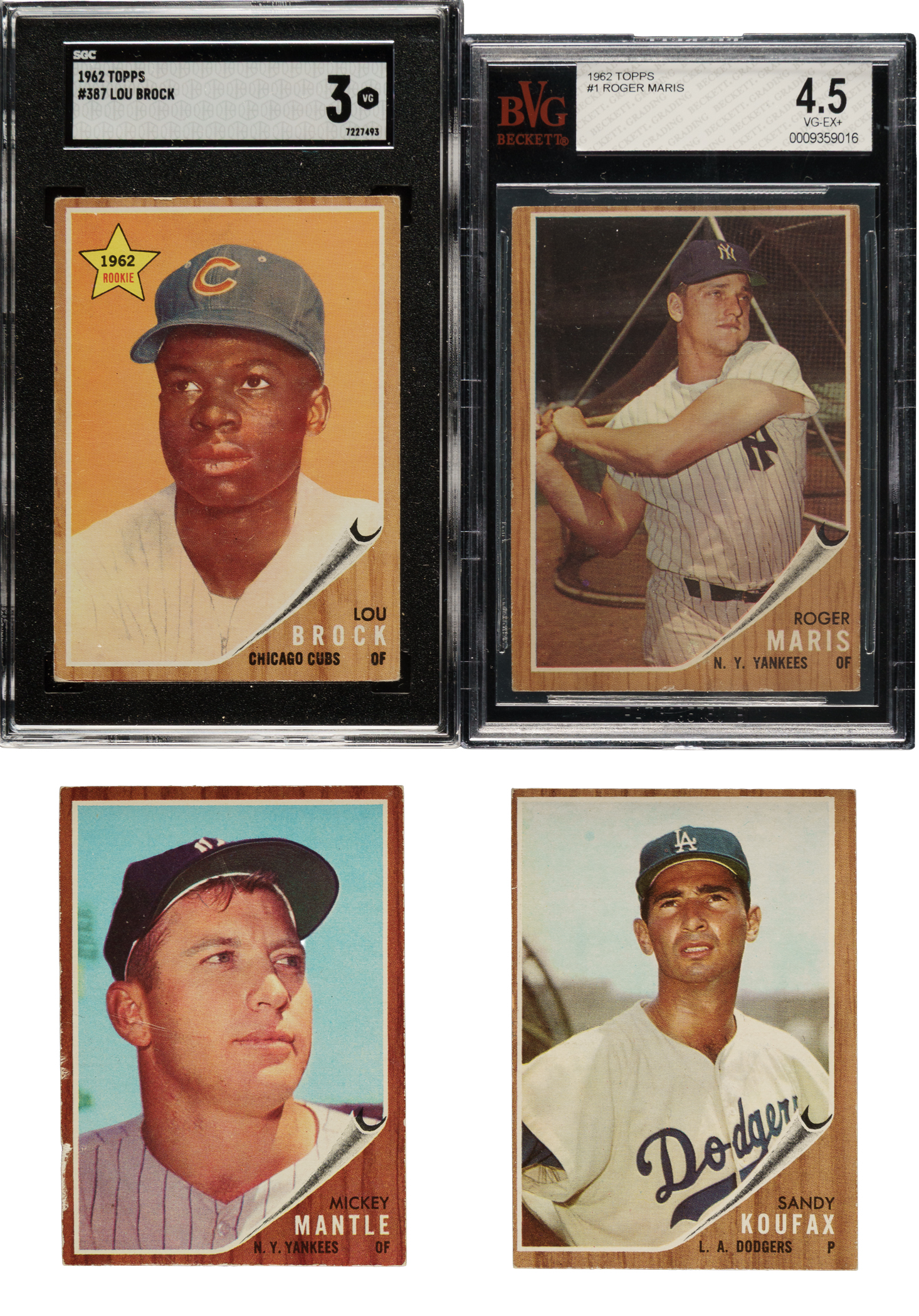 Presented is a complete 598-card set of 1962 Topps baseball cards plus twenty-three variations, for a total of 621 cards. The 1962 Topps set has a well-deserved reputation for being the era's most condition-sensitive issue. The flush-to-the-border brown wood-grain design of the 1962 Topps set makes this issue particularly susceptible to edge and corner wear, and makes the assembly of high-grade sets all the more difficult. Includes one significant variation (#190) and 22 green-tint variations (#111, 112, 118, 119, 124, 130, 143, 144, 145, 146, 148, 151, 155, 158, 160, 166, 175, 181, 184, 188, 193, and 195). Condition is 36% Ex to Ex-Mt (including a few Nr/Mt), 55% Vg to Vg-Ex, and 9% lesser (including six with color added and a few miscut). Four cards have been professionally graded and encapsulated by BVG (2) and SGC (2). Keys: #1 Maris (BVG VG-EX+ 4.5), 5 Koufax (Ex), 10 Clemente (Vg-Ex), 18 Manager's Dream (Vg+), 25 Banks (Vg), 30 Mathews (Ex-Mt), 45 B. Robinson (Vg+), 50 Musial (BVG NM 7), 53 AL HR Ldrs (Fr-Gd), 70 Killebrew (Vg-Ex+), 99 Powell RC (Ex-Mt), 100 Spahn (Vg+), 139d Babe Hits 60/no pole in background (SGC Authentic/color added), 140 Gehrig/Ruth (Vg-Ex), 150 Kaline (Ex), 190a Moon/with cap (Gd), 199 Perry RC (Ex), 200 Mantle (Gd), 218 Torre RC (Ex), 251 Yankees Team (Vg-Ex+), 300 Mays (Vg+), 310 Ford (Vg-Ex), 313 Maris Blast (Vg), 318 Switch Hitter Connects - Mantle (100/0 T/B and L/R, otherwise Vg), 320 Aaron (1/99 L/R, otherwise Vg-Ex), 340 Drysdale (Vg), 350 F. Robinson (85/15 L/R, otherwise Ex-Mt), 360 Berra (Vg-Ex), 387 Brock RC (SGC VG 3), 394 Aaron AS (Vg-Ex), 395 Mays AS (15/85 L/R, otherwise Nr/Mt), 401 Maris/Cepeda (Ex), 425 Yastrzemski (Pr), 471 Mantle AS (Vg), 500 Snider (Gd), 505 Marichal (slightly miscut left edge, otherwise Ex+), 530 Gibson (Vg+), 544 McCovey (Fr), 545 Wilhelm (Vg-Ex), 575 Schoendienst (Vg-Ex), 592 Bouton RC (10/90 T/B, otherwise Vg-Ex), 594 Uecker RC (Vg), 596 Pepitone RC (Ex), and 598 Hickman RC (1/99 T/B, otherwise Vg+). This is a very attractive mid-grade complete set of this classic set, which includes all the great stars of the era. Total: 621 cards (set of 598 plus 23 variations).