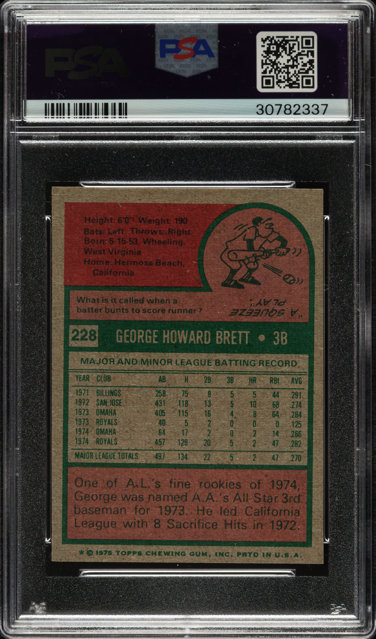 Graded MINT 9 by PSA. Ultra high-grade example of Kansas City Royals Hall of Famer and 3,000 Hit Club member George Brett. The 1975 Topps Mini set is prone to many different problems, including centering issues, print quality, and corner and edge chipping. Bright and crisp, with sharp corners, vibrant colors, and outstanding image quality. Clean reverse. This is a spectacular rookie card example of one of the greatest hitters of his era.
