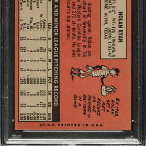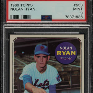 Graded MINT 9 by PSA. Superb example of Nolan Ryan from the classic 1969 Topps set featuring the New York Mets Hall of Famer in his second year in the Major Leagues. Only three examples grade higher out of 10,162 cards evaluated by PSA. The offered card features bold colors, outstanding clarity, and sharp corners. Clean reverse. A tremendous example.