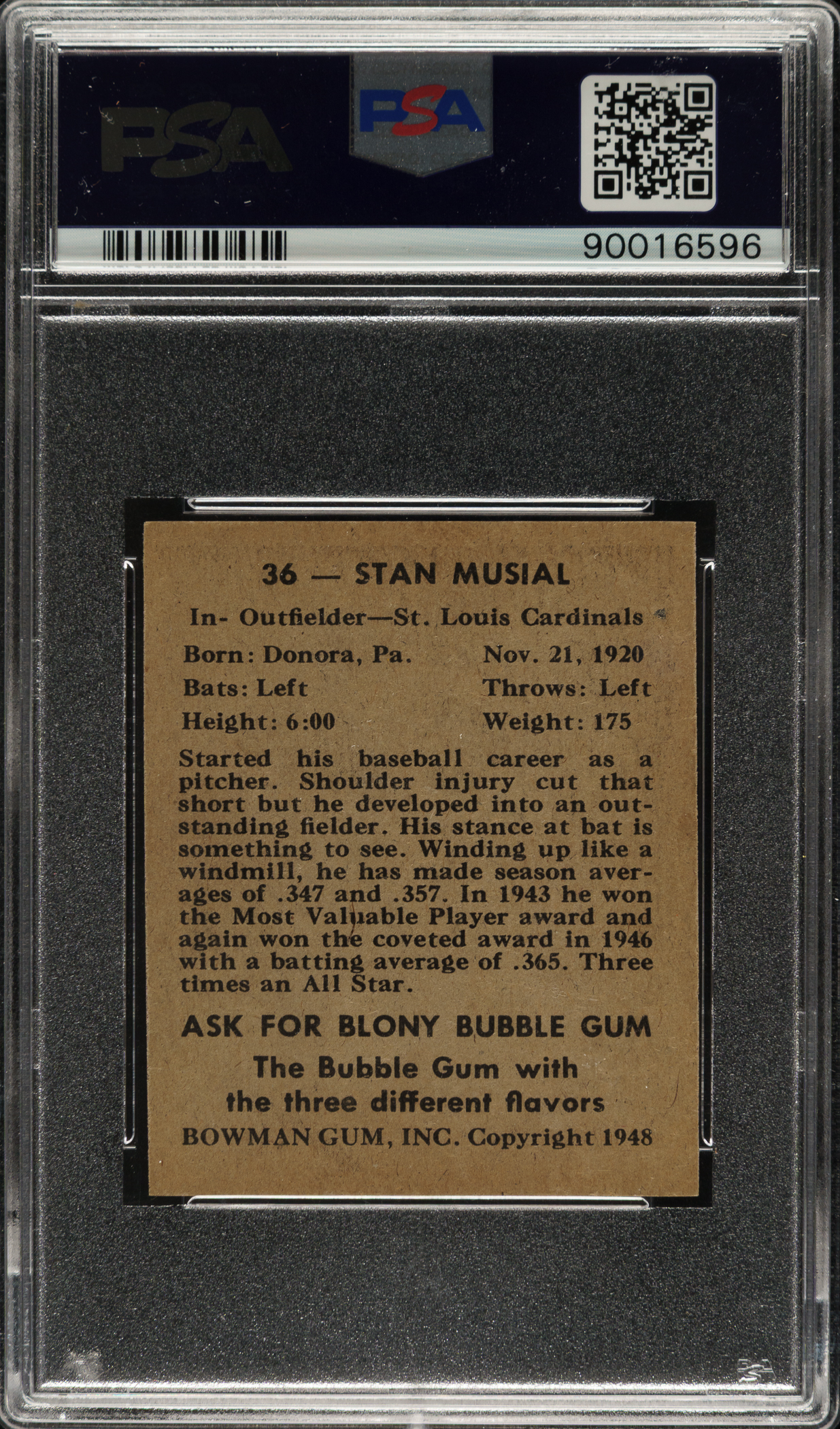 Graded NM-MT 8 by PSA. Exceptional high-grade example of St. Louis Cardinals Hall of Famer Stan Musial's rookie card, one of the most important cards of the era and the key card of Bowman's first baseball-card set. One of the greatest hitters who ever lived and a seven-time batting champ, Musial retired in 1963 as the National League's all-time leader in hits with 3,630 (since broken) and finished his career with a .331 lifetime average. He was elected to the Hall of Fame in 1969, his first year of eligibility. This example boasts outstanding image clarity and strong corners. Clean reverse with bold black text. This is a fantastic high-grade example of Hall of Famer Stan Musial's rookie card, which would be a worthy addition to any 1948 Bowman set or Hall of Fame rookie-card collection.