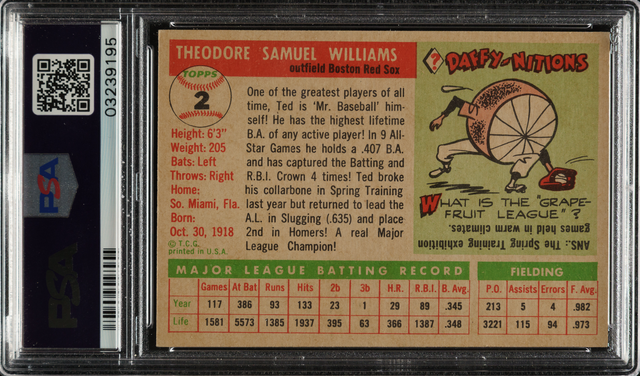 Graded NM-MT 8 by PSA. Extremely attractive example of one of Boston Red Sox Hall of Famer Ted Williams' most popular cards from the classic 1955 Topps series. The offered card has bright colors, a crisp image, and strong corners. Boldly printed reverse. The condition is all the more impressive as (being card #2 in the set) this card would naturally receive much more handling and wear than almost all other cards in the set. Though Williams broke into the Major Leagues all the way back in 1939, he was still in top form at the time of this card's issue (his 14th Major League season). Williams hit .356 in 1955, and the statistics on the reverse of the card show Williams hitting .345 the previous season. A fantastic high-grade example of 1955 Topps #2 Ted Williams.
