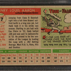 Graded NM-MT 8 by PSA. Stunning example of this classic second-year card of Milwaukee Braves Hall of Famer Hank Aaron. The card has brilliant colors, outstanding registration, and strong corners. There are no print lines, which is a common problem with this card, as well as many 1955 Topps cards. Boldy printed reverse. This is a superb high-grade example of one of the most popular of all Hank Aaron cards and one of the most classic of all 1950s bubble-gum cards.