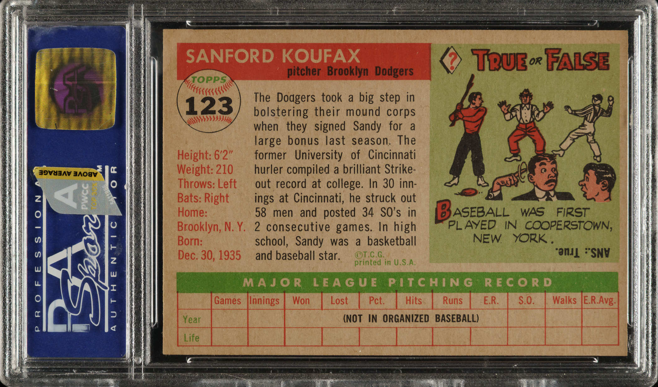 Graded NM-MT 8 by PSA. Fantastic high-grade example of Brooklyn Dodgers Hall of Famer Sandy Koufax's rookie card. The Koufax rookie is the second most valuable card in the 1955 Topps set, surpassed only by Roberto Clemente's rookie card in the high-number series. This example has beautiful colors, outstanding registration, and strong corners. This is a tremendous example of an extremely noteworthy vintage classic.