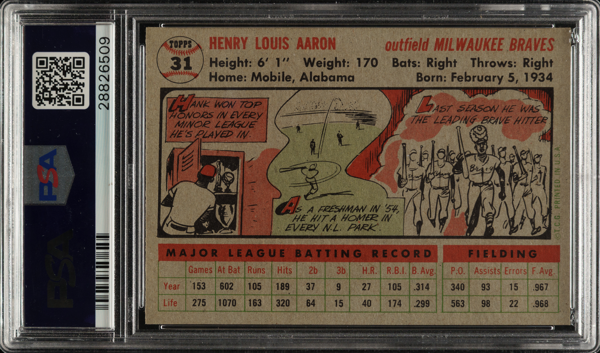 Graded NM-MT 8 by PSA. Tremendous high-grade example of Milwaukee Braves Hall of Famer Hank Aaron from the classic 1956 Topps set. This example has brilliant colors, outstanding clarity, strong corners, and excellent centering. It is interesting to note that the image on the card of Aaron sliding home is actually that of Hall of Famer Willie Mays. The gray back is boldly printed and clean. This is a fantastic high-grade example of one of Hank Aaron's most important early cards and one of the key cards in this popular set.