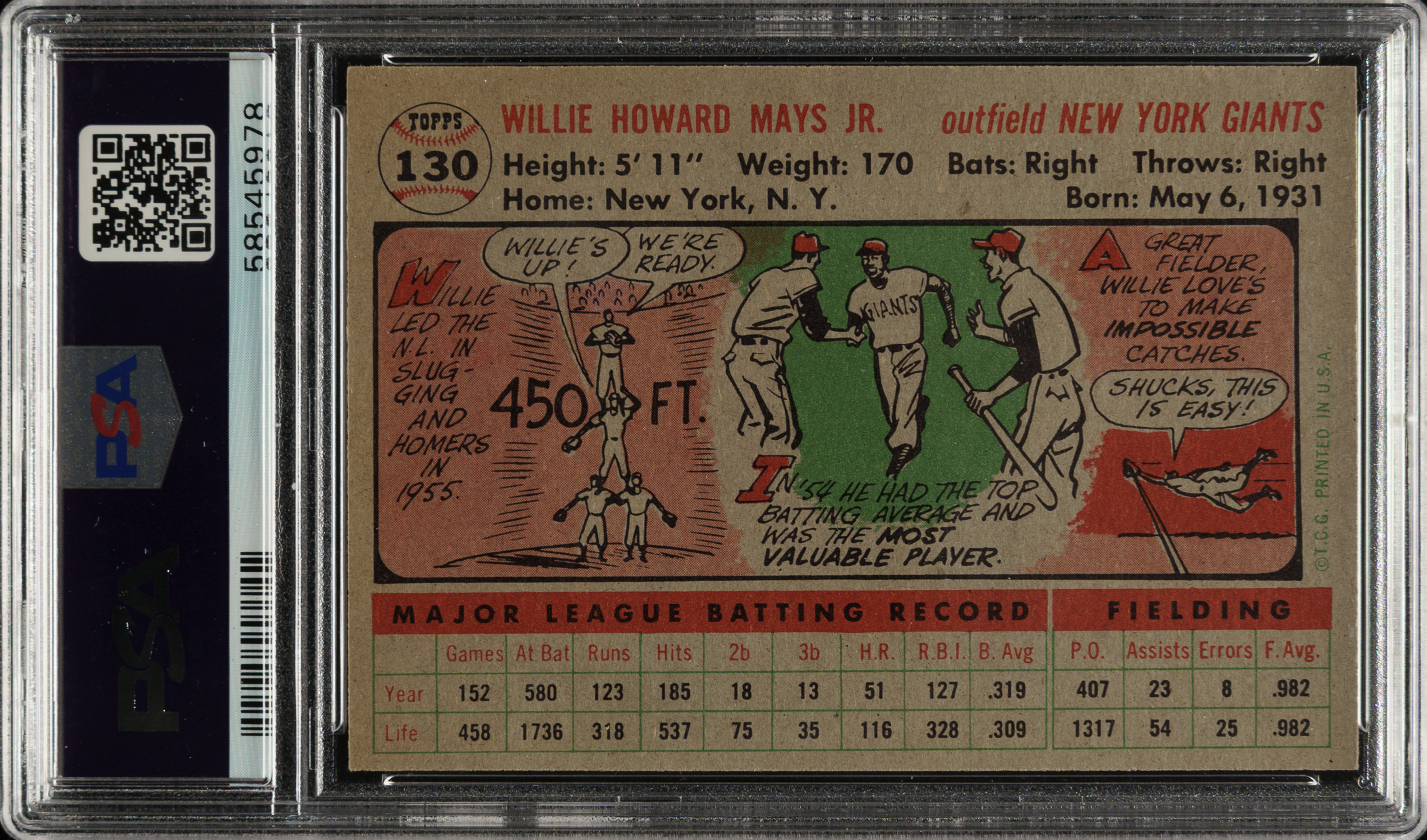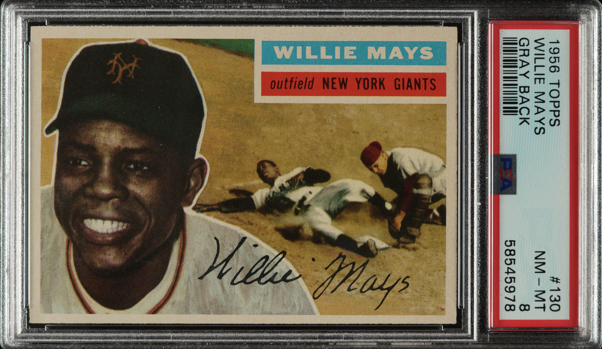 Graded NM-MT 8 by PSA. High-grade example of New York Giants Hall of Famer Willie Mays from the classic 1956 Topps set. This card displays vibrant colors, outstanding registration, and strong corners. The gray back is boldly printed and clean. 1956 Topps cards typically suffer from a variety of condition problems, including print defects and a tendency to have soft corners, which make high-grade examples particularly difficult to find. A tremendous high-grade example worthy of the finest Willie Mays or Hall of Famer card collection.
