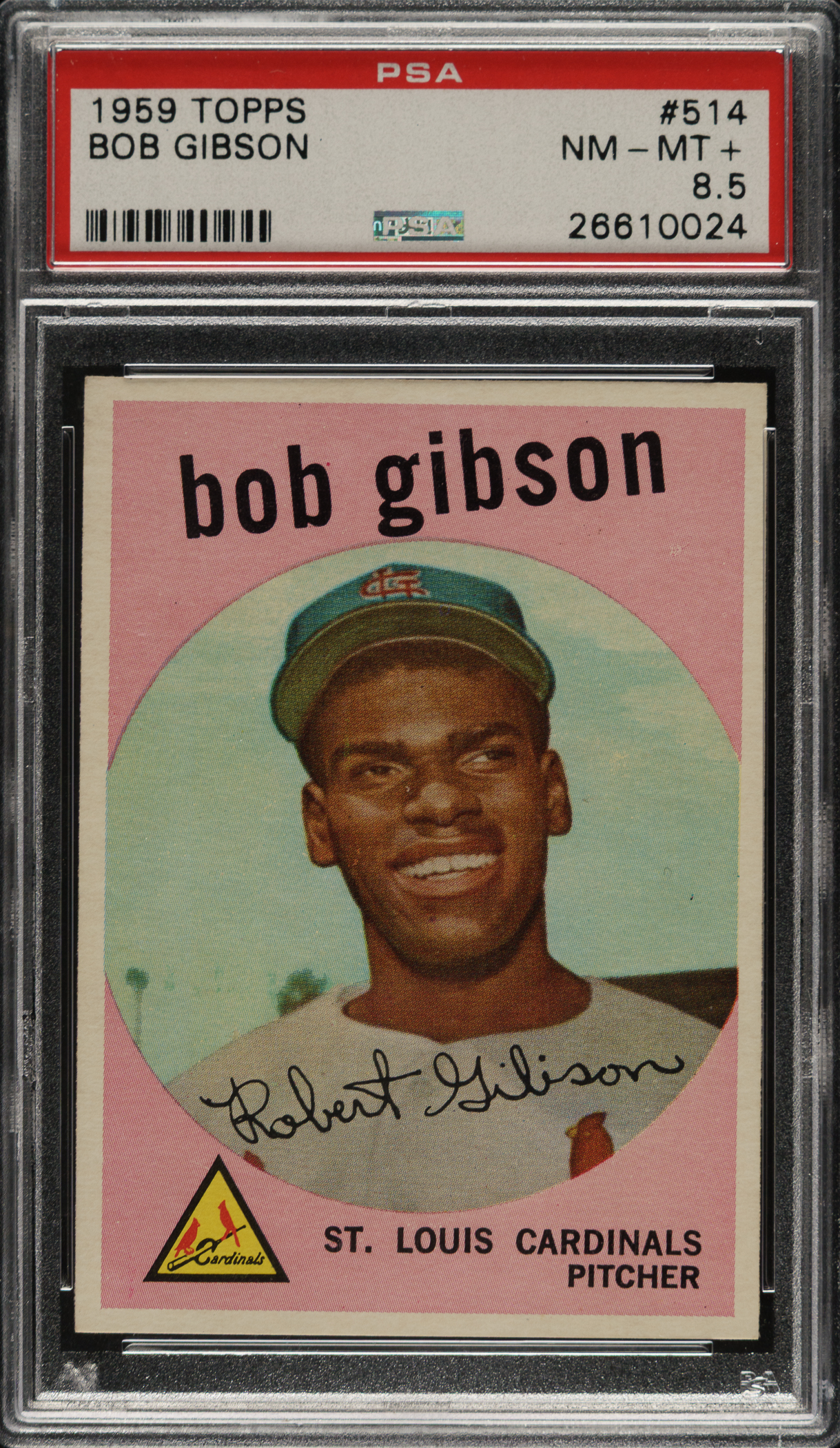 Graded NM-MT+ 8.5 by PSA. Striking high-grade rookie card of St. Louis Cardinals Hall of Famer Bob Gibson from the 1959 Topps set. This card has brilliant colors, outstanding clarity, and strong corners. Clean reverse. This is a tremendous example of the key rookie from this popular 1950s Topps set.