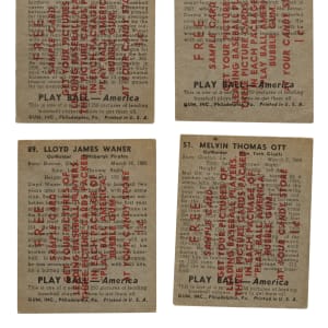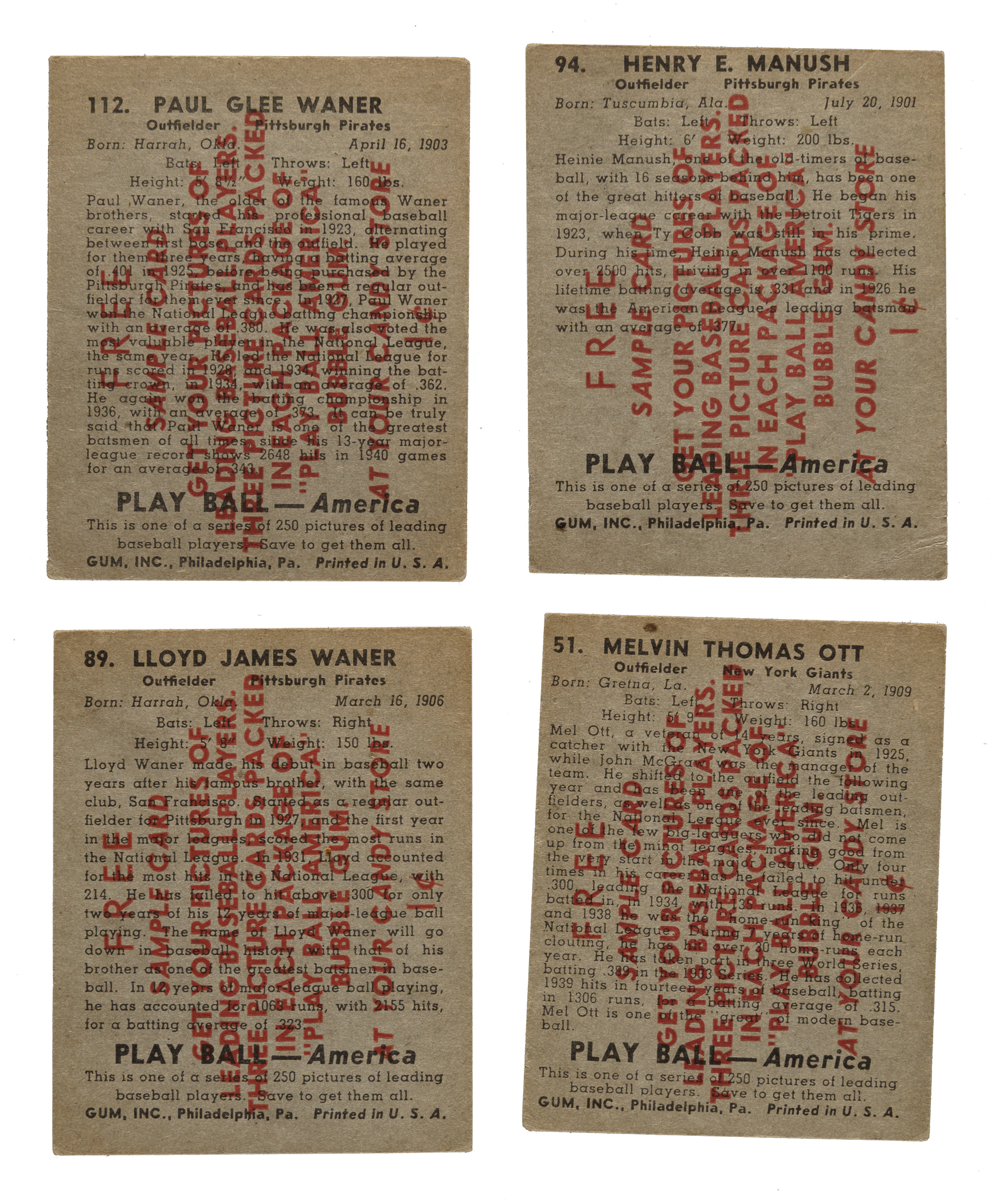 Collection of ten 1939 R334 Play Ball cards, all sample backs. Condition ranges from Gd to Vg-Ex (averaging Vg), including one lesser. This collection consists of the following: #7 Doerr (Gd+), 19, 42, 51 Ott (Vg-Ex), 76, 79, 89 L. Waner (Vg-Ex), 94 Manush (Gd), 96, and 112 P. Waner (Vg). Total: 10 cards.