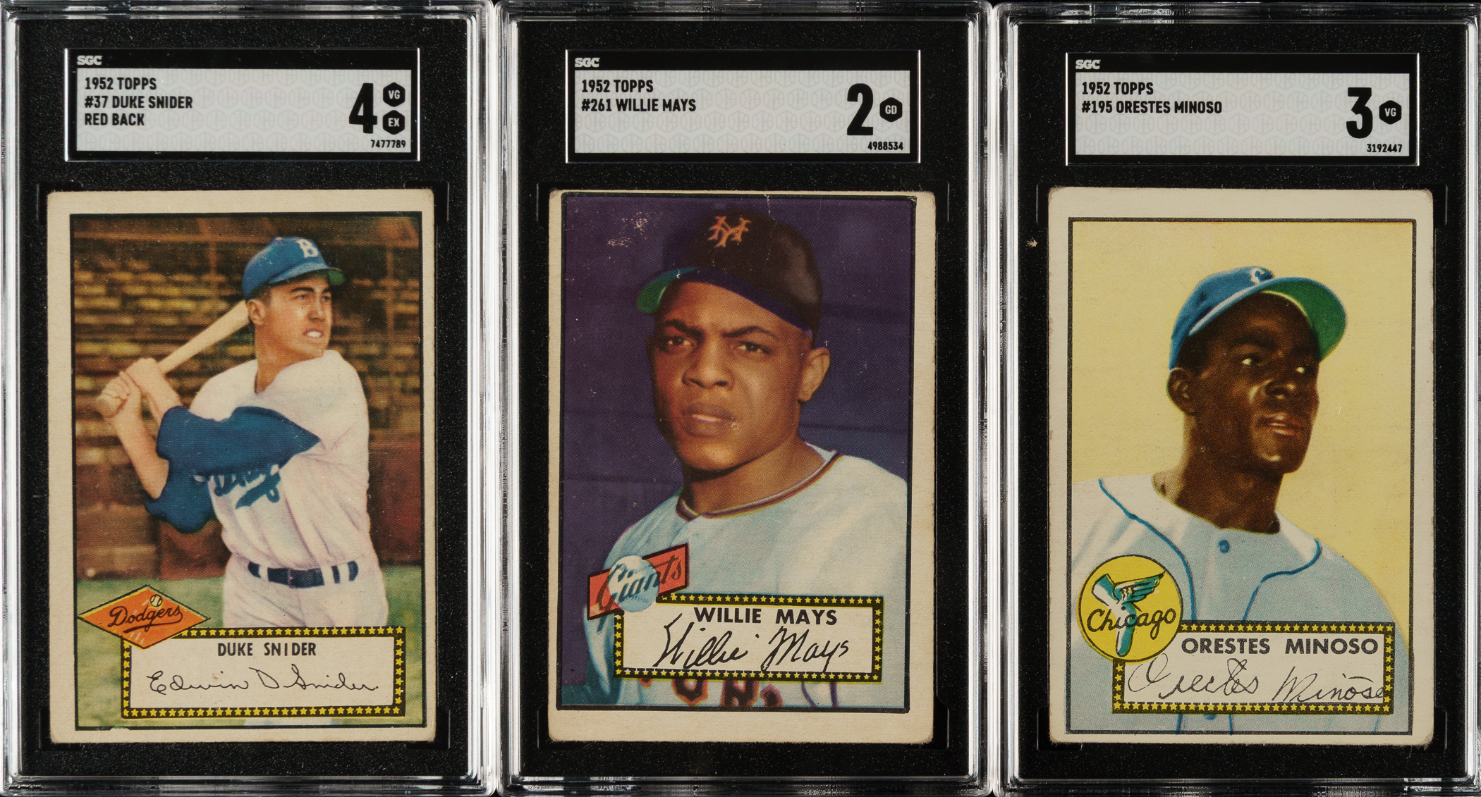 Complete low-number run (#1-310) from the classic 1952 Topps series. Missing only the 97 rare high-number series cards (#311-407) for completion. Cards #1-80 include 61 black-back variations. Condition is 82% Gd to Vg (including 3% Vg-Ex) and 18% Pr to Fr. We have selected four cards to be professionally graded and encapsulated by SGC. Keys (#1-310): #1 Pafko (Pr-Fr), 2 Runnels (Gd, black back), 11 Rizzuto (Gd+), 20 Loes RC (Vg), 22 DiMaggio (Gd+, black back), 26 Irvin (Pr-Fr, black back), 29 Kluszewski (Vg), 33 Spahn (Vg, black back), 36 Hodges (Vg, black back), 37 Snider (VG/EX 4), 48b Page/correct (Vg, black back), 49b Sain/correct (Vg), 57 Lopat (Fr, black back), 59 Roberts (Fr, black back), 65 Slaughter (Gd, black back), 66 Roe (Gd+), 67 Reynolds (Gd, black back), 88 Feller (Vg), 91 Schoendienst (Vg), 122 Jensen (Vg), 129 Mize (Fr), 175 Martin RC (Vg), 191 Berra (GOOD 2), 195 Minoso RC (VG 3), 215 Bauer (Vg), 216 Ashburn (Vg+), 227 Garagiola (Gd), 243 Doby (Fr-Gd), 246 Kell (Vg-Ex), 250 Erskine (Fr), 261 Mays (GOOD 2), 268 Lemon (Gd), and 277 Wynn (Vg). This is an attractive and consistent complete low-number run of 1952 Topps, one of card collecting’s most popular classics, representing a very substantial start toward a complete set. Total: 310 cards.