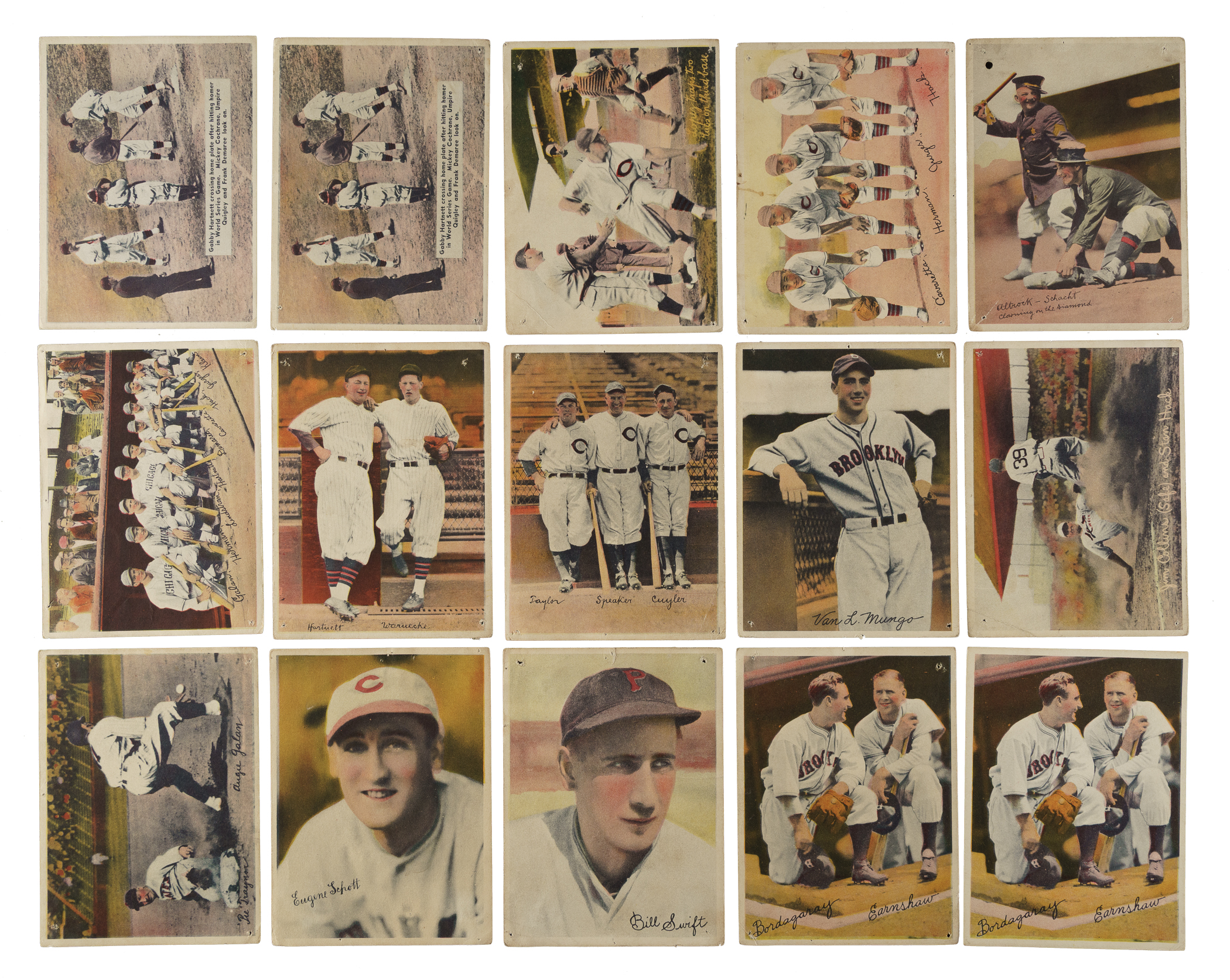 Collection of nineteen 1936 R312 National Chicle Premiums, featuring Detroit Tigers and Cincinnati Reds Hall of Famers Mickey Cochrane, Kiki Cuyler and Ernie Lombardi. Condition is Pr overall. This collection consists of the following: Cochrane (Pr), Cuyler (Pr), two Hartnett (pencil mark on reverse, otherwise Vg and Pr), Lombardi (Pr), Lopez (Pr), Mungo, Schott, Swift, Altrock/Schacht, two Bordagaray/Earnshaw, Cavarretta/Herman/Jurges/Hack (Pr), Collins/Hack, Galan/Herman/Lindstrom/Hartnett/Demaree/Cavarretta/Hack/Jurges/Klein (Pr), Hartnett/Warneke (Pr), Sothoron/Hornsby (Pr), Taylor/Speaker/Cuyler (Pr), and Traynor/Galan (Pr). Total: 19 cards.