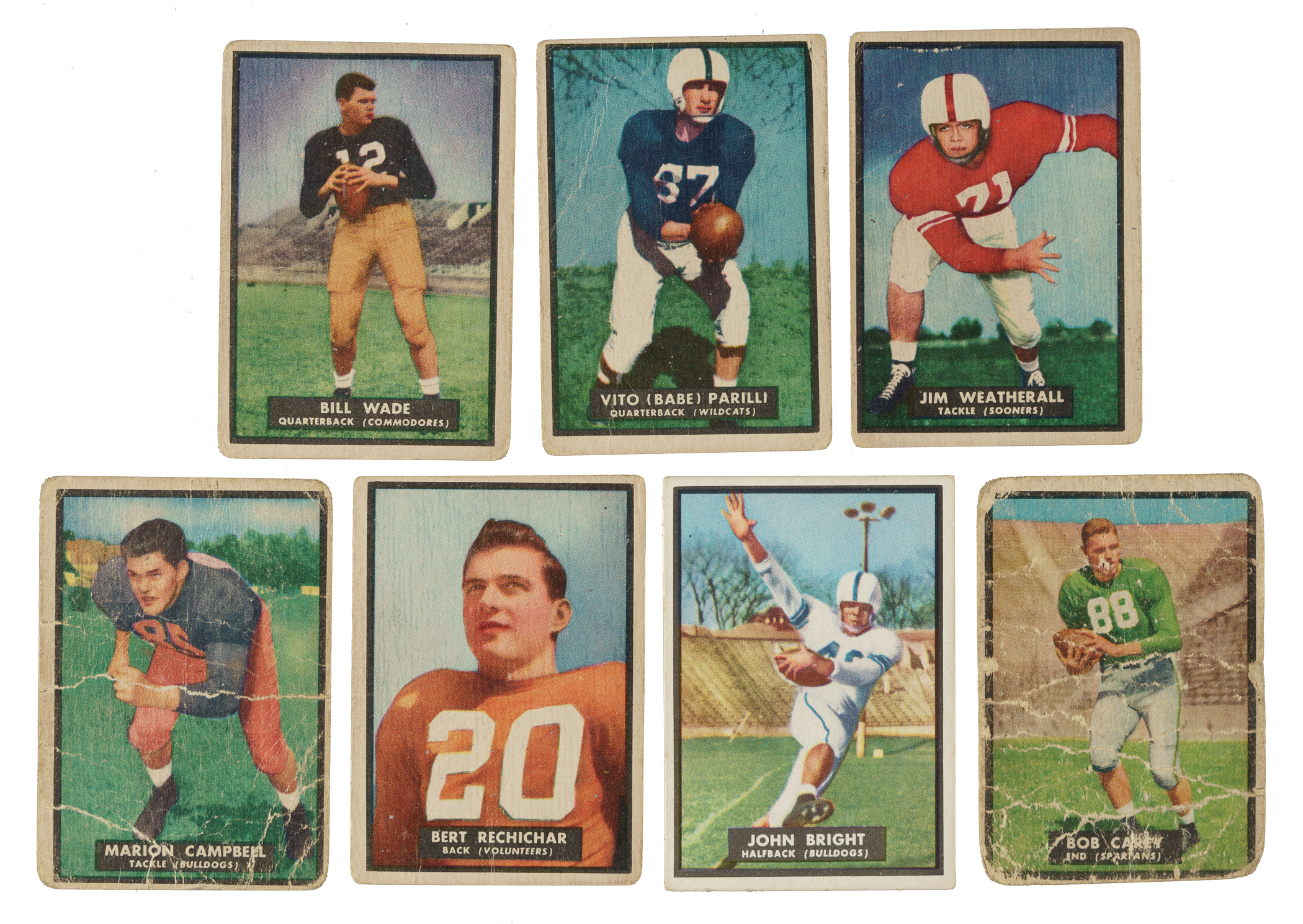 Complete 75-card set of the second major football-card series ever issued by Topps, highlighted by Vic Janowicz's rookie card. These colorful cards, honoring college football stars, were issued the same year as Topps’ Connie Mack All Stars and Current All Stars, as well as the 1951 Topps Red and Blue Back baseball sets. Includes two duplicates (#51 and 63). All cards have been partially or completely scratched off on the back and many of the cards have been trimmed through (or near) the perforations rather than detached by hand. Without further reference to these characteristics, the condition is 20% Vg-Ex to Ex, 41% Gd to Vg, and 39% Pr to Fr (including one altered and one with a trimmed side edge). Keys: #1 Monahan RC (Vg), 2 Wade RC (Gd), 4 Parilli RC (Fr), 10 Janowicz RC (Vg), 12 Weatherall RC (Fr-Gd), 19 Campbell RC (Pr), 30 Rechichar RC (Gd), 37 Marlow (Gd), 48 Young RC (Vg), 72 Bright RC (Vg-Ex), and 75 Carey RC (Pr). A very presentable medium- to lower-grade complete set of this substantial and colorful early Topps football issue. Total: 77 cards (set of 75 plus two duplicates).