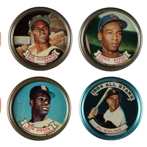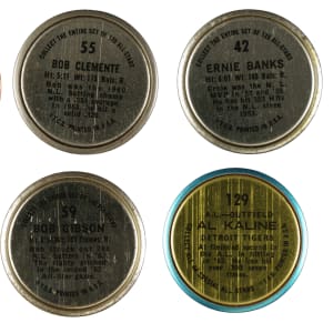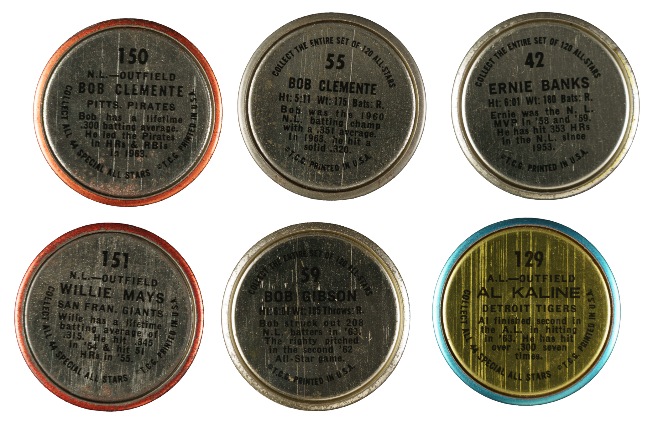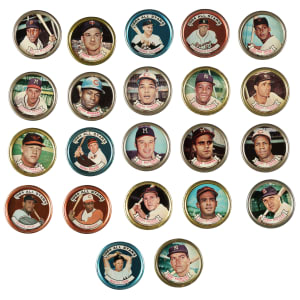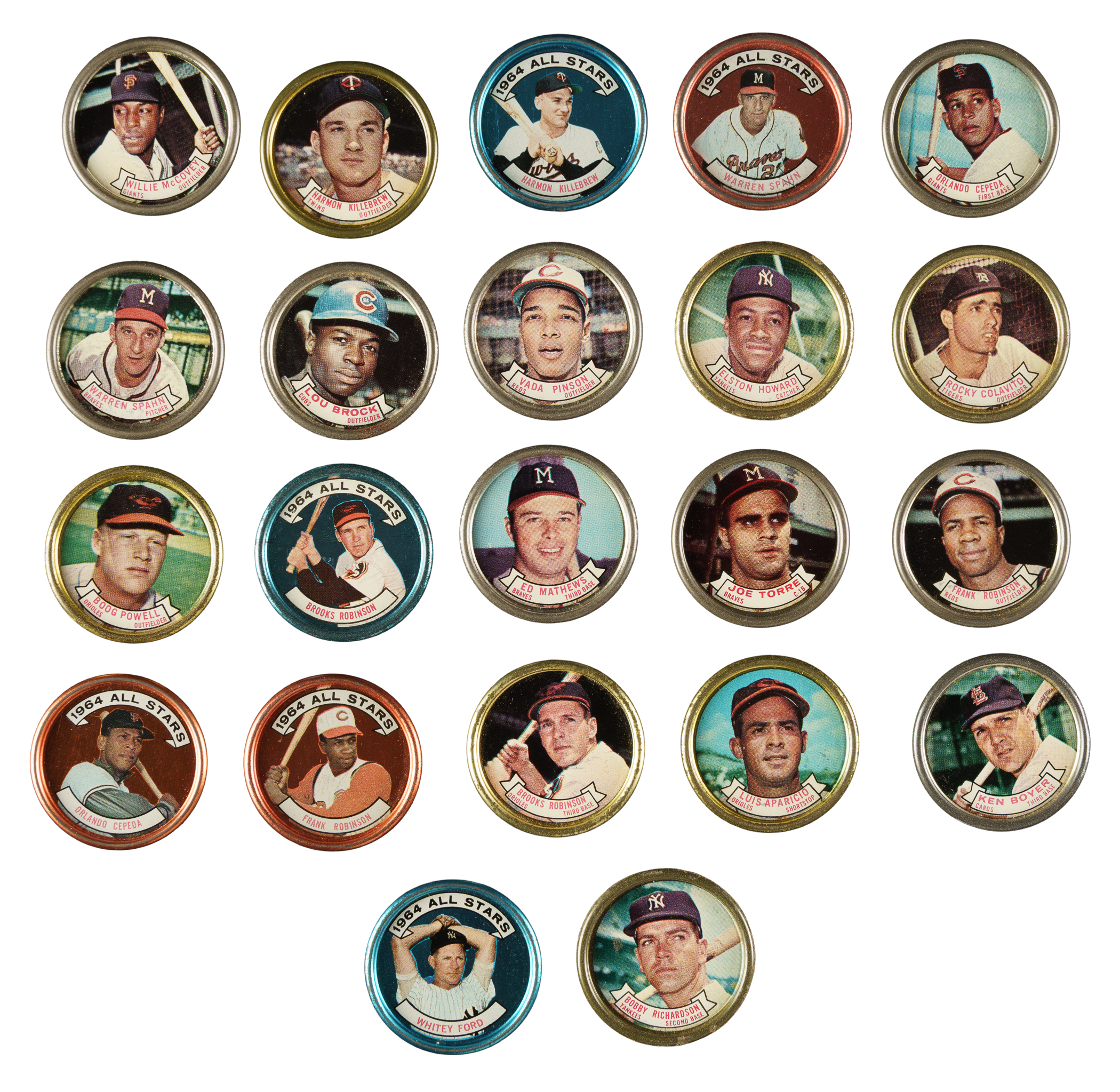 Presented is a collection of twenty-eight 1964 Topps metal coins highlighted by Roberto Clemente, Willie Mays, and Ernie Banks. These metal coins were issued as special inserts by Topps in baseball card wax packs. The collection includes nineteen coins from the regular series (#1-120) and nine coins from the All-Star series (#121-164). Condition is 11% Nr/Mt, 43% Ex to Ex-Mt, and 46% Vg to Vg-Ex. This collection consists of the following: #18 B. Robinson (Ex), 22 McCovey, 23, 25, 31 Aparicio, 33 Mathews (Vg-Ex), 37 F. Robinson, 42 Banks (Vg-Ex), 45, 46, 55 Clemente (Ex), 59 Gibson, 63 Cepeda, 72 Richardson, 88 Spahn, 97 Brock, 104, 112 Killebrew (Ex), 118, 125 B. Robinson AS, 129 Kaline AS, 133 Killebrew AS, 139 Ford AS, 142 Cepeda AS, 150 Clemente AS (Vg), 151 Mays AS (Vg), 154 F. Robinson AS, and 160 Spahn AS. Total: 28 coins.