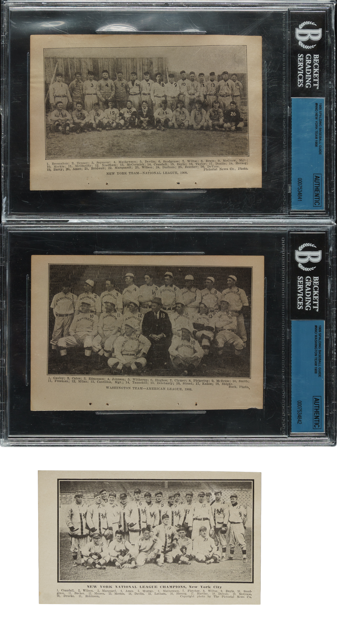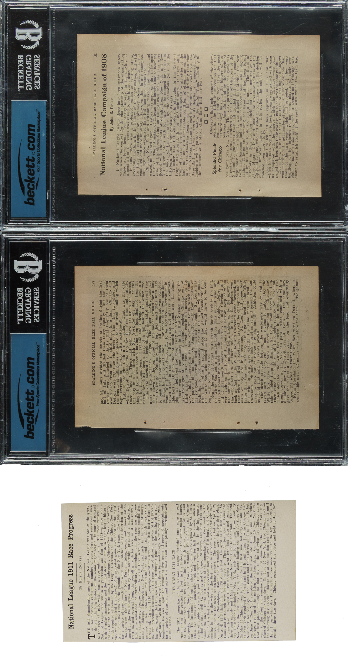 Trio of 1909 Spalding Baseball Guides, two graded and encapsulated Authentic by Beckett. This trio consists of the following: New York Giants (trimmed, otherwise Vg), New York Yankees (Beckett) and Washington Nationals (Beckett). Total: 3 cards. The size/weight of this item requires that there will be an additional shipping charge for this lot.