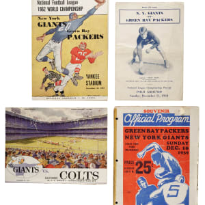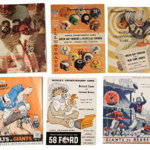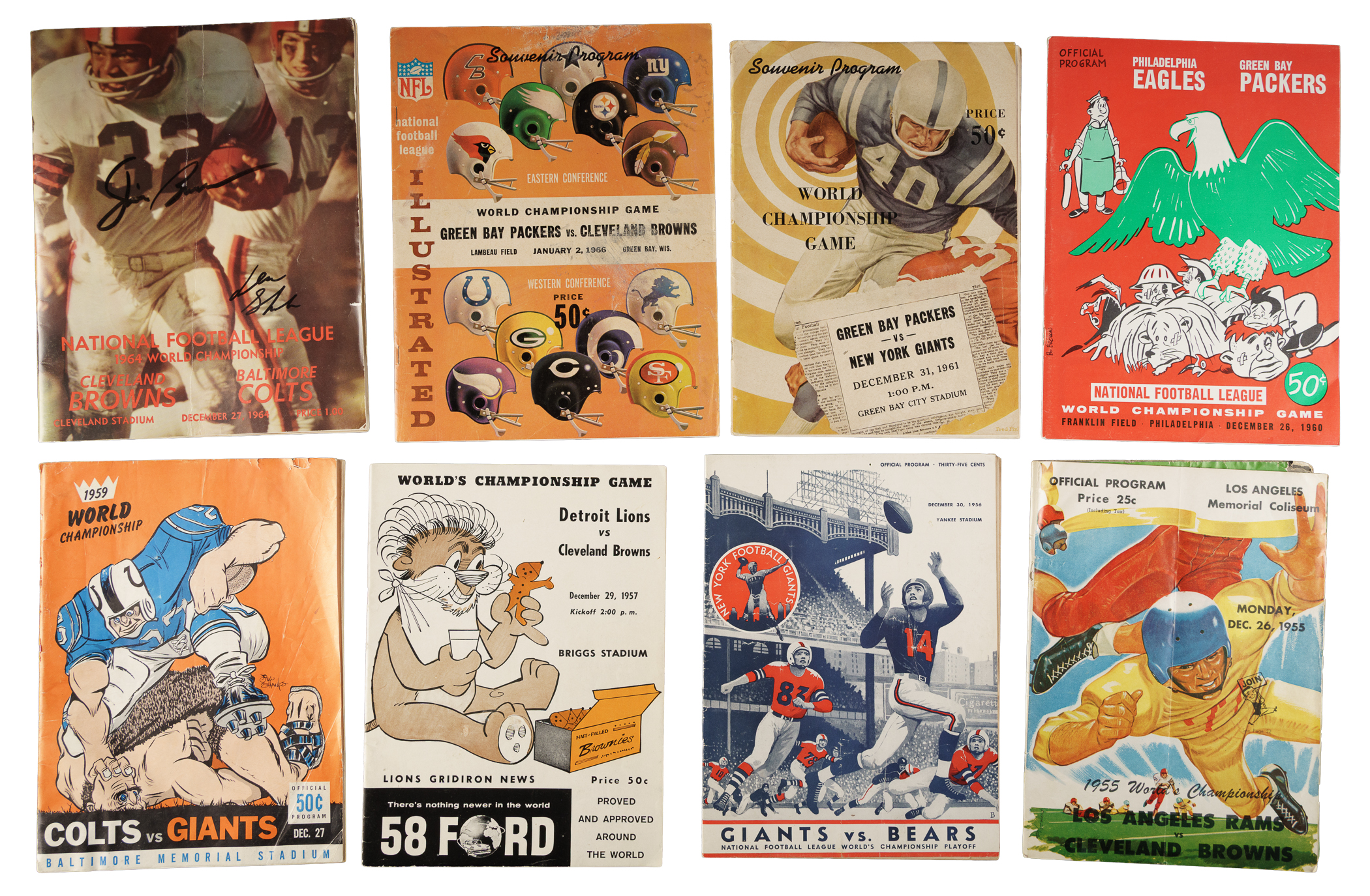 Presented is a near-complete run of NFL Championship programs issued between the years 1938 to 1966. Missing 1940, 1941, 1953, and 1965 for completion.The first four issues and 1958 ("The Greatest Game Ever Played") grade as follows: 1) 1938. Pr with heavy creasing. 2) 1939. Pr with heavy creasing, a tape repair along the spine, and multiple edge tears. 3) 1942. Vg-Ex with normal handling wear. 4) 1943.Vg with scattered creasing and the name of the original owner written on the front. 5) 1958. Pr with heavy creasing and multiple edge tears. The remainder of the programs range in condition from Pr to Ex, averaging Gd. Please note that the two signatures appearing on the front cover of the 1964 program, including Jim Brown, failed JSA authentication. The size/weight of this item requires that there will be an additional shipping charge for this lot.Total: 24 programs.