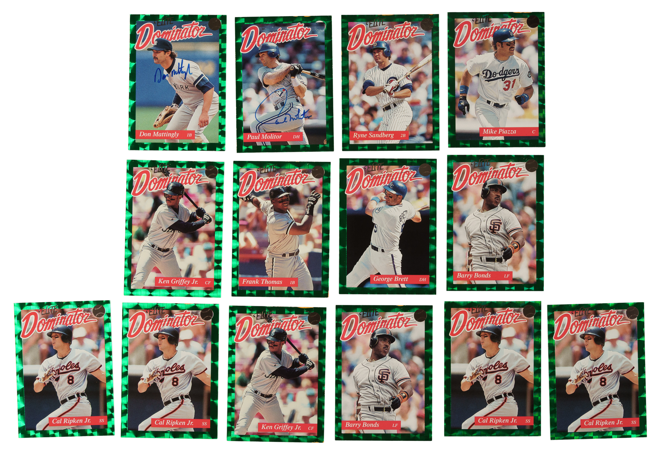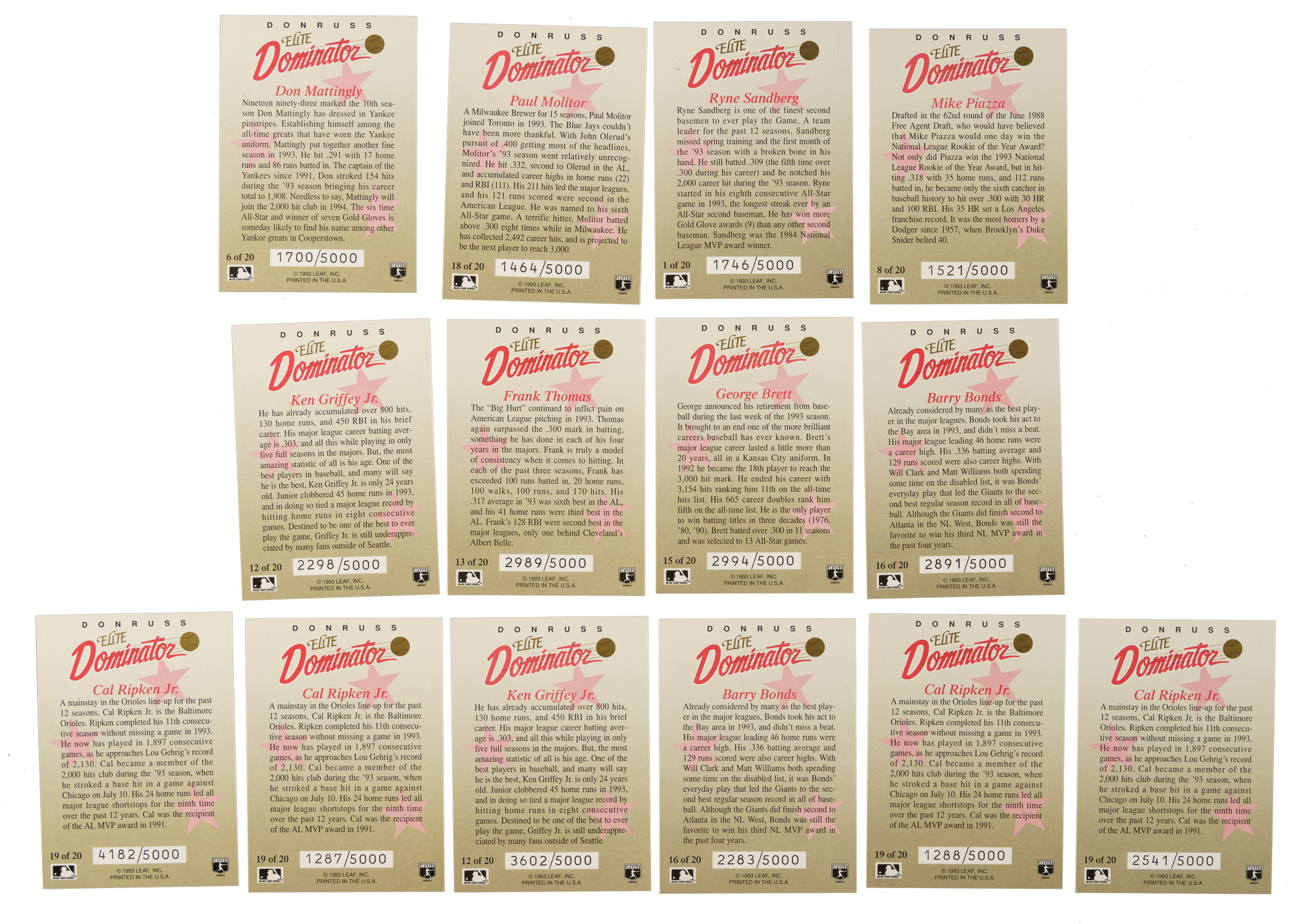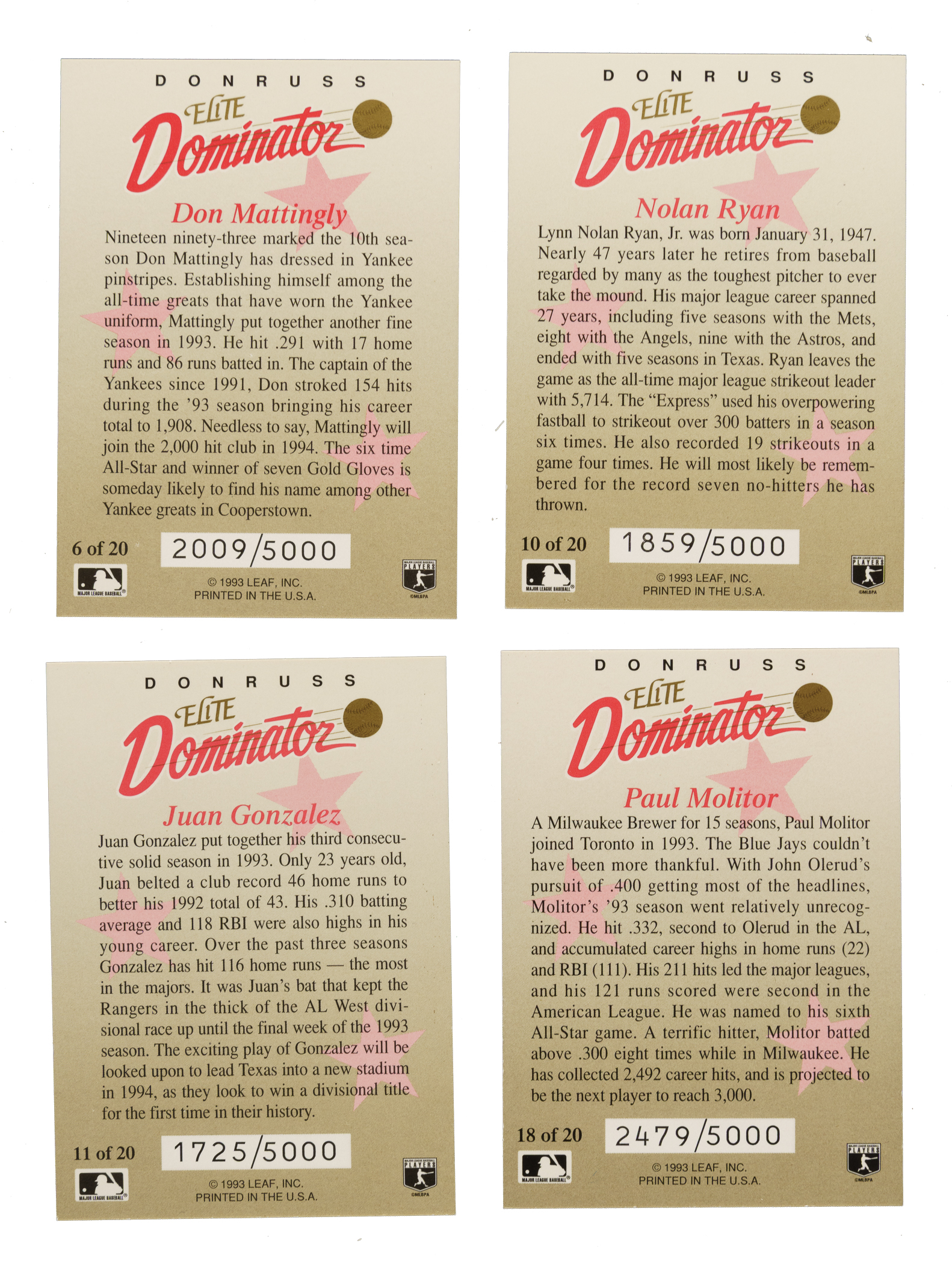 Presented is a near-complete set of Donruss 1993 Elite Dominator consisting of nineteen different cards, out of twenty in the set, plus eleven duplicates. All cards are serial numbered to 5,000. Of the thirty cards in this collection, six are signed (two Mattingly, Ryan, Gonzalez, and two Molitor). Missing only #7 for completion. The cards range in grade from Ex to Nr/Mt-Mt (averaging Ex-Mt/Nr/Mt), including a couple lesser. Duplicates (11): #1, 5, 6, 11, 12, 15, 16, 18, and three 19. Total: 30 cards. Auction LOA from James Spence/JSA.