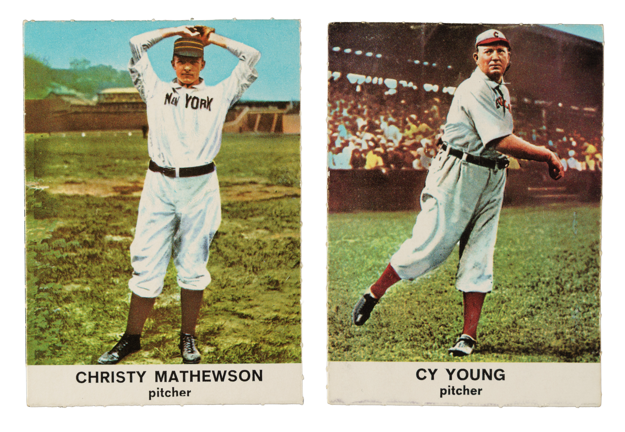 Presented is a near-complete set (29/33) of 1961 Golden Press cards plus fourteen duplicates. Missing the following four cards for completion: #3 Ruth, 9 DiMaggio, 16 Gehrig, and 25 Cobb. Condition is 40% Ex to Ex-Mt (including 15% Nr/Mt), 39% Vg to Vg-Ex, and 21% Gd (including 11% lesser). Keys: #5 Terry (signed), two #24 Mathewson (Nr/Mt and Vg-Ex), 29 Johnson (Gd due to spot of paper loss), 32 Wagner (Ex), and 33 Young (Gd-Vg). Total: 43 cards (near-complete set of 29 plus 14 duplicates). Auction LOA from James Spence/JSA. The size/weight of this item requires that there will be an additional shipping charge for this lot.