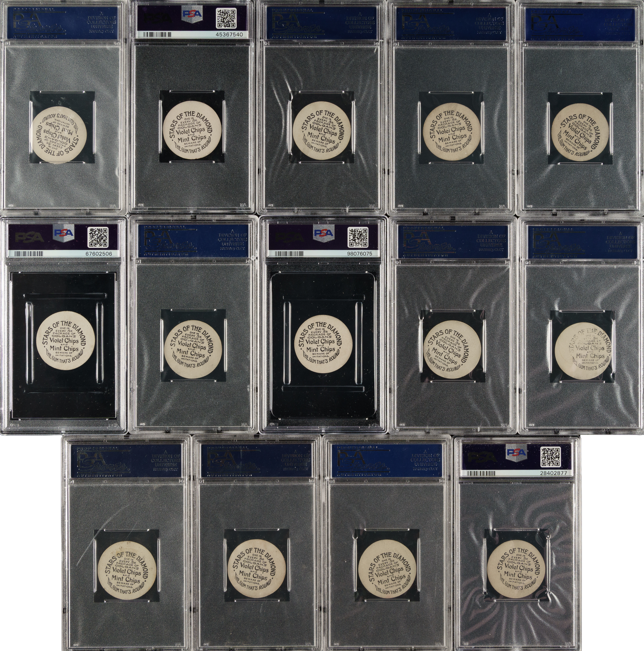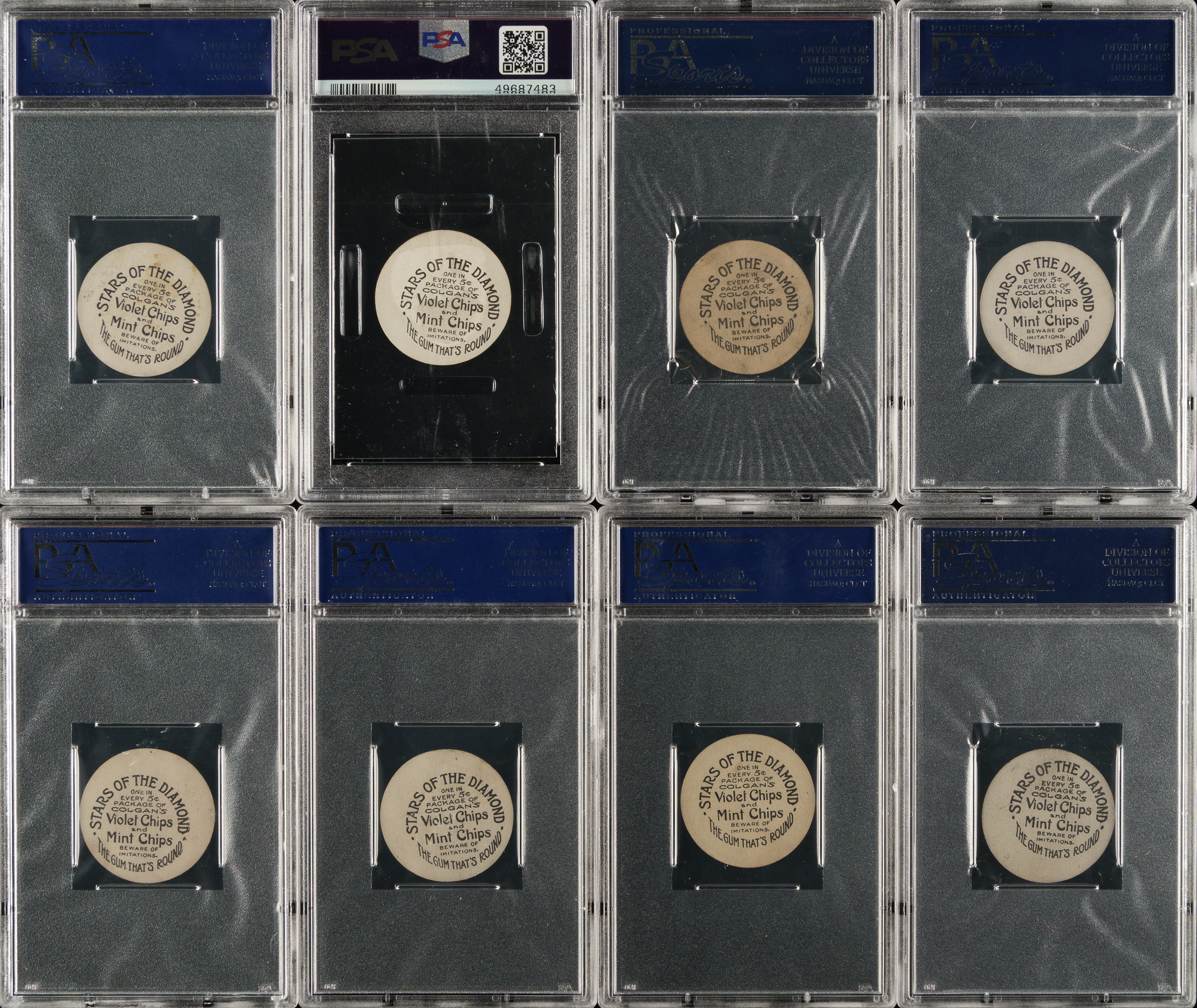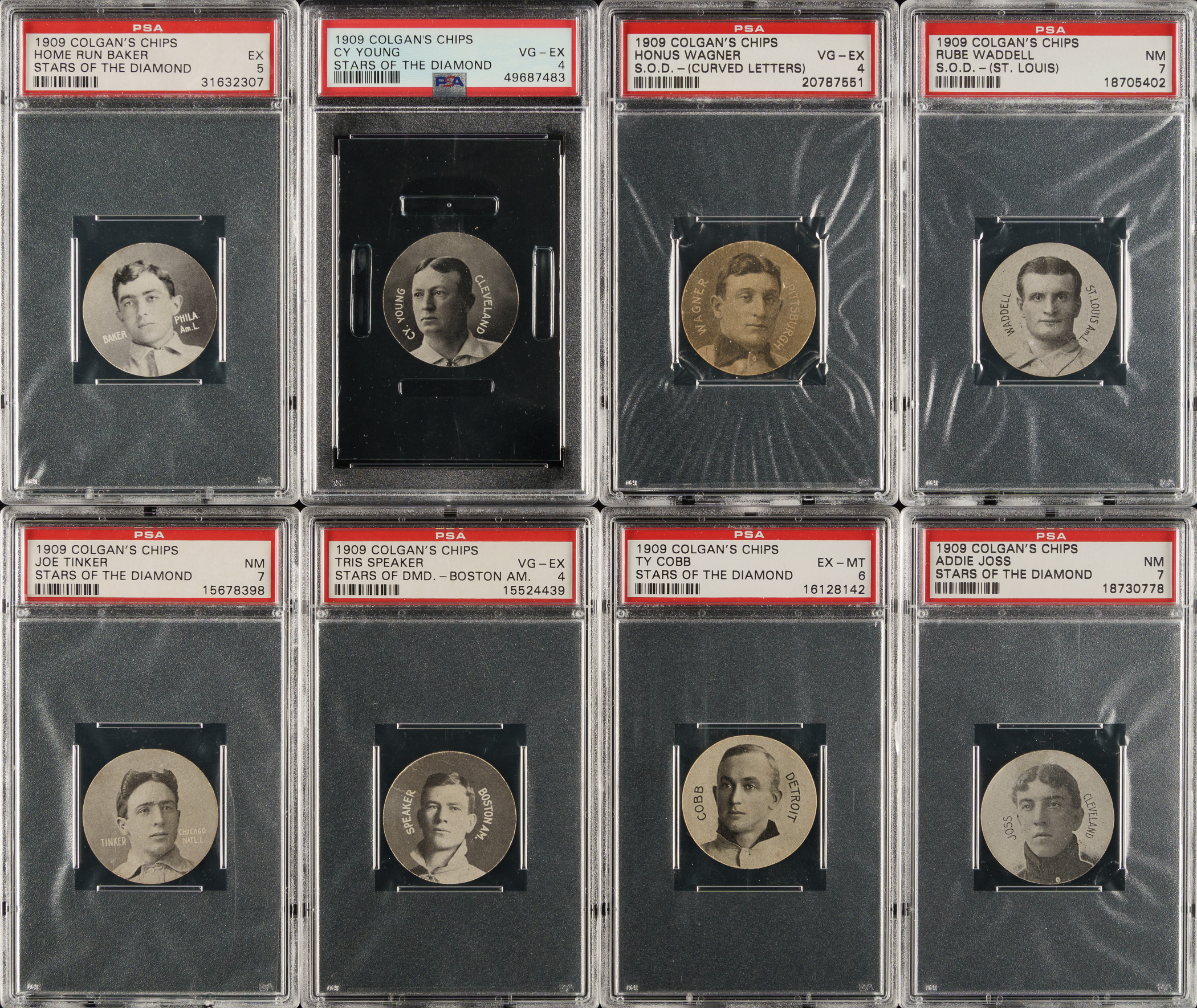 Among the most unusual and distinctive cards ever produced are the 1909-1911 E254 Colgan's Chips series. The cards are actually circular (1-7/16 inches in diameter) and were issued as inserts with Colgan's Chips ("The Gum That's Round") in the round Colgan's Chips gum tins. Offered is a substantial collection of 270 different E254 Colgan's Chips cards featuring 219 different subjects and 51 variations, representing a very impressive assemblage of these classic and unusual cards. Entirely graded and encapsulated by PSA, this incredible set currently ranks first on the PSA Set Registry with an impressive overall GPA of 5.03. Please note the PSA registry lists two cards in the offered set incorrectly: Gardner (currently listed as a NM-MT 8 but is actually a VG-EX 4) and Konetchy (currently listed as a MINT 9 but is actually a NM-MT 8). According to the PSA checklist, this set is missing the following 24 cards for completion: Austin/St. Louis, Beaumont/St. Paul, Beumiller, Clarke/Pittsburgh, Coveleski/Chattanooga, Gardner/New York, Hahn, Halla/small letters, Lakoff, Lord, Manser/Rochester, Murch/Chattanooga, Orth/Indianapolis, Reilly/Reilley, Reilly/Louisville, Ritchey, Schardt/Birmingham, Seabaugh/looking straight, Sparks/Richmond, Stansberry/Louisville, Unglaub/Lincoln, Wiesman, Wilson/Indianapolis, and Woodruff/Indianapolis. The lot is composed of seven MINT 9s, two NM-MT+ 8.5s, thirty-six NM-MT 8s, twenty-eight NM 7s, one EX-MT+ 6.5, thirty-eight EX-MT 6s, forty-two EX 5s, three VG-EX+ 4.5s, fifty VG-EX 4s, twenty-one VG 3s, four GOOD+ 2.5s, twenty-five GOOD 2s, three FR 1.5s, and ten PR 1s. This substantial collection is highlighted by all 19 Hall of Famers, including Ty Cobb, Addie Joss, Tris Speaker, Honus Wagner, and Cy Young.