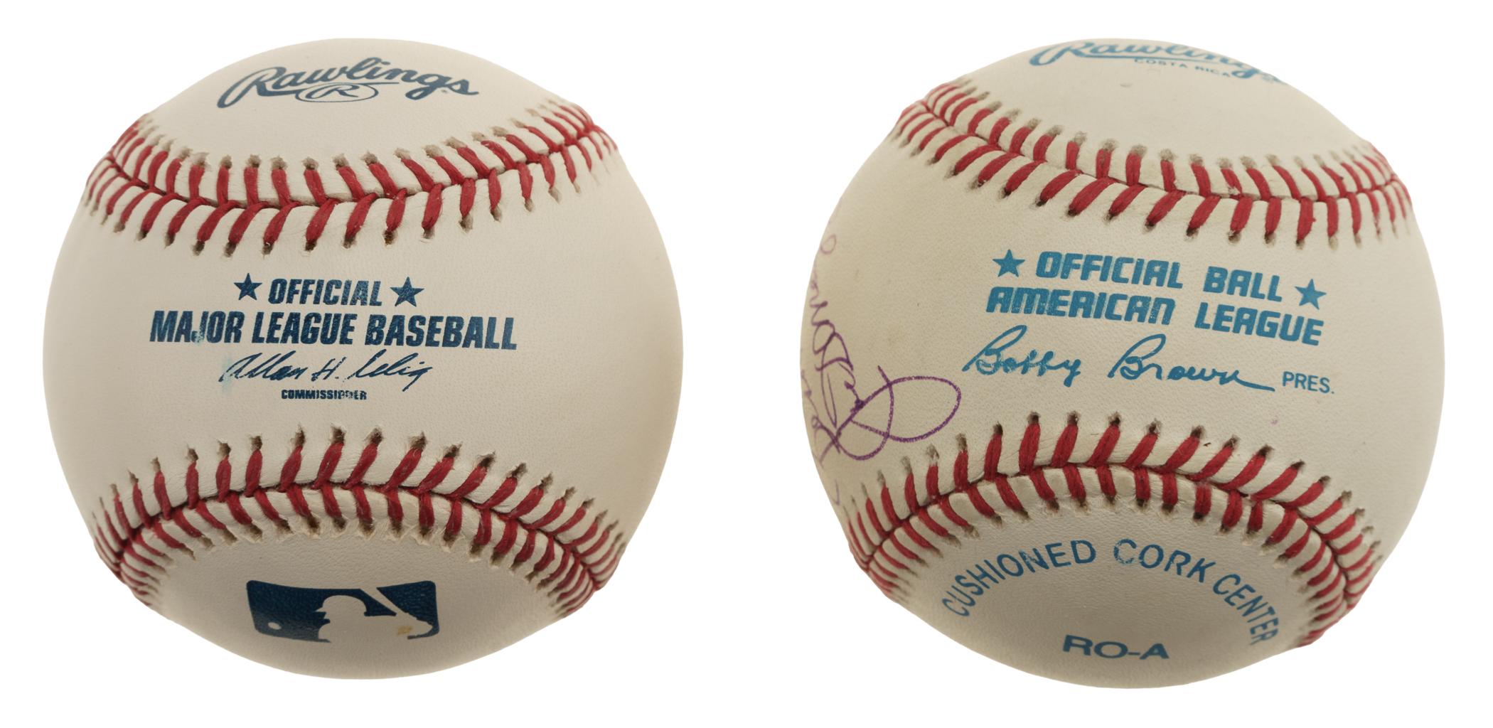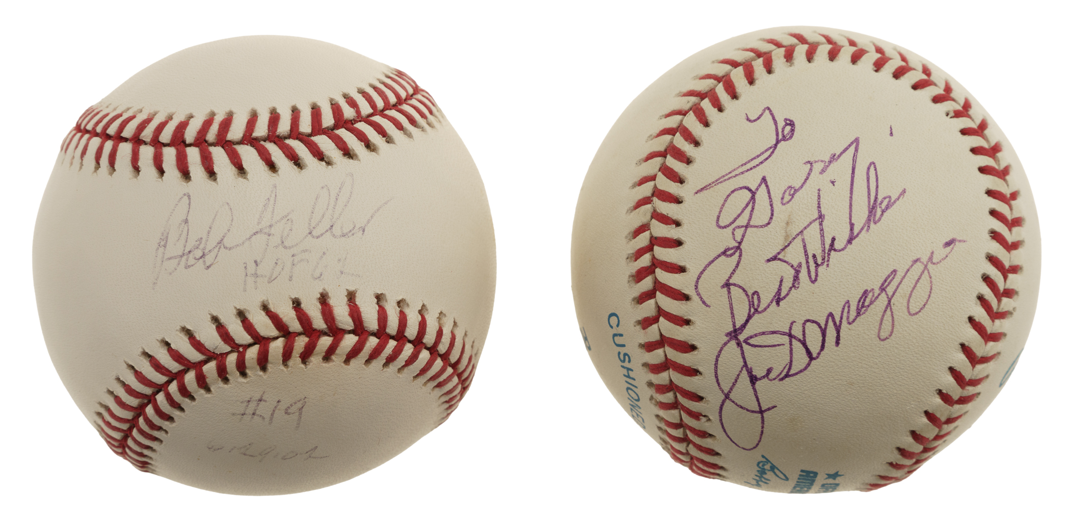 Pair of single-signed baseballs, featuring New York Yankees and Cleveland Indians Hall of Famers Joe DiMaggio and Bob Feller. Total: 2 baseballs. Auction LOA from James Spence/JSA. The size/weight of this item requires that there will be an additional shipping charge for this lot.