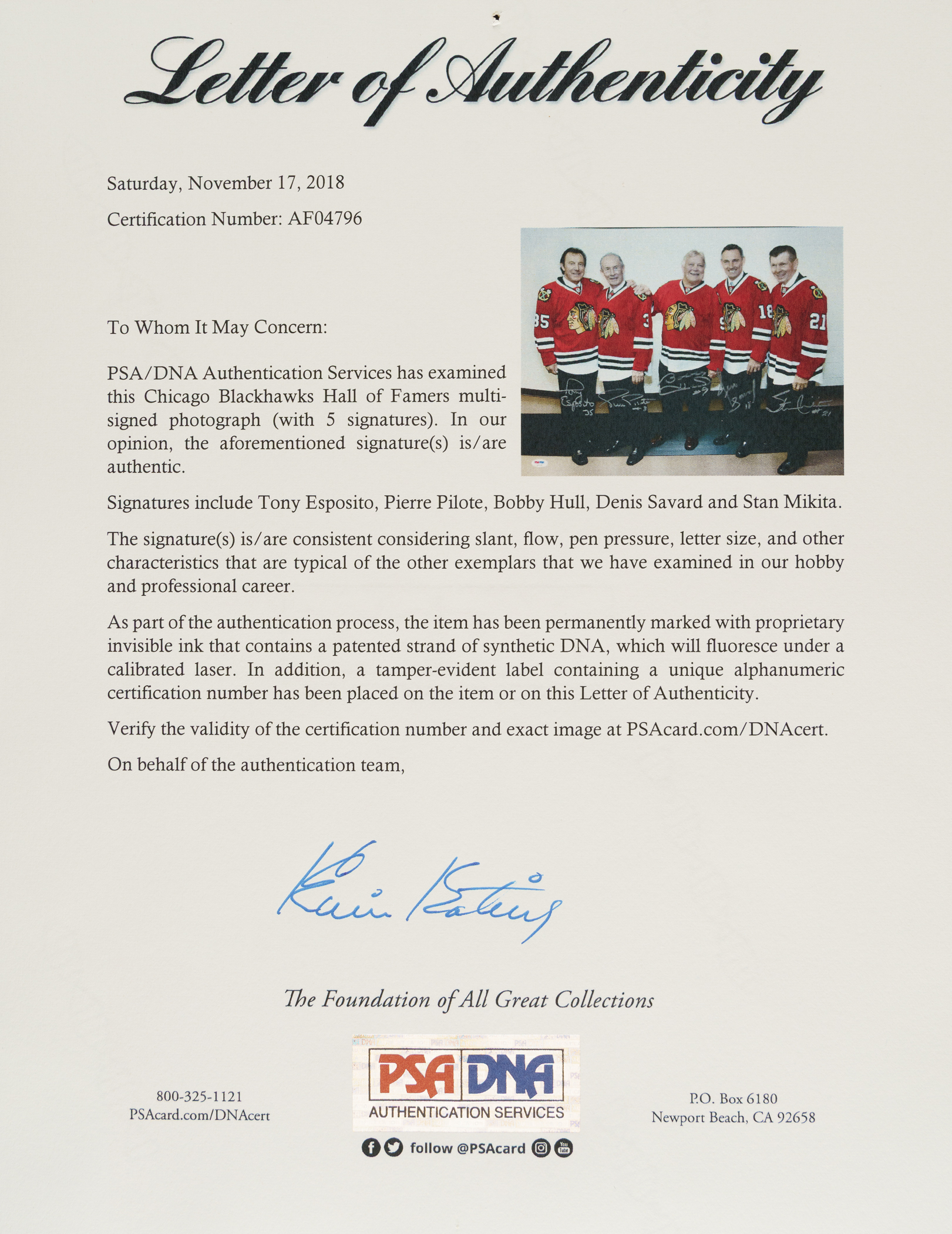 Chicago Blackhawks hockey Hall of Fame multi-signed photograph. This photograph includes the following signatures: Tony Esposito, Pierre Pilote, Bobby Hull, Senis Savard and Stan Mikita. Total dimensions: 16 x 20 Inches. Full LOA from PSA/DNA. The size/weight of this item requires that there will be an additional shipping charge for this lot.