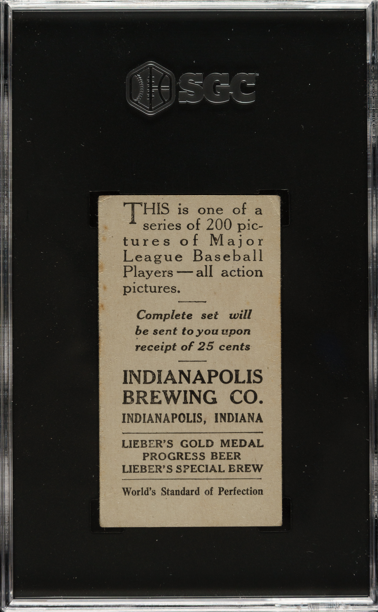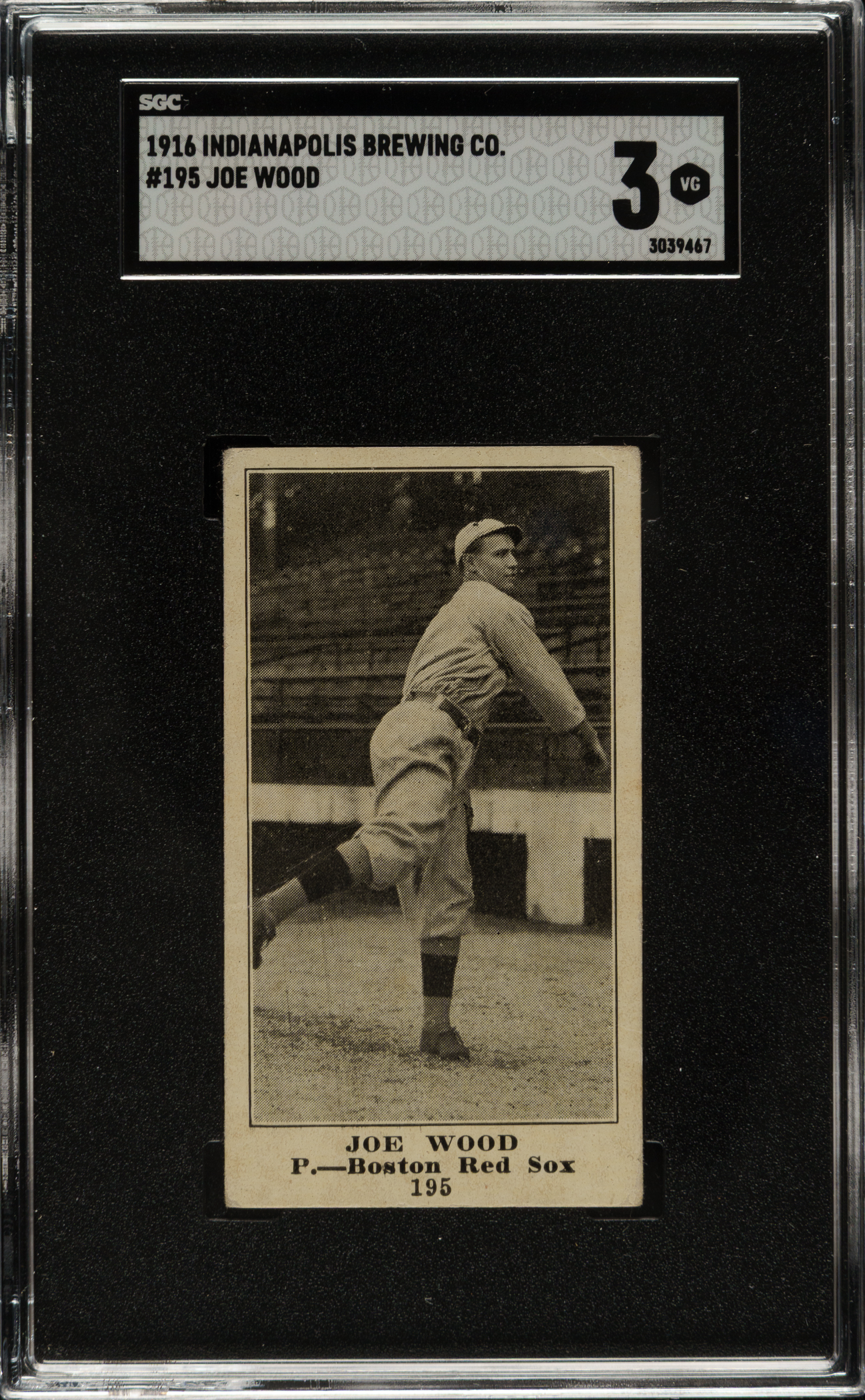 Graded VG 3 by SGC. Indianapolis Brewing is an exceedingly rare back for any M101-4, let alone for a star pitcher such as Joe Wood. The 1916 Indianapolis Brewing Co. set is identical in design to M101-4 and M101-5 Sporting News (as is the case with all the M101-4 and M101-5 sets issued by various local establishments) but with advertising on the reverse for the "Indianapolis Brewing Co. – Indianapolis, Indiana." This is a great card with any back, but the advertising reverse in this case certainly does deserve prominent mention and potentially adds a very special dimension of interest. This card has a bright and crisp image, even corner wear, and a small crease on the upper right. The reverse advertisement for Indianapolis Brewing Company is boldly printed in black. This is a very attractive, mid-grade example worthy of the finest Joe Wood, Boston Red Sox, or rare vintage baseball-card collection.