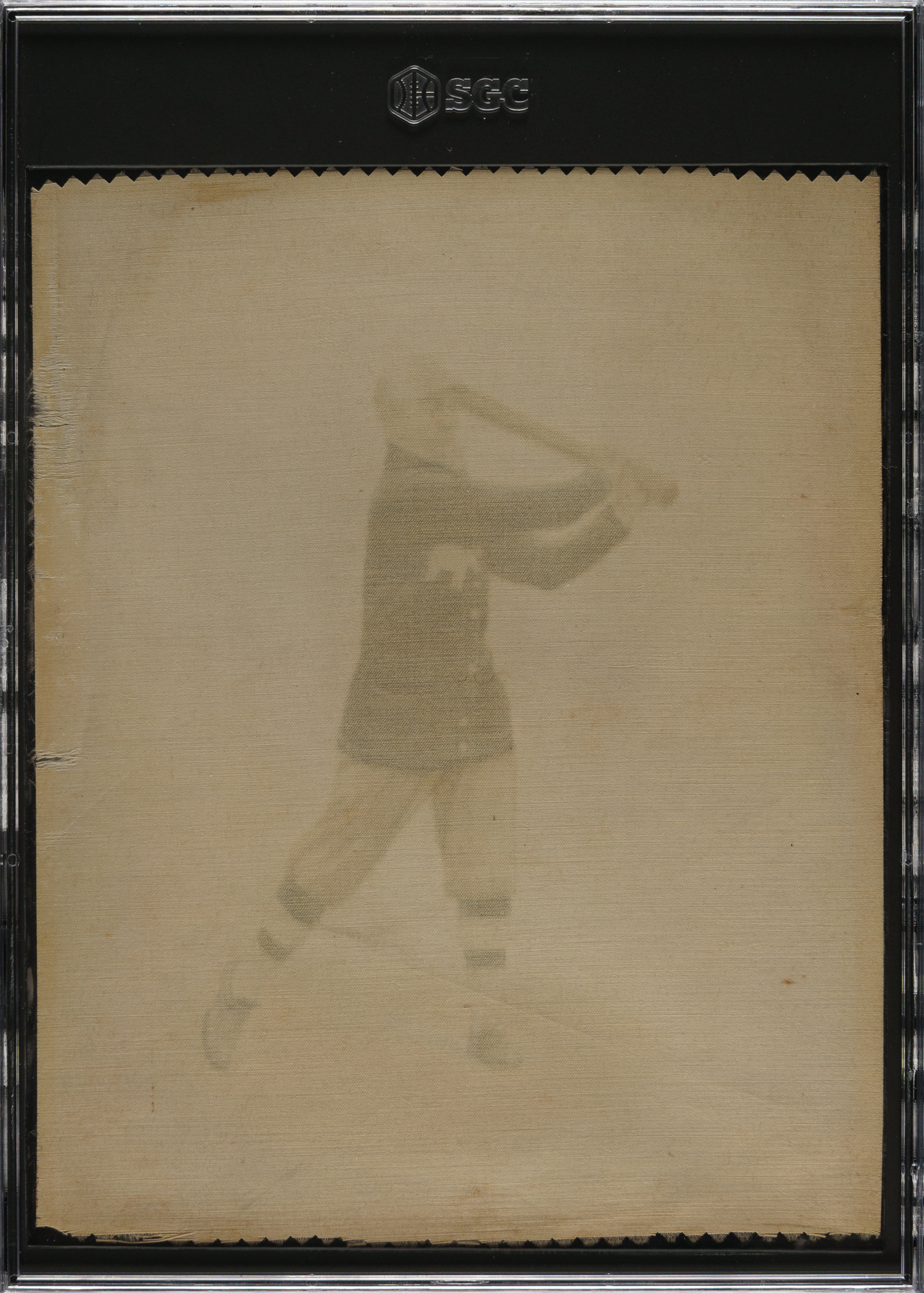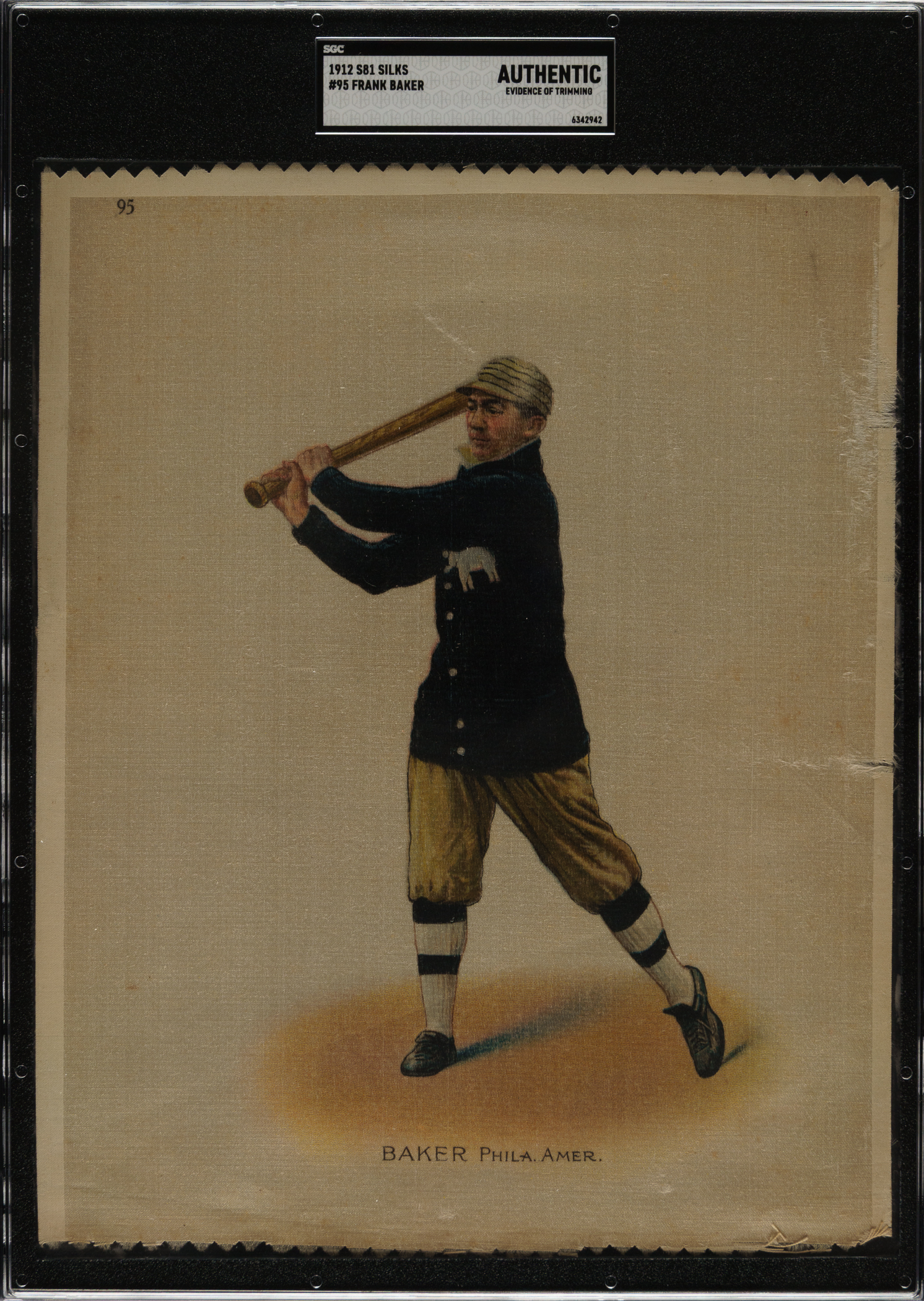 Rarely offered example of Philadelphia Athletics Hall of Famer Frank "Home Run" Baker from the 1912 S81 Large Silk tobacco-premium issue. S81 silks could be obtained only by mail, in exchange for 20 Helmar Tobacco gift coupons per silk. The redeemable coupons were inserted one coupon per pack, so it is not surprising that these premiums are extremely rare. Baker is one of the key Hall of Famers in the set, which includes 25 subjects. This is one of the rarest and most desirable of all Baker tobacco issues. Encapsulated as "Authentic" by SGC due to being trimmed on multiple edges.