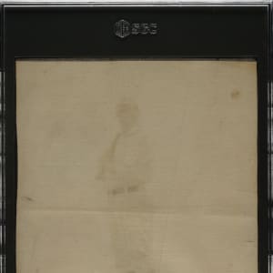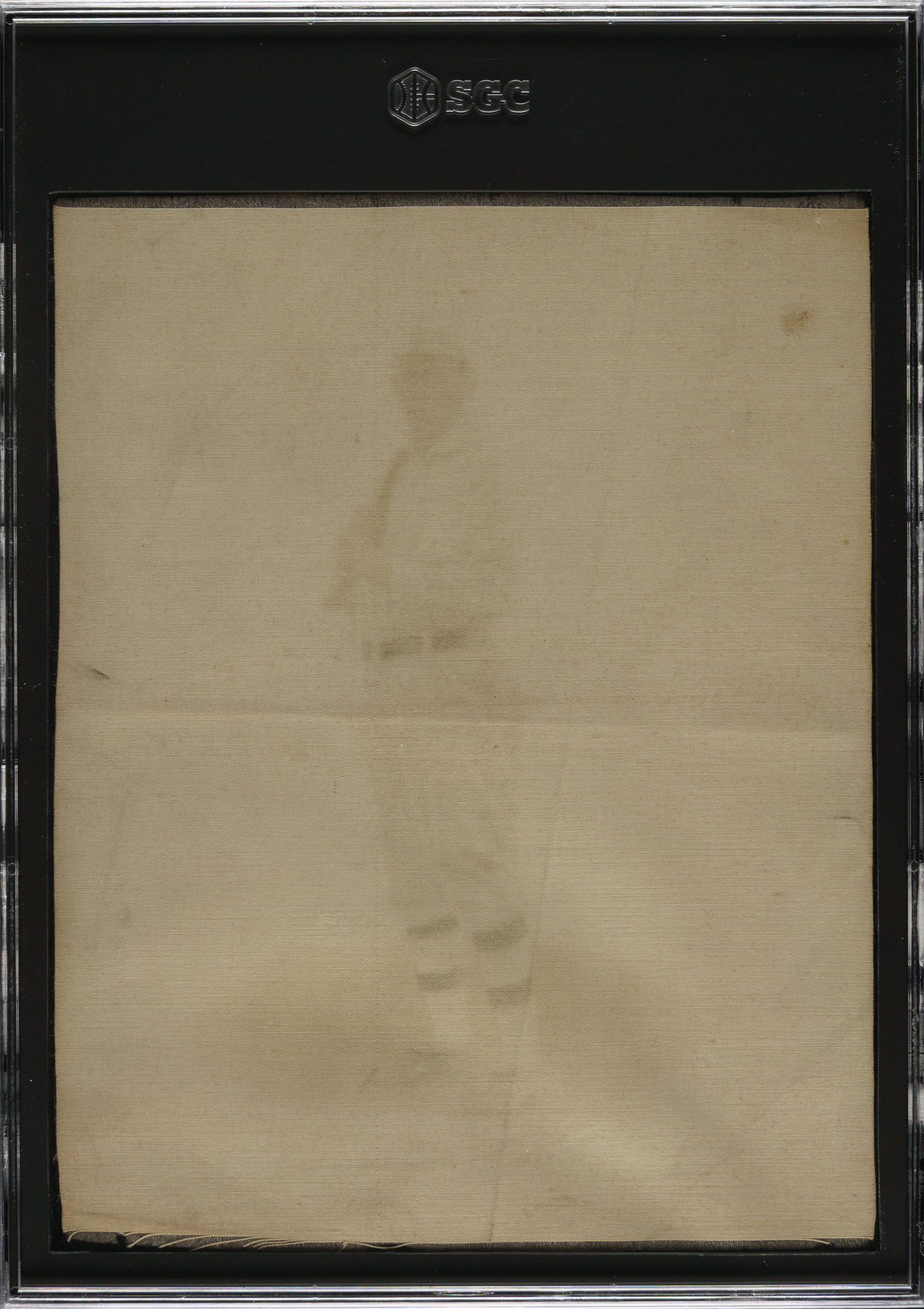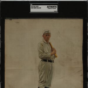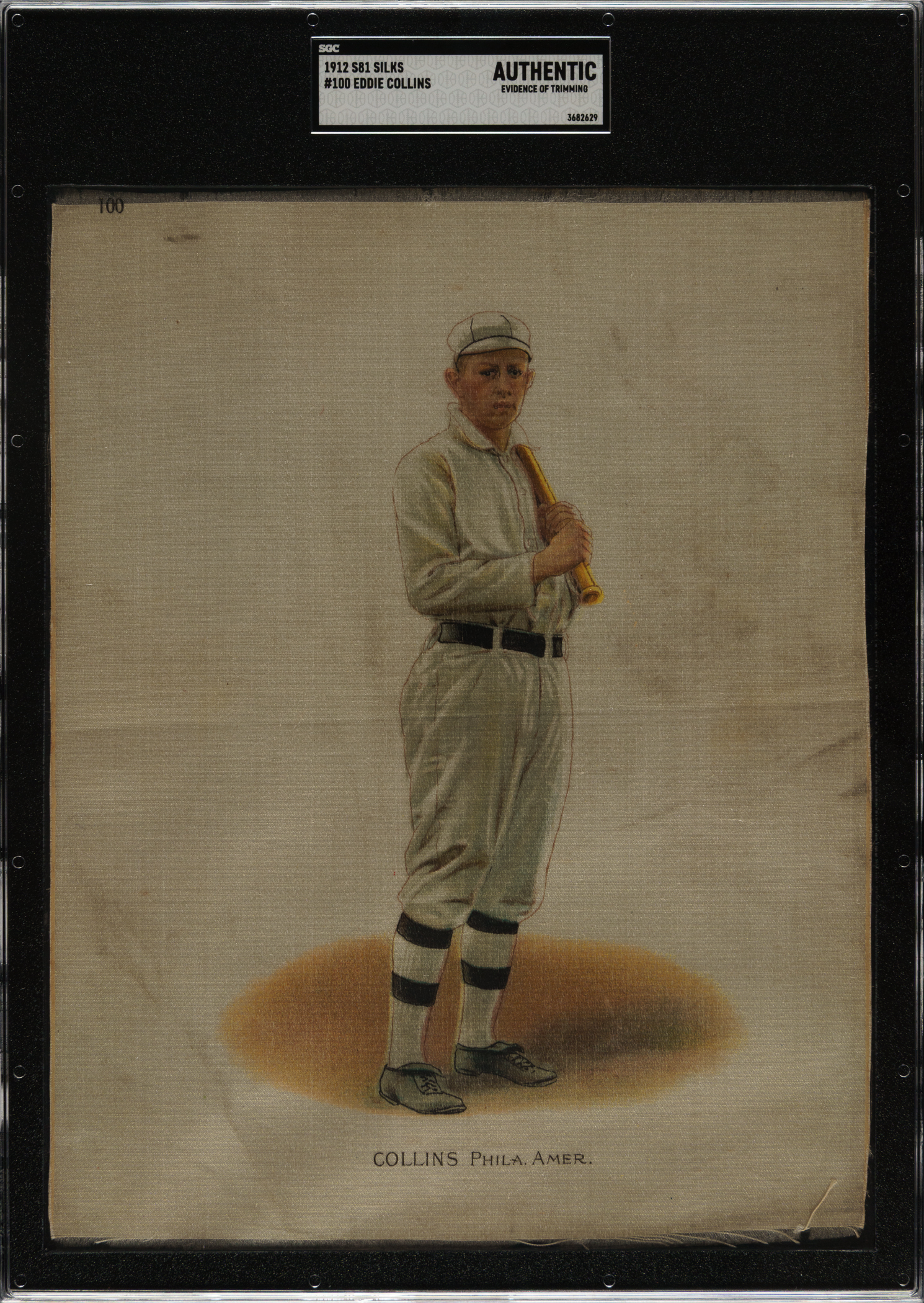 Rarely offered example of Philadelphia Athletics Hall of Famer Eddie Collins from the 1912 S81 Large Silk tobacco-premium issue. S81 silks could be obtained only by mail, in exchange for 20 Helmar Tobacco gift coupons per silk. The redeemable coupons were inserted one coupon per pack, so it is not surprising that these premiums are extremely rare. Eddie Collins is one of the key Hall of Famers in the set, which includes 25 subjects. This is one of the rarest and most desirable of all Collins tobacco issues. Encapsulated as "Authentic" by SGC due to being trimmed on multiple edges.