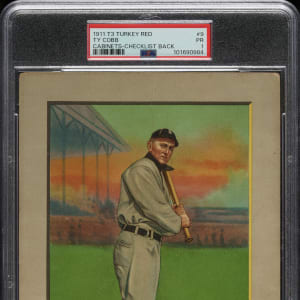 Presented is one of vintage-card collecting's most recognizable icons and the key card of the 1911 Turkey Red Tobacco cabinet-card series: #9 Ty Cobb. Besides being the most valuable card in the set, it is also one of the most desirable and striking of all Ty Cobb cards. This example is bright and crisp with brilliant colors and outstanding registration. The checklist back (with offer) is boldly printed. Graded POOR 1 by PSA, the flaws include moderate corner wear and heavy vertical creasing extending down the center of the card. The classic Turkey Red set is considered by many to be the most beautiful and well-made tobacco set ever issued. The T3 Ty Cobb has always and will always be in high demand, especially a modestly graded example which presents with strong eye appeal.