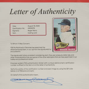 1965 Topps Roger Maris card #155, signed by him on the front. Maris' signature has been scripted in black ink across his image (slightly faded). This is just the second signed example of this particular card we have ever offered. In Good condition overall. An attractive and desirable signed Maris card dating to his time with the New York Yankees. Full LOA from PSA/DNA.