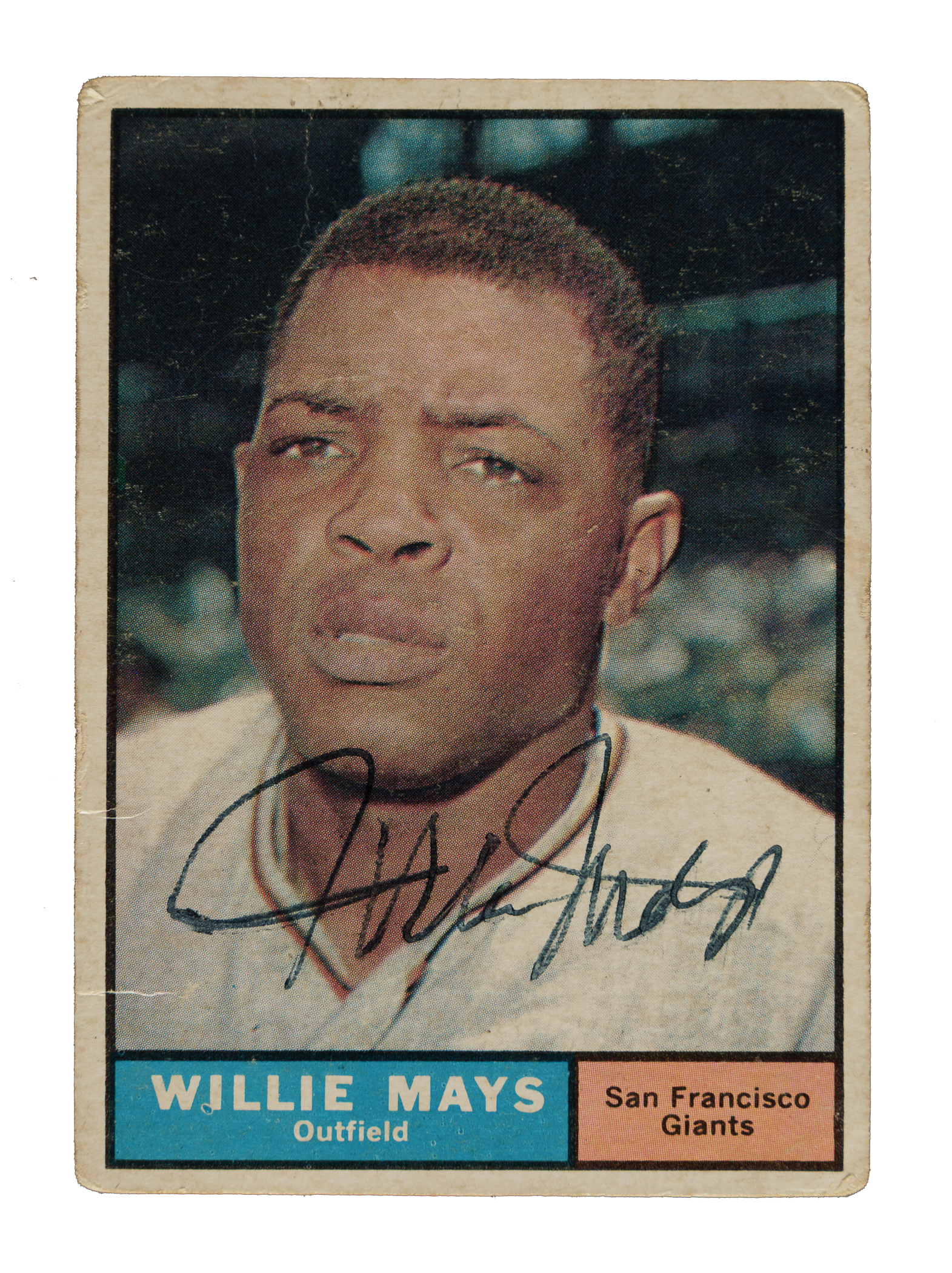 Signed example of San Francisco Giants Hall of Famer Willie Mays' 1961 Topps card. Mays has written his name in black ink. Vintage autographed baseball cards have become extremely popular among collectors in recent years, especially those from classic issues signed by prominent Hall of Famers. The card is in Fair condition. PSA/DNA certification sticker affixed to the reverse.