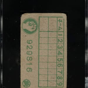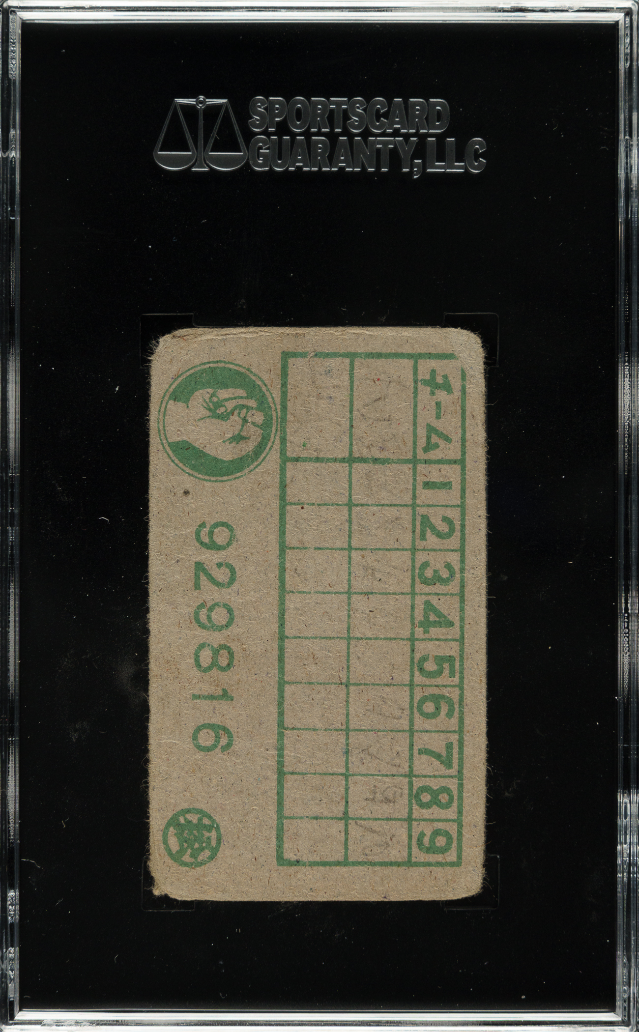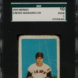 Graded POOR 10 by SGC. Modestly graded rookie-year example of Japanese baseball superstar Sadaharu Oh from the 1959 Menko JCM32E issue. The offered card has a vibrant blue and green background, a crisp image, heavy creasing, and rounded corners. Oh hit an astounding 868 home runs in his career, making him the all-time home run hitting champion in professional baseball. This is a visually appealing rookie card example.
