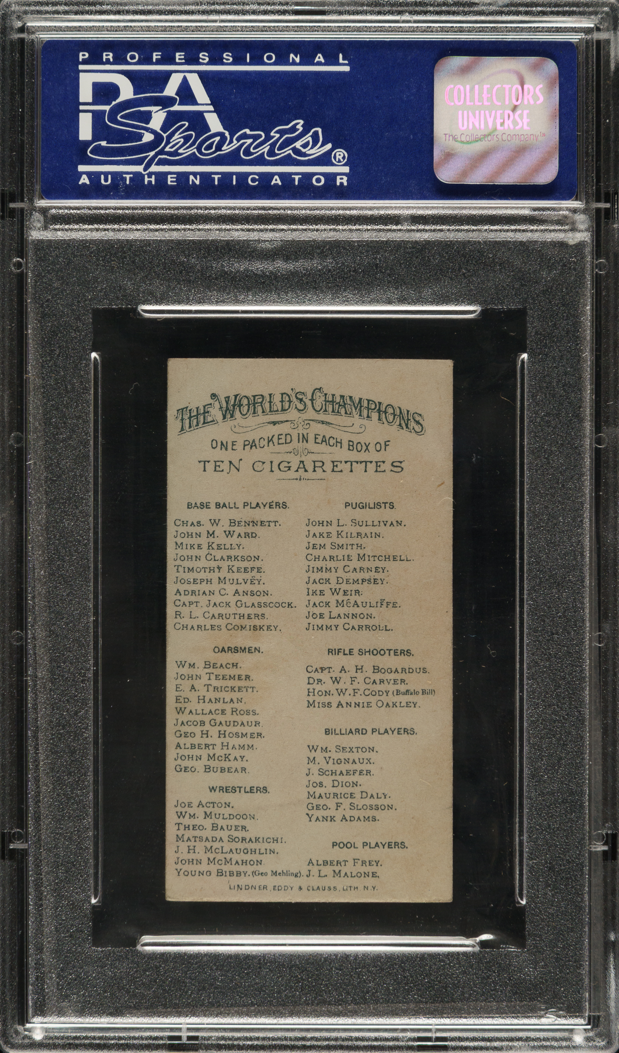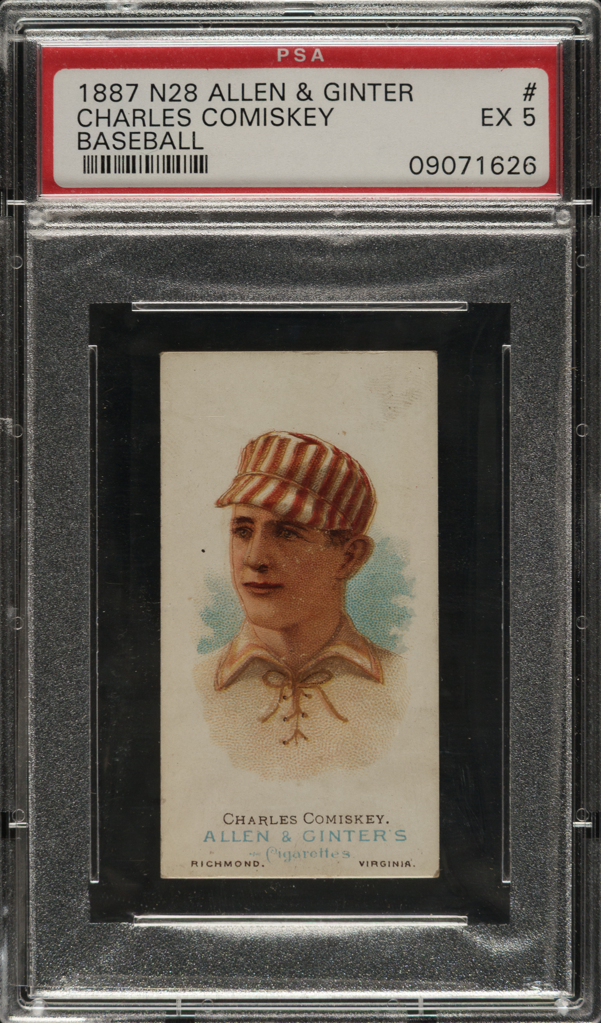Graded EX 5 by PSA. Mid-grade example of this early classic card of Hall of Famer Charles Comiskey issued during his playing days. As first-baseman/manager of the St. Louis Browns of the American Association, Comiskey led the Browns to AA League Championships in 1885, 1886, and 1887. The card displays a striking portrait image, vibrant colors, and light wear on the corners. The checklist reverse has light toning. Appealing mid-grade example of one of Charles Comiskey's most popular cards and one of the few dating from his playing days.