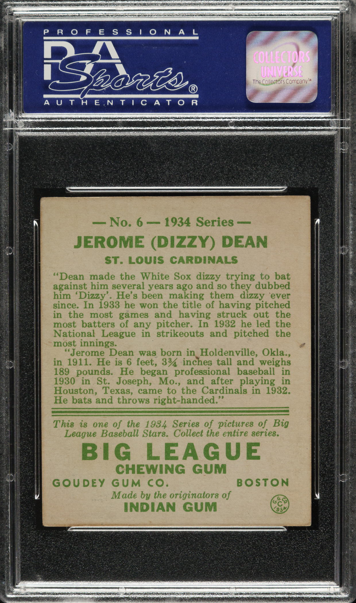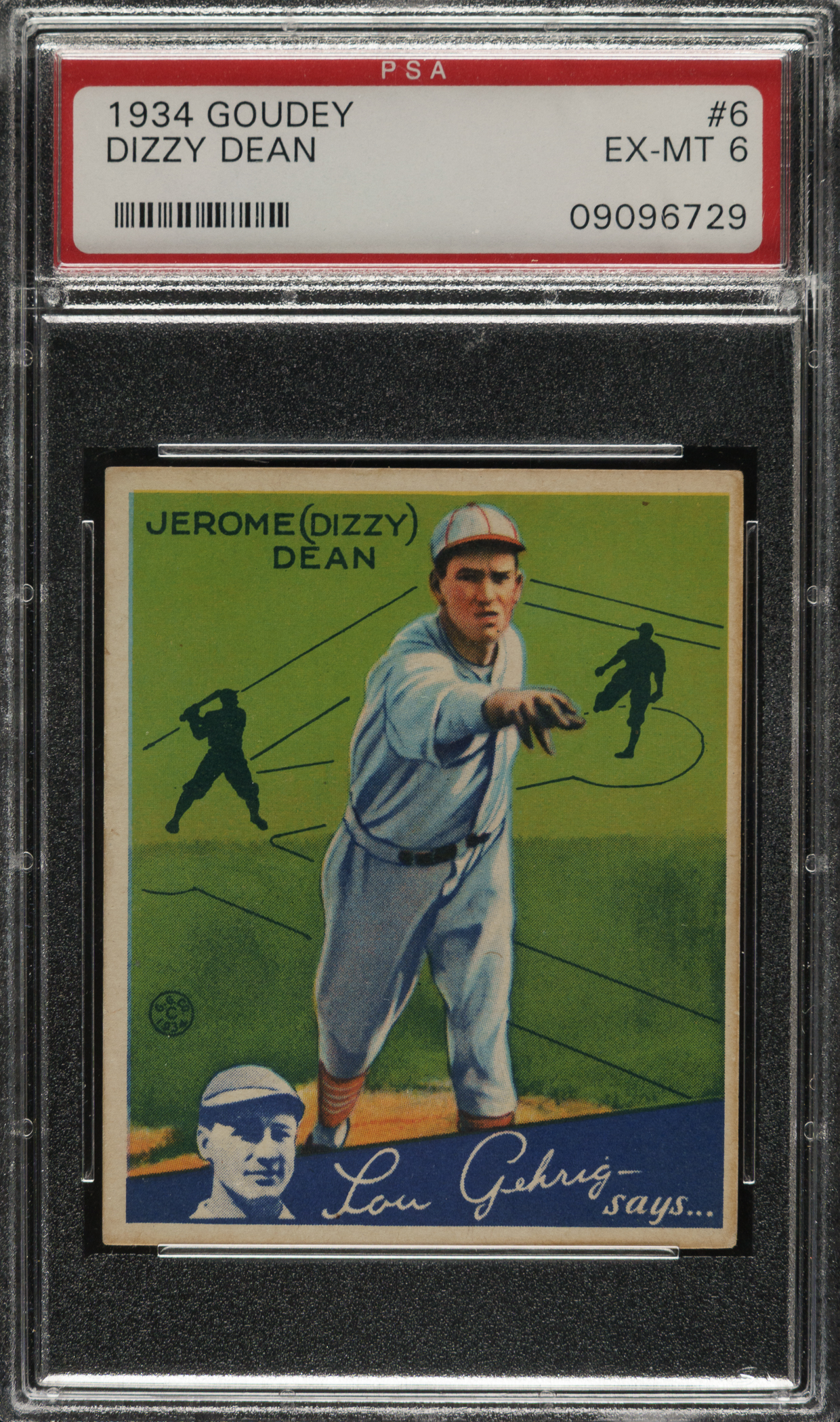 Graded EX-MT 6 by PSA. Beautiful example of St. Louis Cardinals Hall of Famer Dizzy Dean from the 1934 Goudey Gum set. Regarded by many as the greatest pitcher of all time, Dean’s pitching career began in 1932 and was brief but spectacular. From 1932 to 1936 he won 120 games, including 30 in 1934. He was also one of the game’s most popular characters and the central figure of St. Louis’ legendary “Gas House Gang” of the 1930s. The offered card has vibrant colors, a sharp image, and light corner wear. Clean reverse with boldly printed green text. This is a fantastic example of one of the most popular Hall of Famers of the 1930s.
