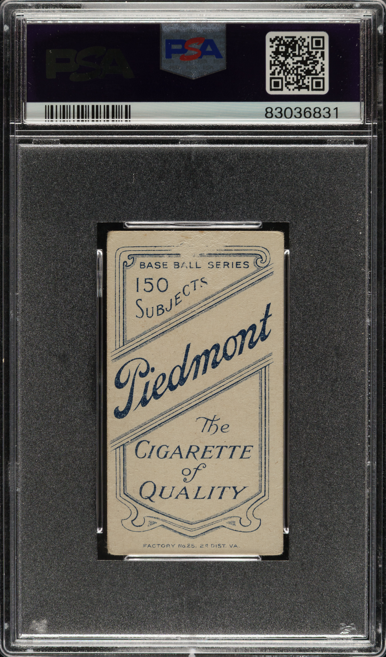 Graded GOOD+ 2.5 by PSA. Attractive T206 portrait of Cleveland Naps Hall of Famer Cy Young set against a beautiful green background. This is one of Cy Young's most striking cards and one of the most popular cards in the entire T206 set. The offered card has vibrant colors, outstanding registration, and moderate corner wear. A small spot of paper loss is visible along the top edge of the reverse. The Piedmont 150/25 advertising reverse is boldly printed.
