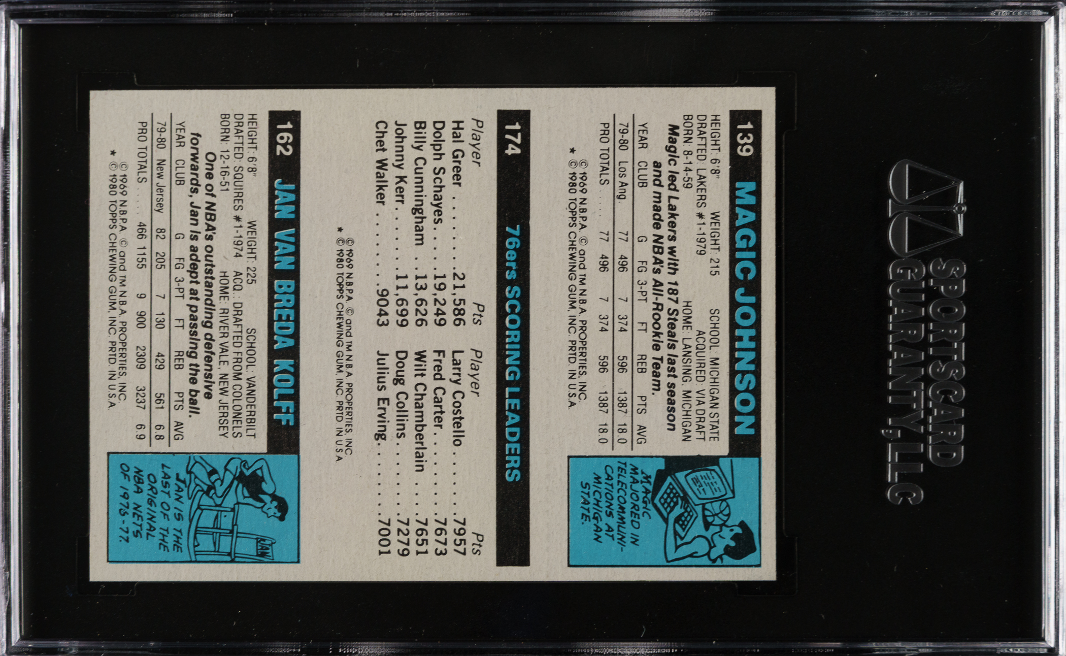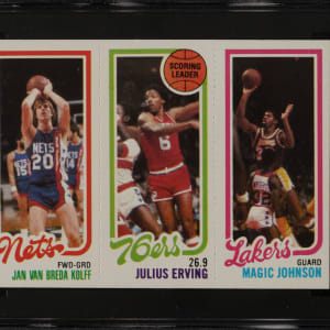 Graded MINT 96 by SGC. Basketball Hall of Famers Julius Erving (Philadelphia 76ers), and Magic Johnson (Los Angeles Lakers).