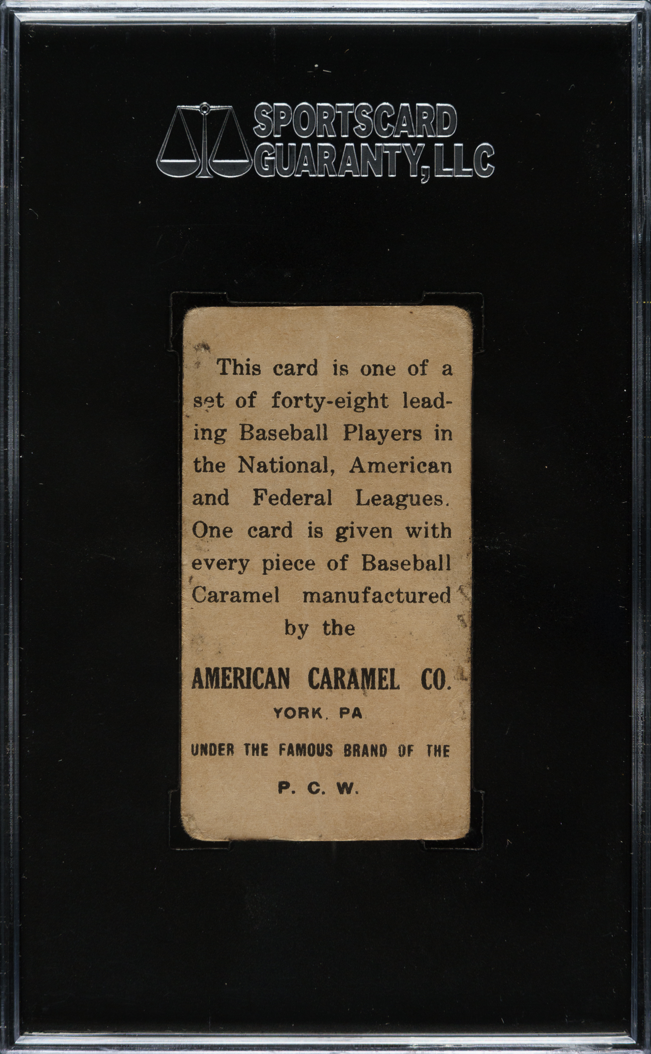 Graded VG 40 by SGC. Mid-grade E106 example of Detroit Tigers Hall of Famer Ty Cobb (batting, facing side variation). The rare 1915 E106 American Caramel issue shares designs with several other closely related candy issues (Croft's Candy, Nadja Caramels, Dockman & Sons, etc.) from the era. These cards have glossy surfaces, which are very susceptible to cracking. The offered example has brilliant colors and outstanding registration. Mostly clean reverse with bold black text. We grade this card more conservatively than SGC due to moderate corner wear, multiple spots of chipping along the white borders, and a few light creases. Caramel cards in general, are much rarer than tobacco cards of the era. Because they were issued with caramels, one card per package, and sold to children, they also tend to survive in a much lower grade. In addition to being issued a few years later than most caramel cards, E106 American Caramel Company cards are considerably rarer than most traditional "E" cards. This is a very presentable example of the legendary Ty Cobb from this rare, early twentieth-century candy issue.