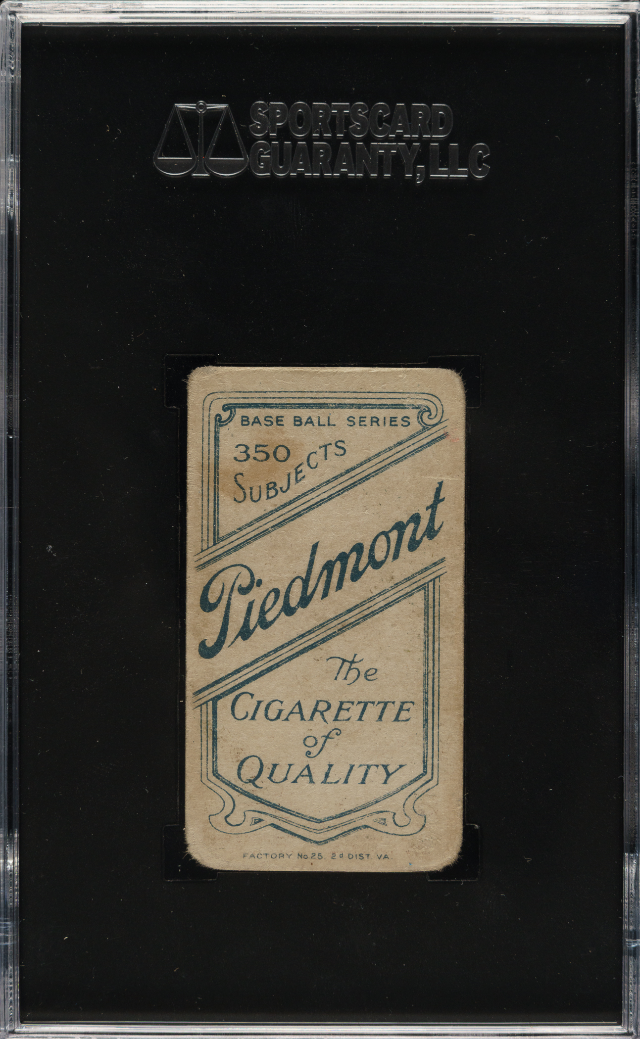 Graded GOOD 2 by SGC. Appealing example of this classic tobacco card of Detroit Tigers Hall of Famer Ty Cobb. The green-background pose has long been considered the rarest of the four poses of Cobb in the T206 set. This example exhibits brilliant colors, outstanding registration, and rounded corners. Piedmont 350/25 advertising reverse.