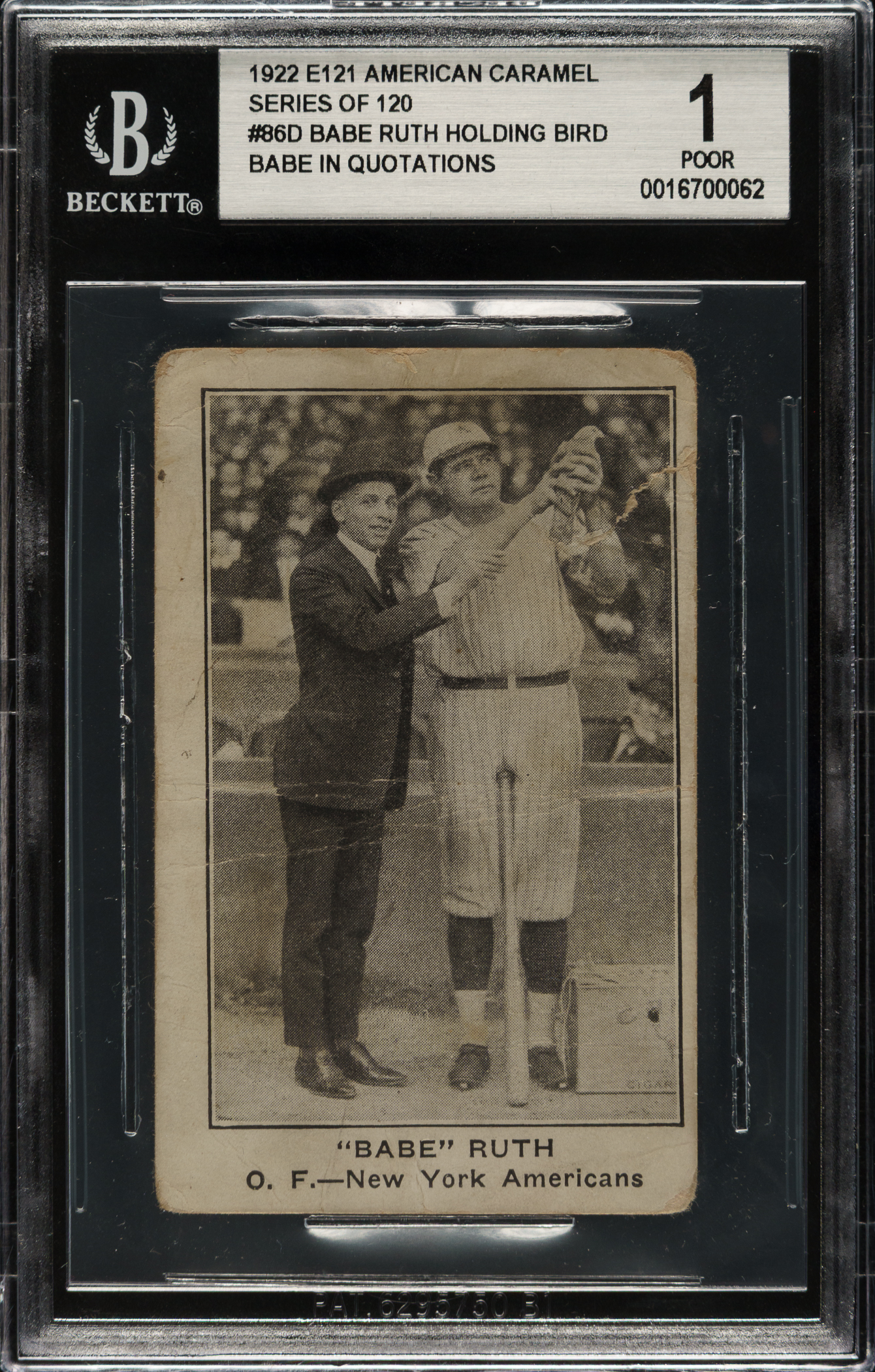 Modestly graded E121 American Caramel card of Babe Ruth, one of several different cards of Ruth in the set and certainly the most distinct and memorable. This card features one of the most unusual photographs of the Babe to ever appear on a card. He is pictured holding a bird, with an unidentified gentleman sharing the spotlight with him on the field to his right. For years, collectors wondered exactly what was happening in this photo, but the answer seemed forever lost. The mystery was solved courtesy of RMY Auctions, specialists in historic vintage photography. Its discovery of an original news photograph of this very image with a caption attached provided the answer! In this photograph, Ruth released a carrier pigeon to relay the Cleveland vs. New York game score on September 26, 1921! The gentleman at his side is Charles Farbizo, a carrier-pigeon enthusiast. Farbizo, during this game, sent the score of the game to fans on New York's East Side every inning (as a test for use during the upcoming World Series). In the photo, Ruth's eyes are firmly fixed on the bird, which is what we would also be doing if we were holding a bird, while the gentleman's gaze is toward the camera. The box at Ruth's feet is very likely the bird's carrying case. This is a fascinating card with a unique story. Graded POOR 1 by BGS (Beckett) largely due to heavy creasing and rounded corners. Despite these condition flaws, this remains a presentable example of this popular Babe Ruth card.