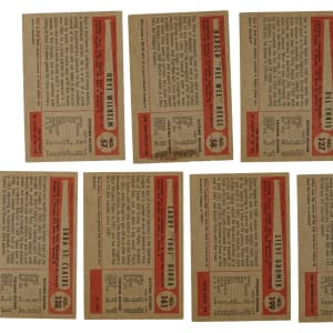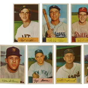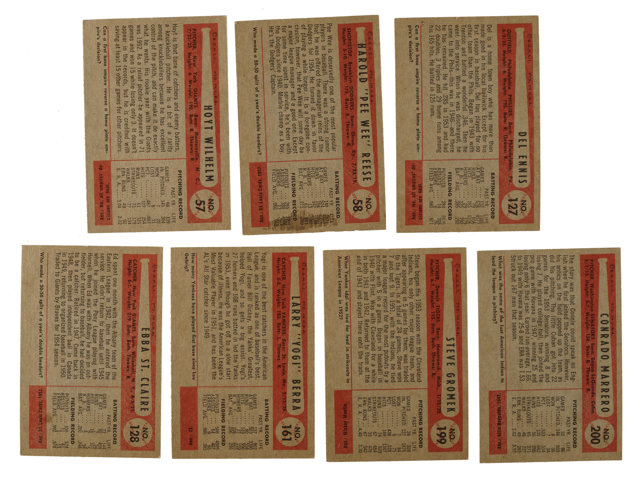 Collection of seven 1954 Bowman cards, featuring New York Giants, Brooklyn Dodgers and New York Yankees Hall of Famer Hoyt Wilhelm, Pee Wee Reese and Yogi Berra. Condition ranges from Vg to Nr/Mt (averaging Ex). This collection consists of the following: #57 Wilhelm (Vg+), 58 Reese (Ex), 127, 128, 161 Berra (Ex-Mt), 199, and 200. Total: 7 cards.