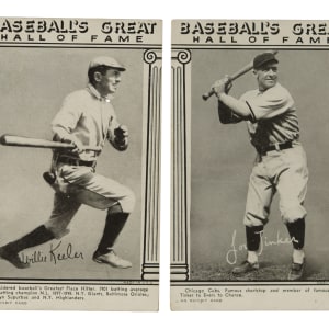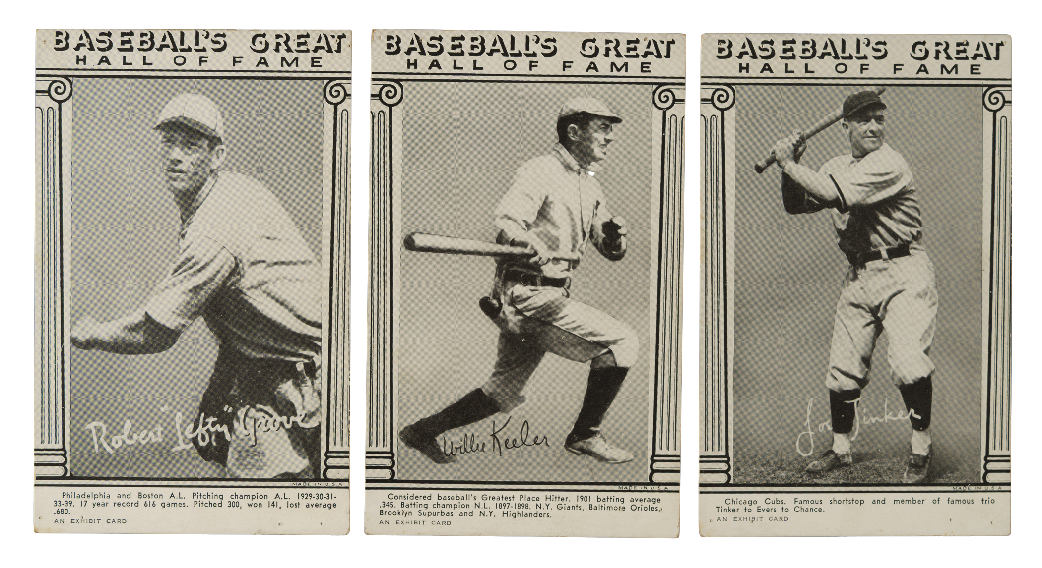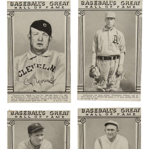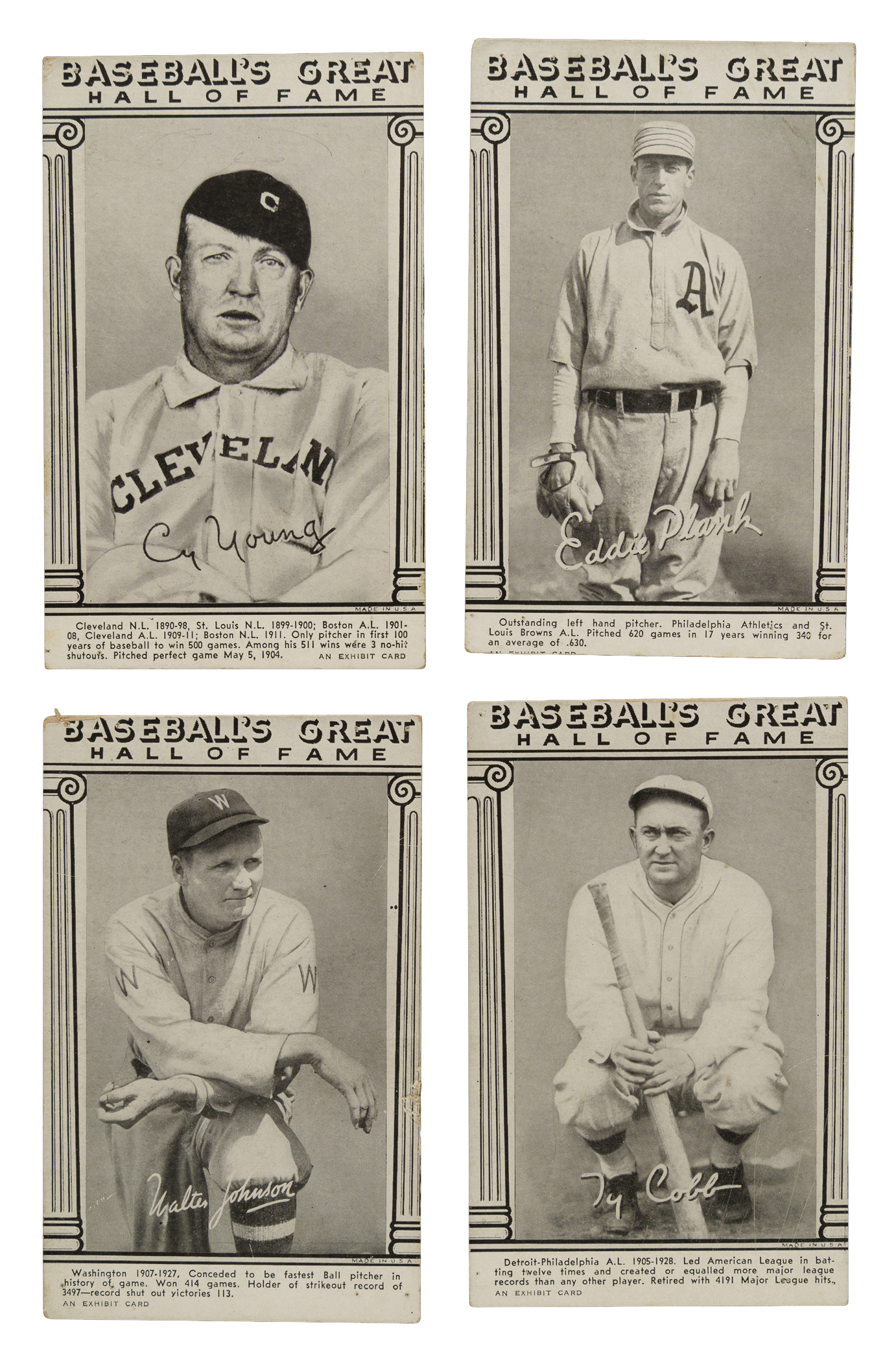 Collection of seven 1948 W464 Baseball's Great Hall of Fame Exhibits cards, featuring Detroit Tigers, Philadelphia Athletics and Cleveland Spiders Hall of Famers Ty Cobb, Lefty Grove and Cy Young. This collection consists of the following: Cobb (Pr due to pinholes), Grove (Pr due to pinholes), Johnson (Pr due to pinholes), Keeler (Pr due to pinholes), Plank (Pr due to pinholes), Tinker (Pr due to pinholes), and Young (Pr due to pinholes). Total: 7 cards.